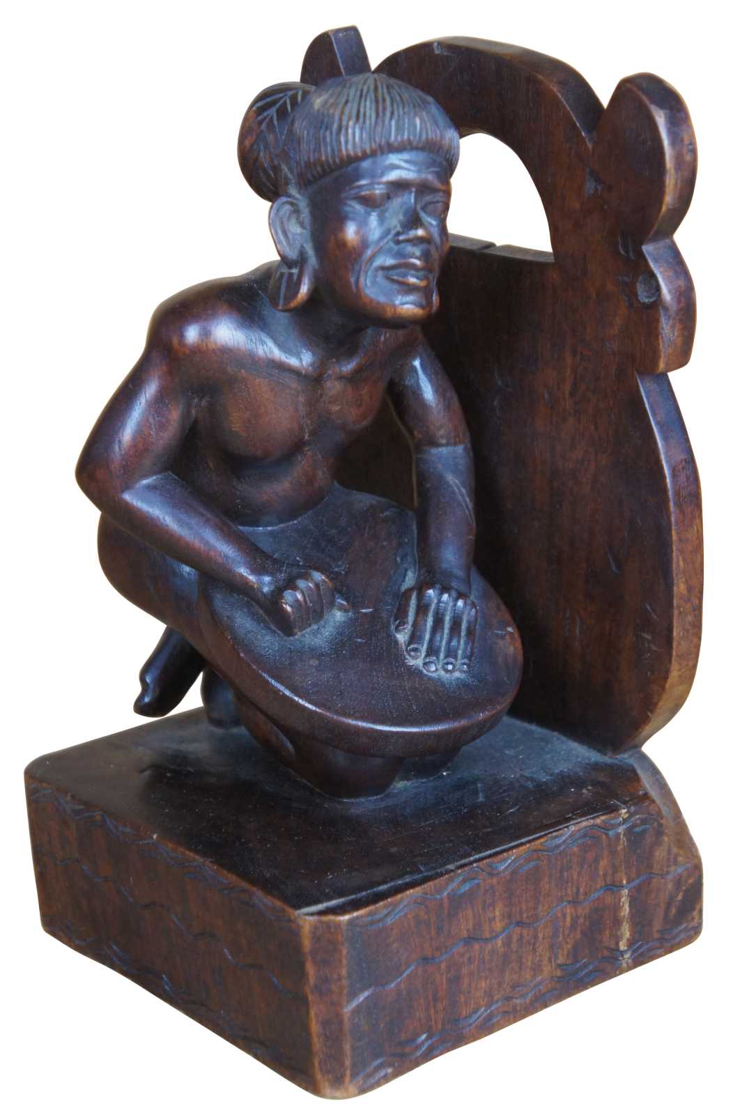 Mahogany carving of a Mayan drummer in the form of a bookend.