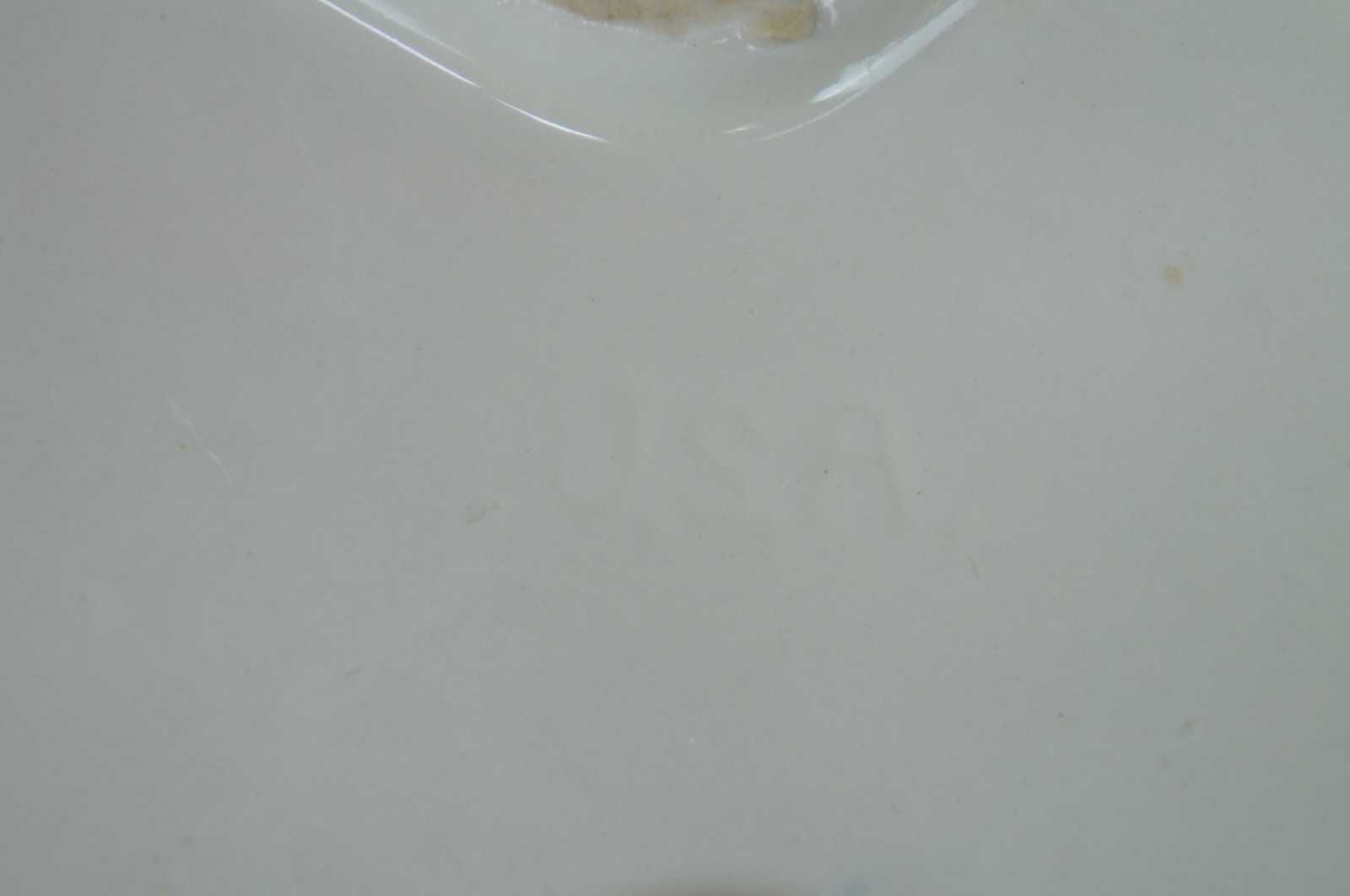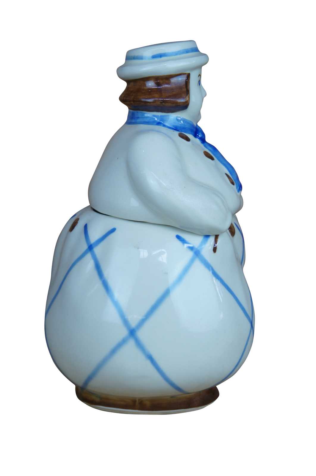 Vintage Dutch boy cookie jar made by Shawnee Pottery of Zanesville, Ohio, and is circa the 1940s. He is also known as “Happy Jack” and he is wearing a flat topped hat, a blue necktie and features a blue lattice pattern on his over-sized pants / breeches. He has brown hair, brown buttons and brown shoes