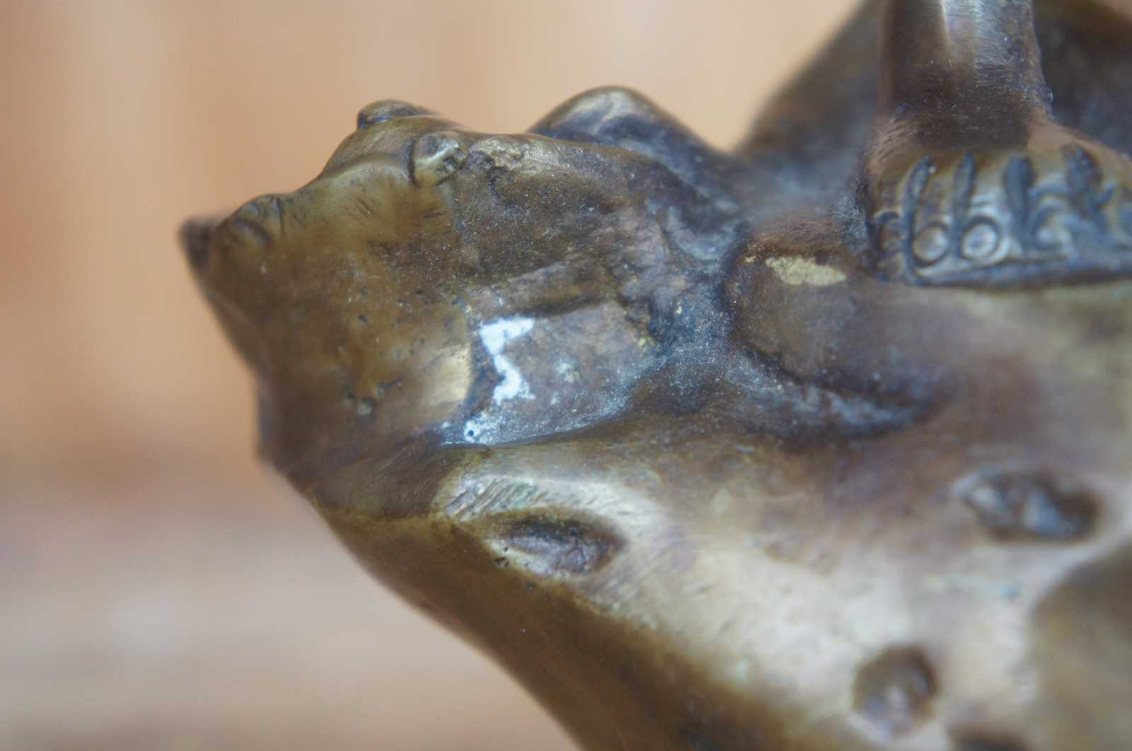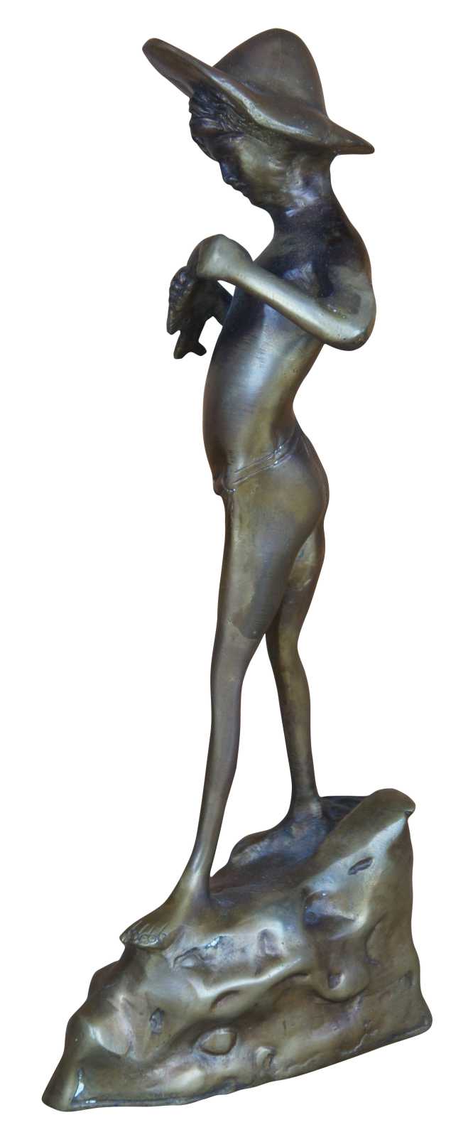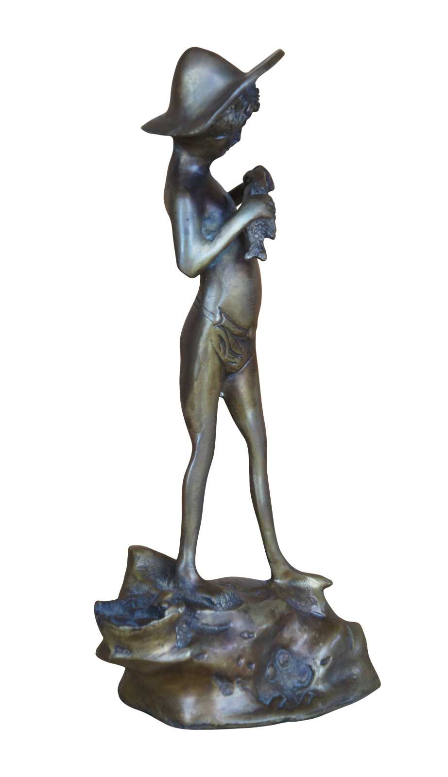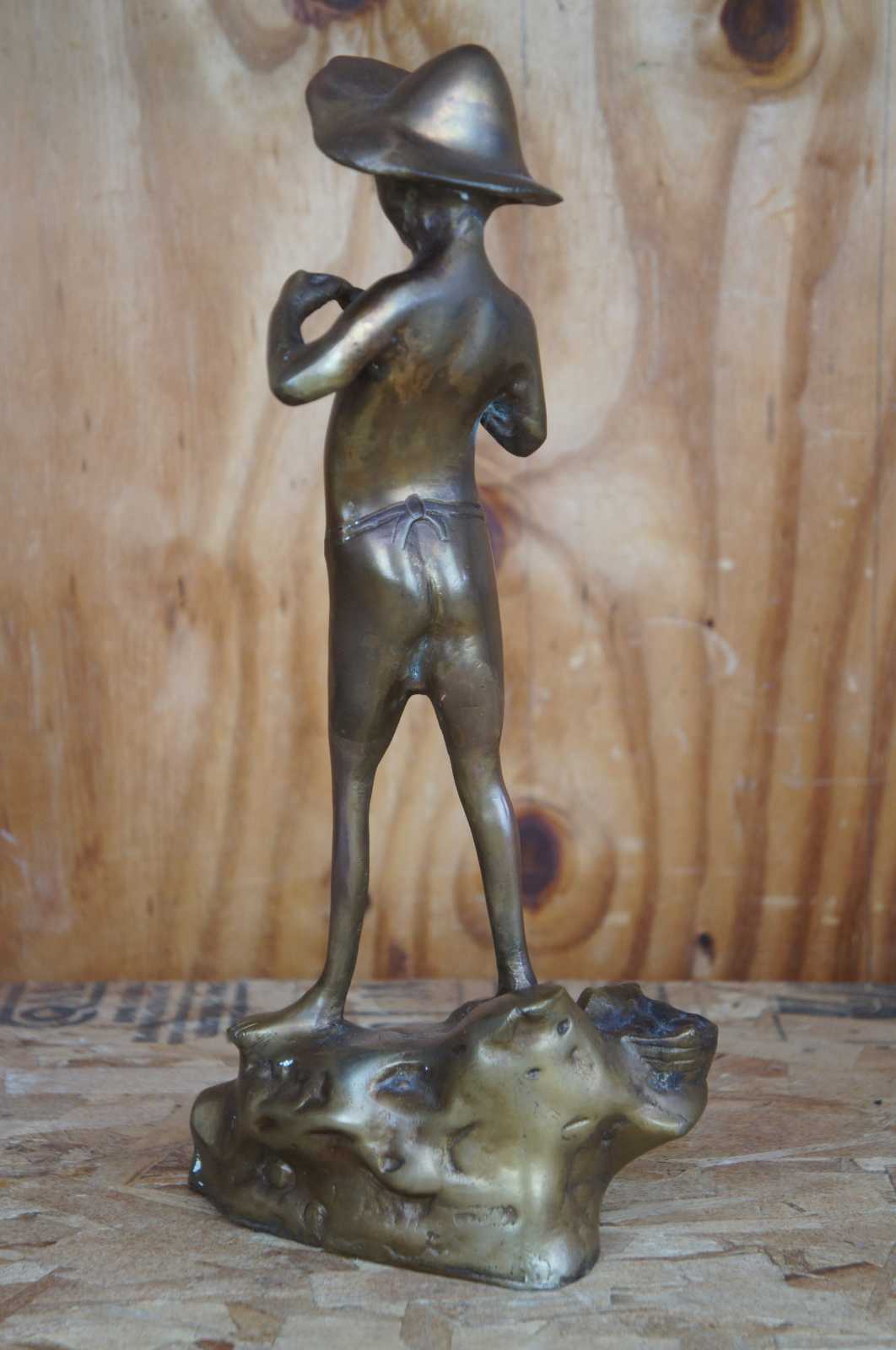 Vintage mid century bronze statue of a young boy or fisherman remeniscent of Huckleberry Finn. Features a boy standing on the rocks wearing makeshift clothing with a straw hat, inspecting his catch.