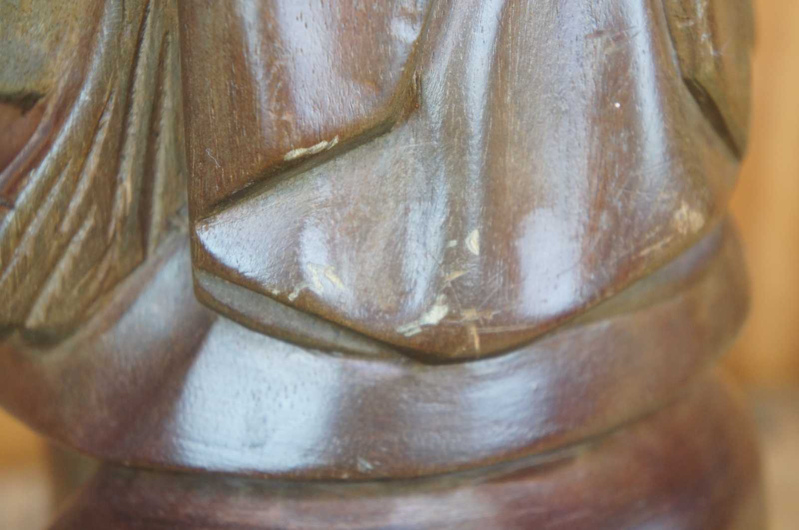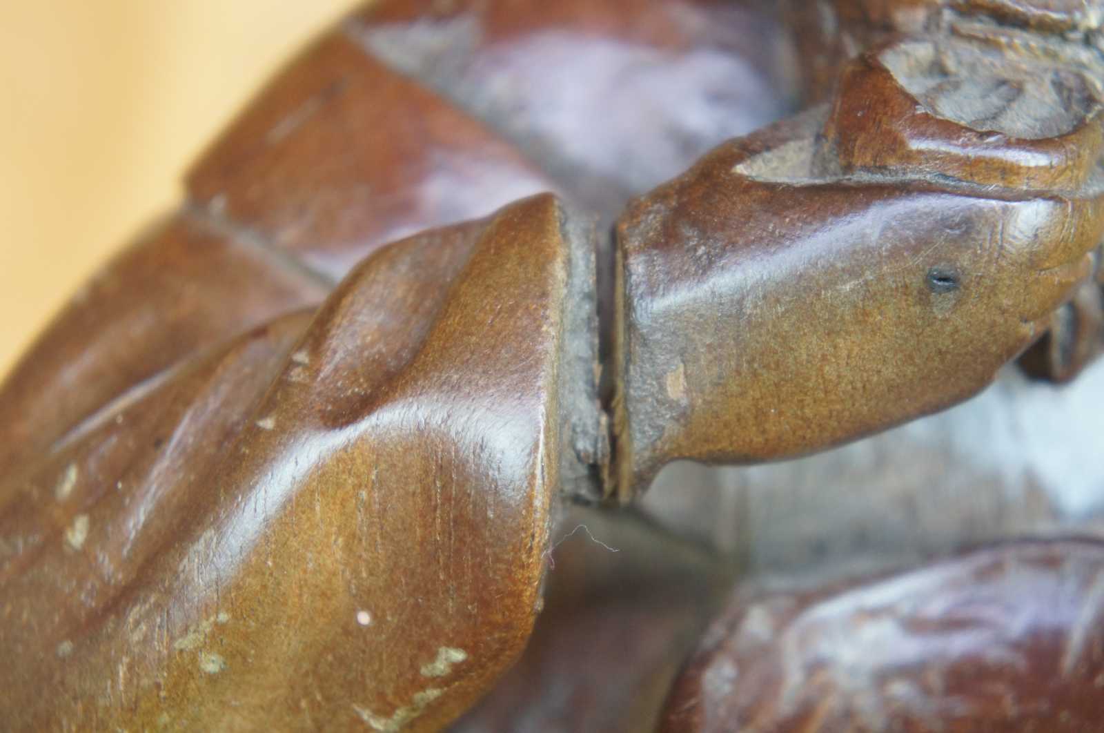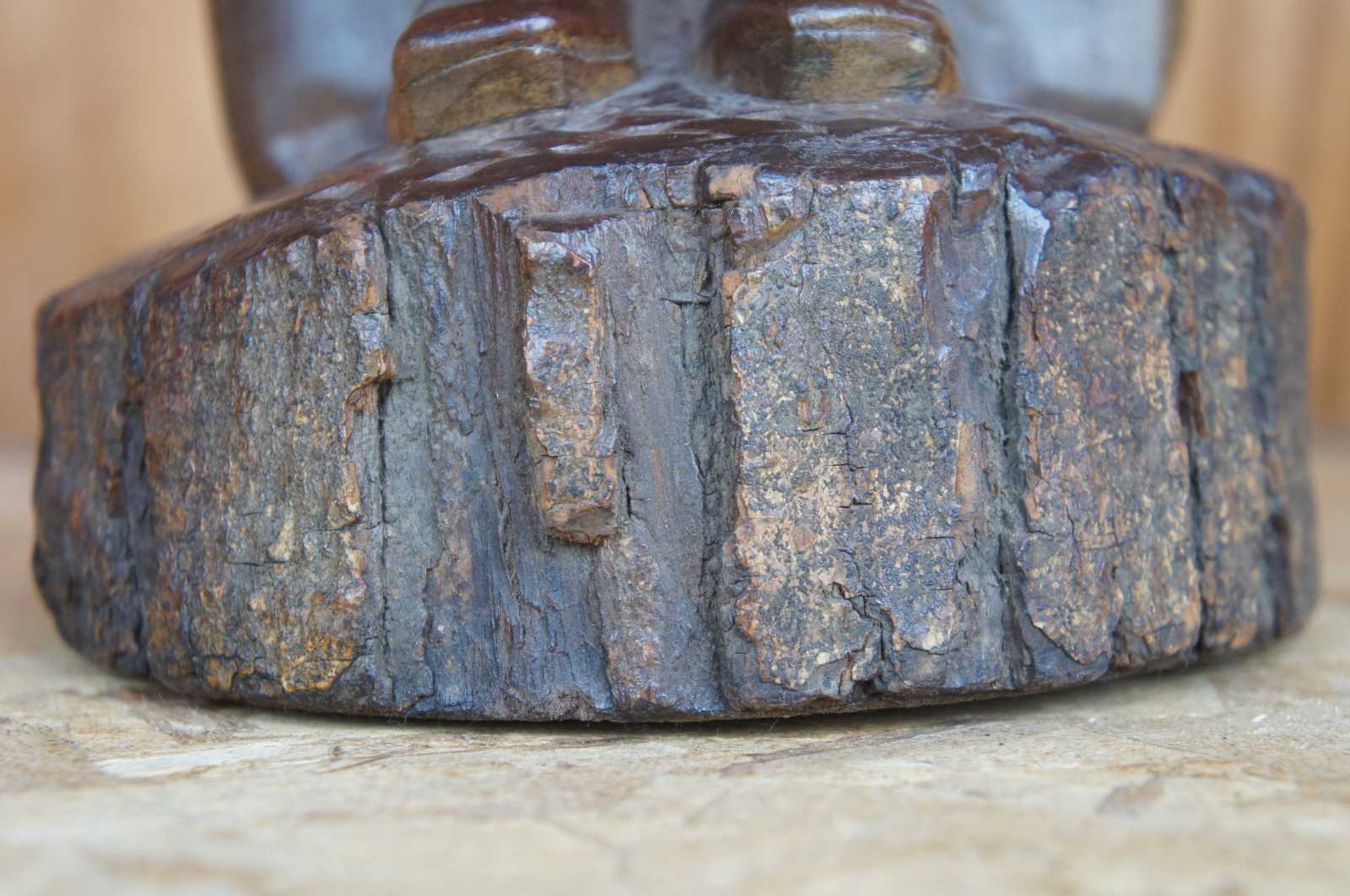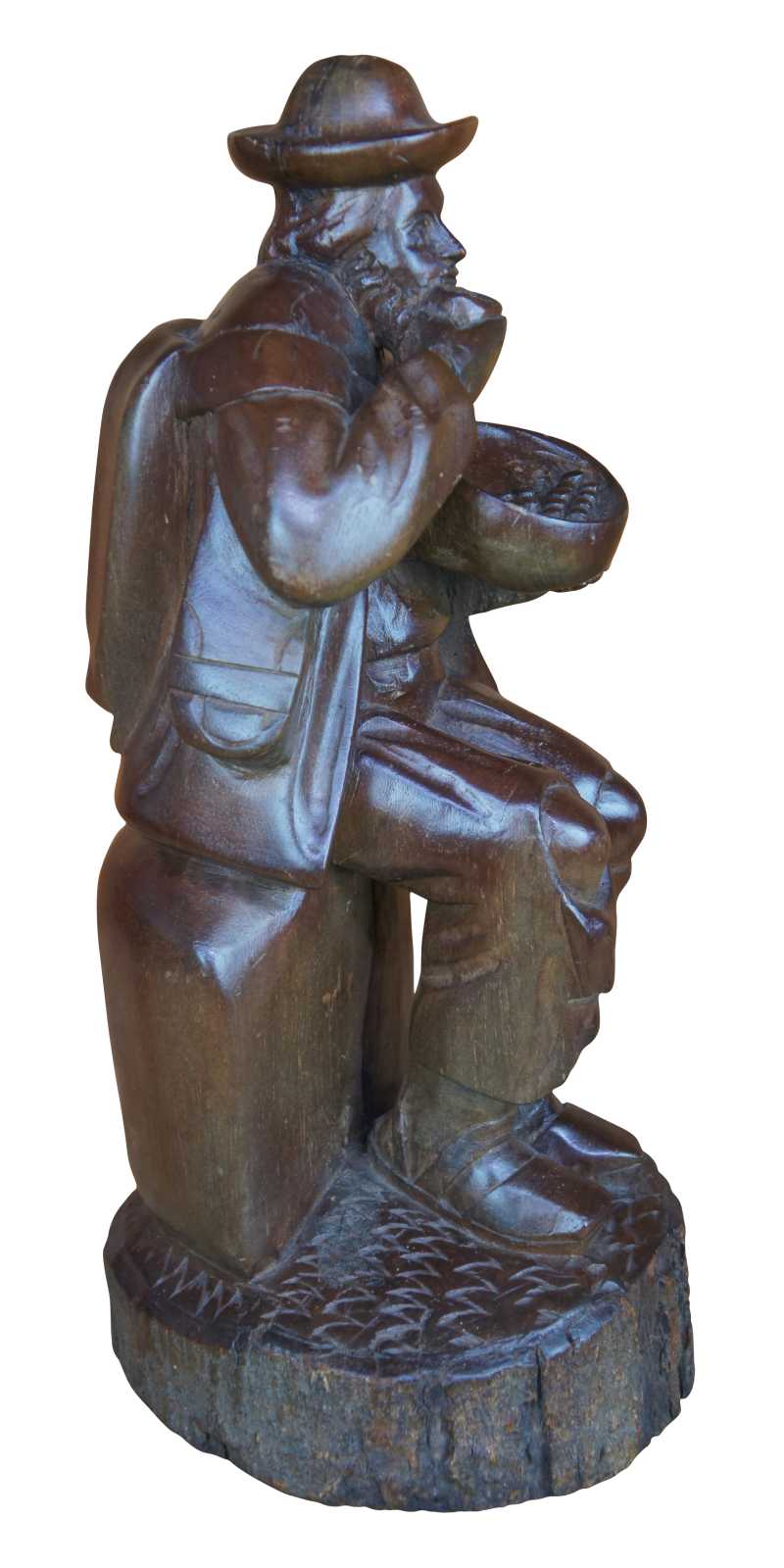 Vintage folk art carved sculpture of an old man eating a pie. Features live edge base that leads up to mountaineer carving.