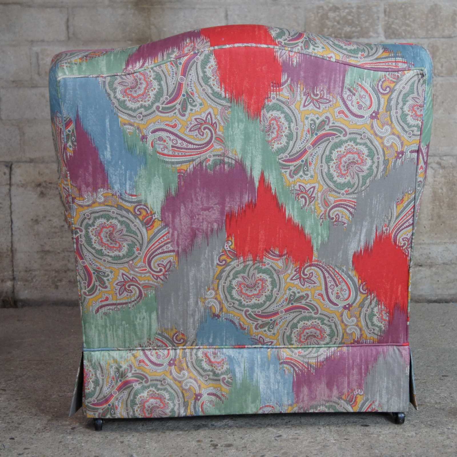 Two vintage mid century arm chairs. Featuring a camelback, modern paisley fabric with walnut legs and castors.