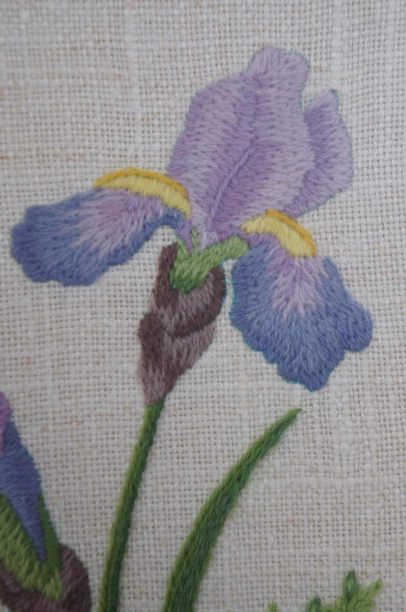 Set of three 1960’s folk art framed textile embroidered needlepoint flowers – odalisque tulip, blue flag iris, and tiger lily. Circa 1968.