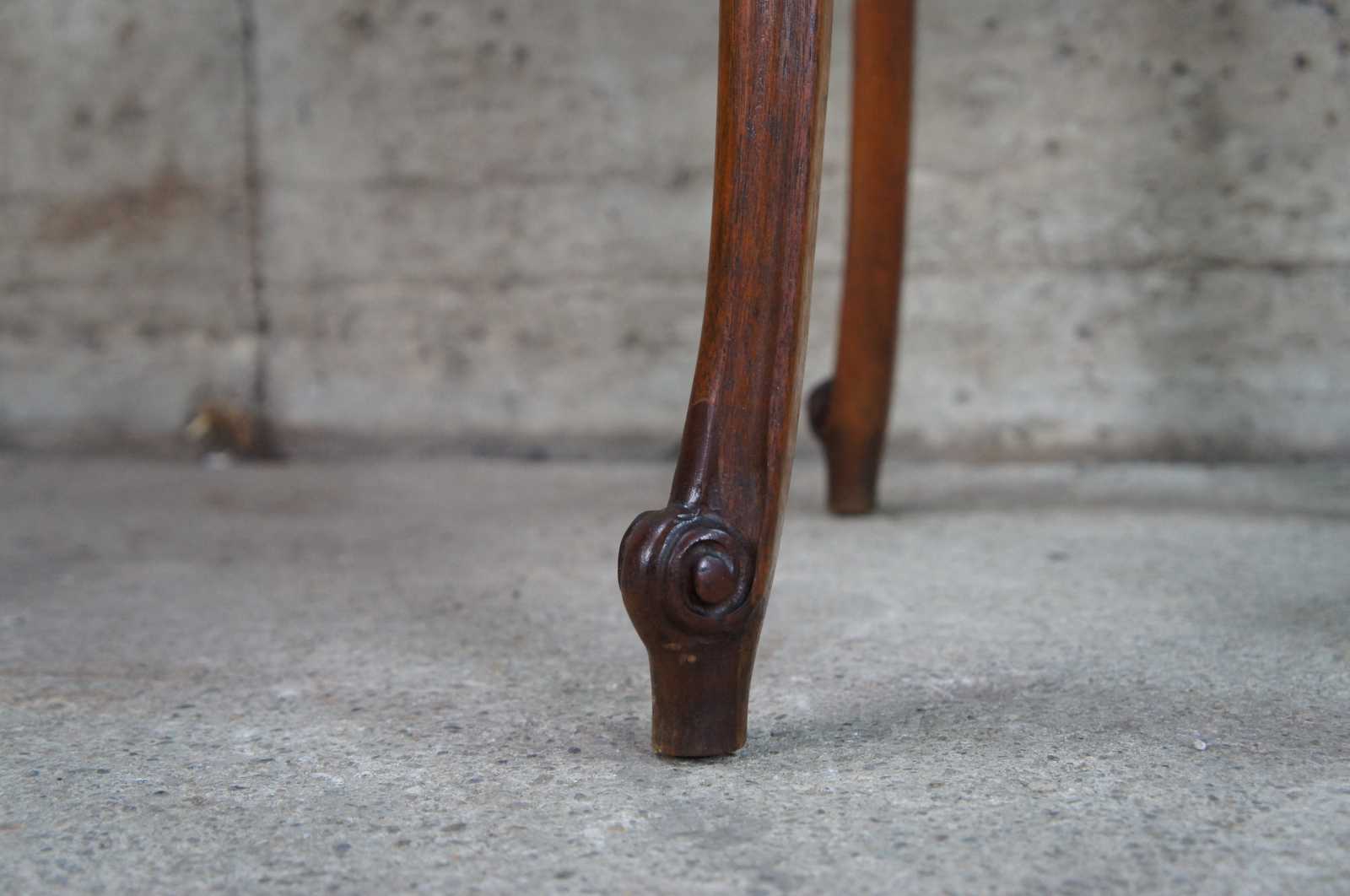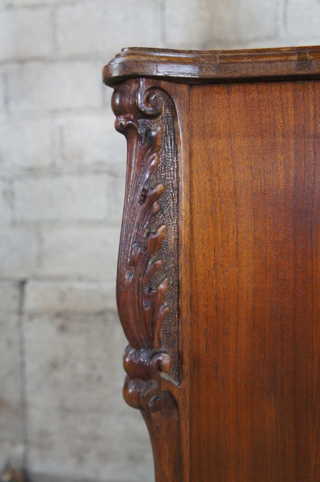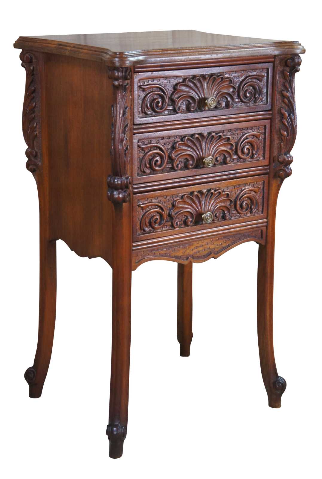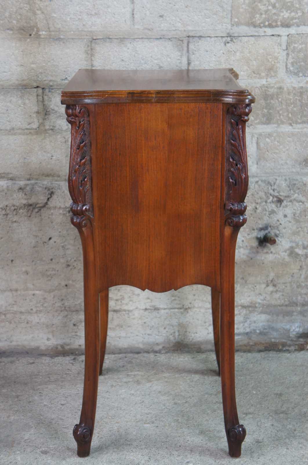 Antique French nightstand or side table. Made of walnut featuring three drawers with shell and cartouche carvings between thick acanthus accents, and cabriole legs leading to scrolled feet.
