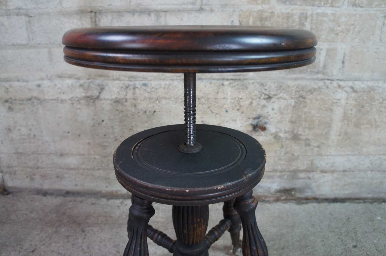 Antique Victorian adjustable height piano stool or seat. Made of mahogany featuring round form with reeded and turned columns capped with ball and claw feet.