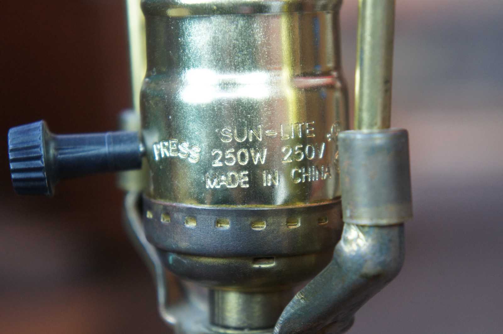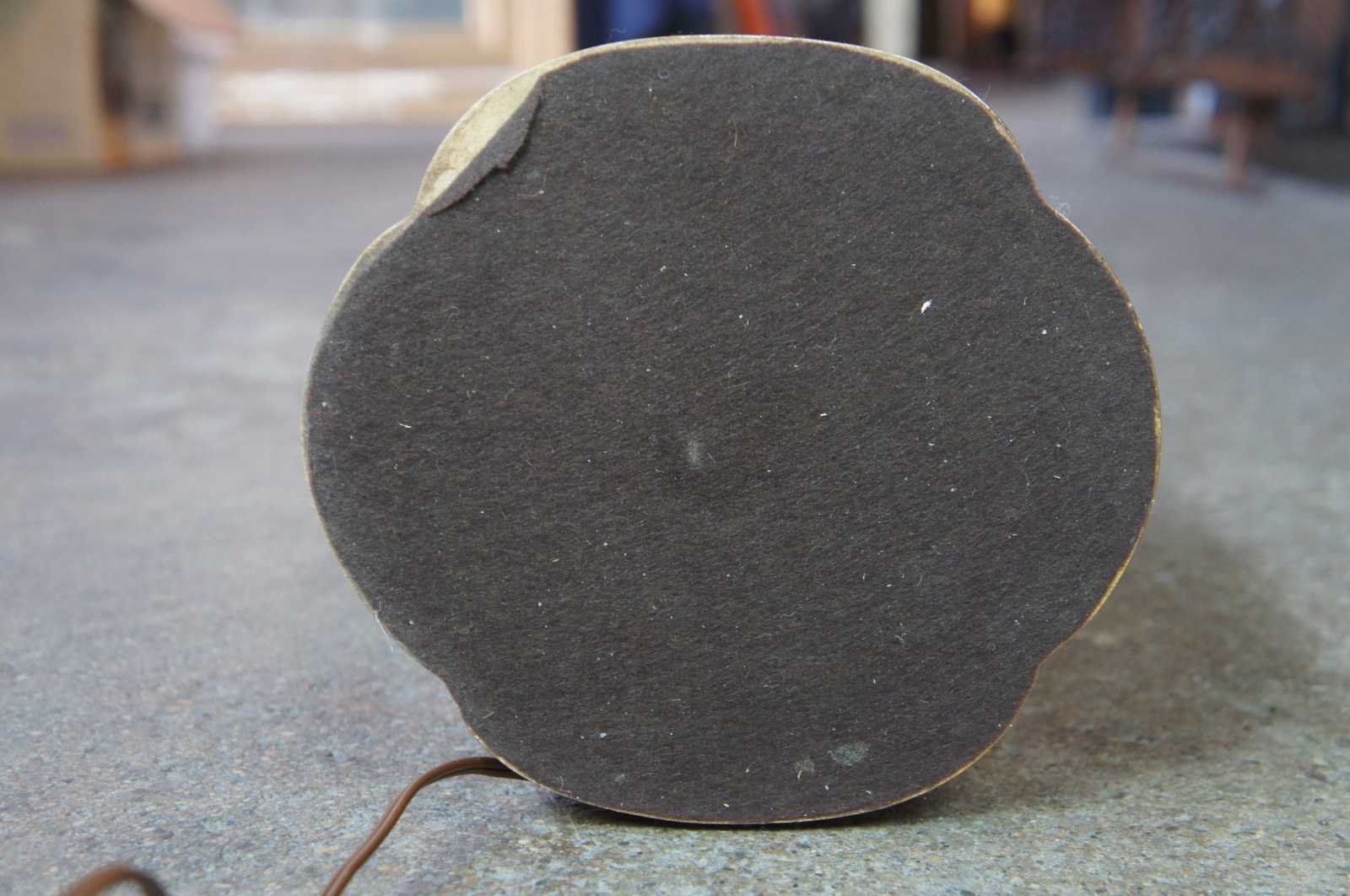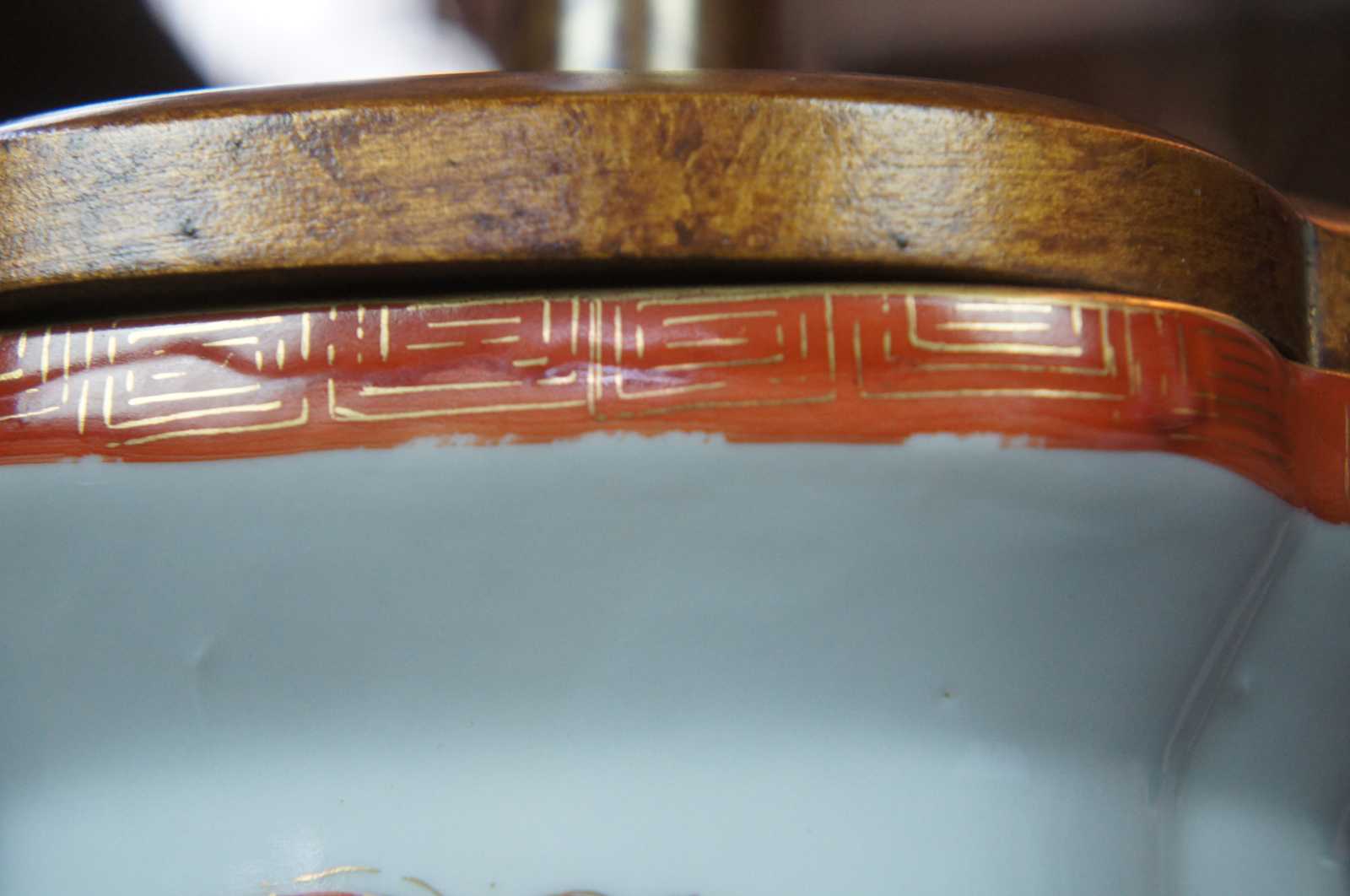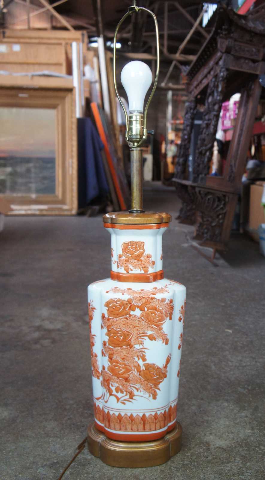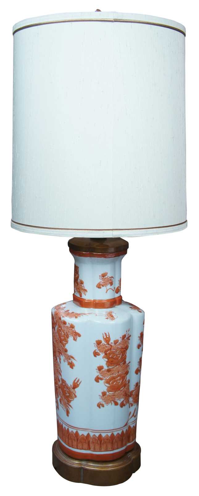 Mid Century Chinese mantel urn lamp. Made of porcelain featuring scalloped form with a coral colored field of roses and barrel shade.