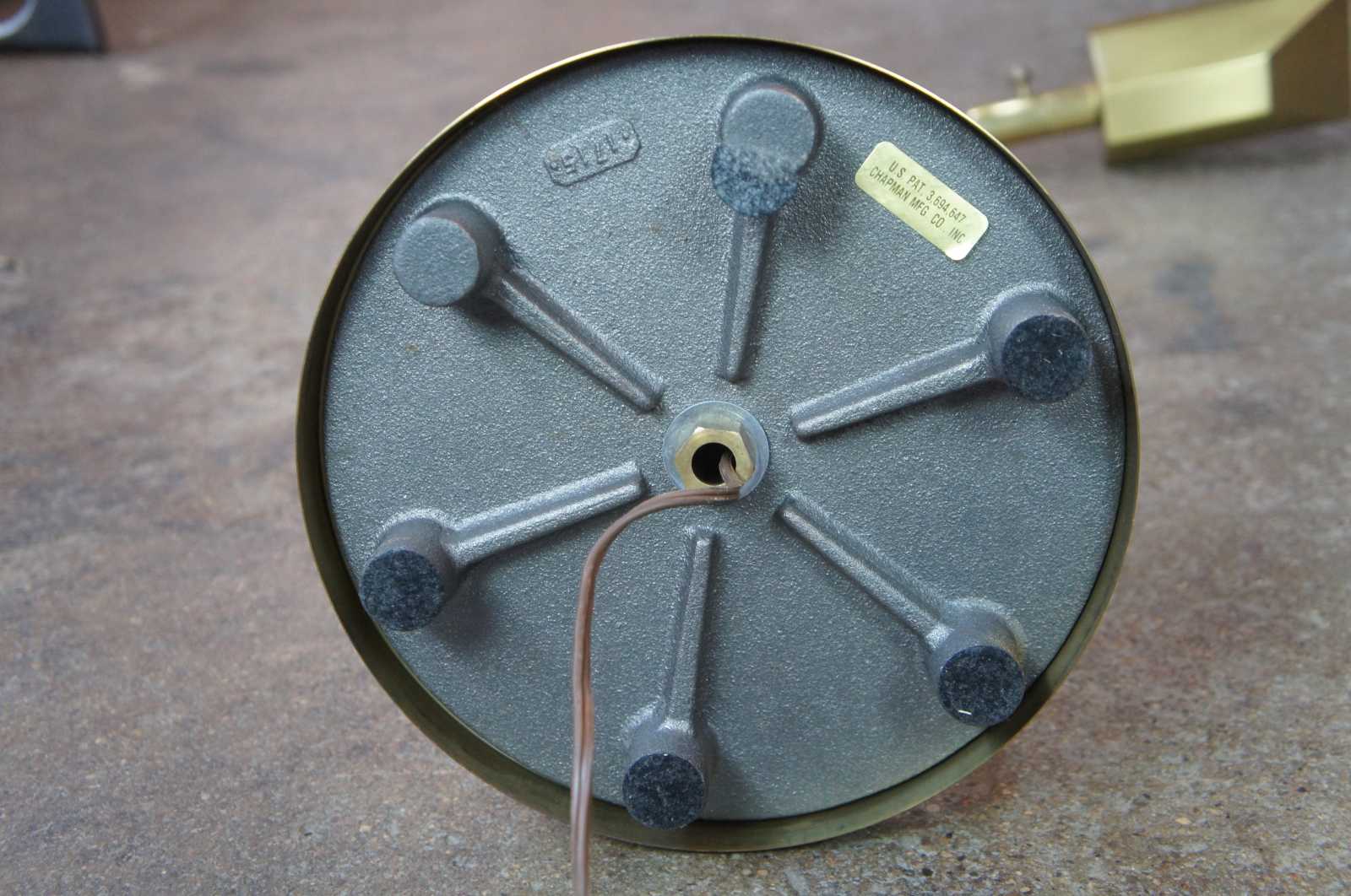 1980 Chapman Mfg Co adjustable floor lamp. Made of brass featuring round base with triangular geometric form shade.