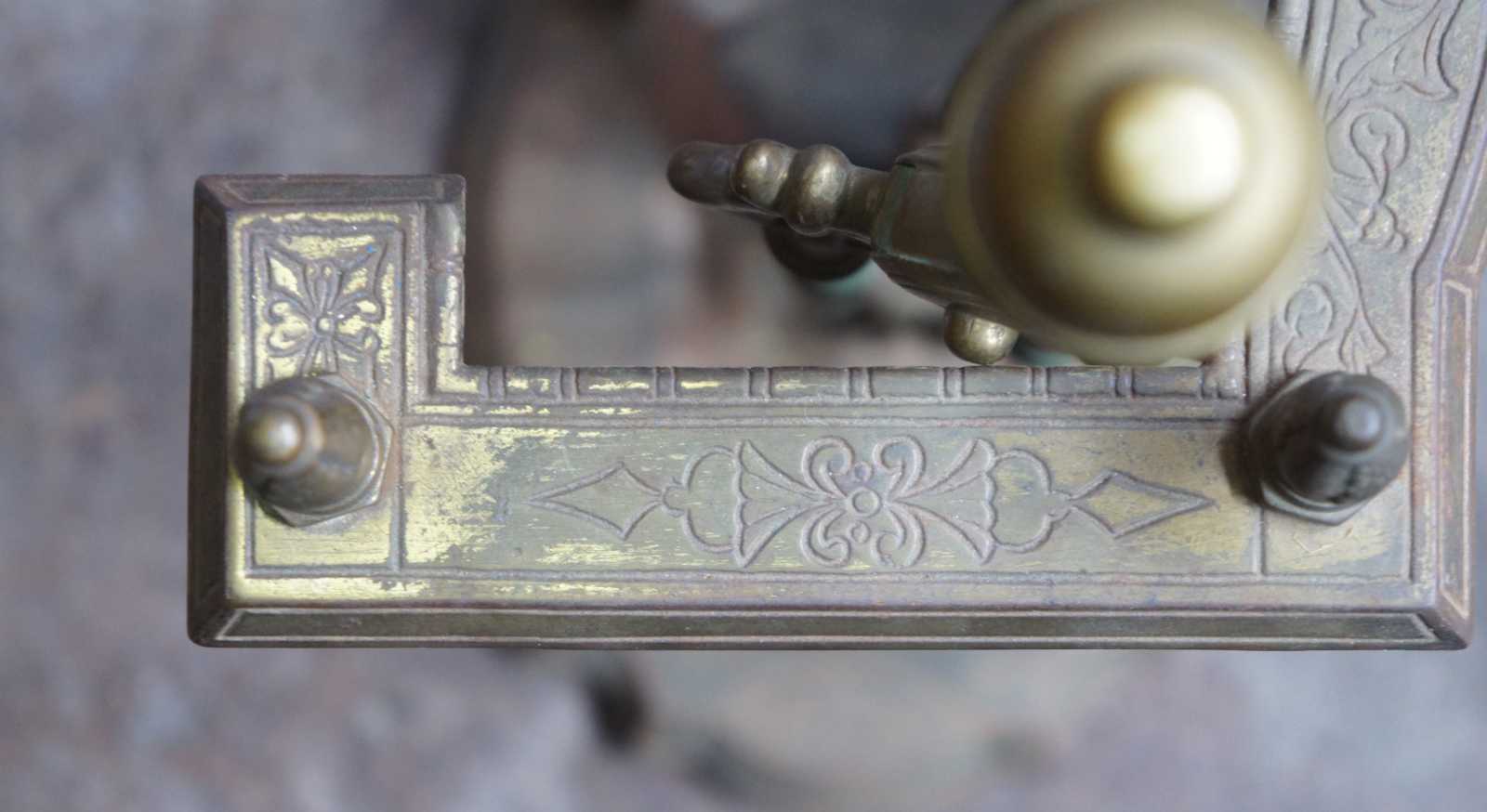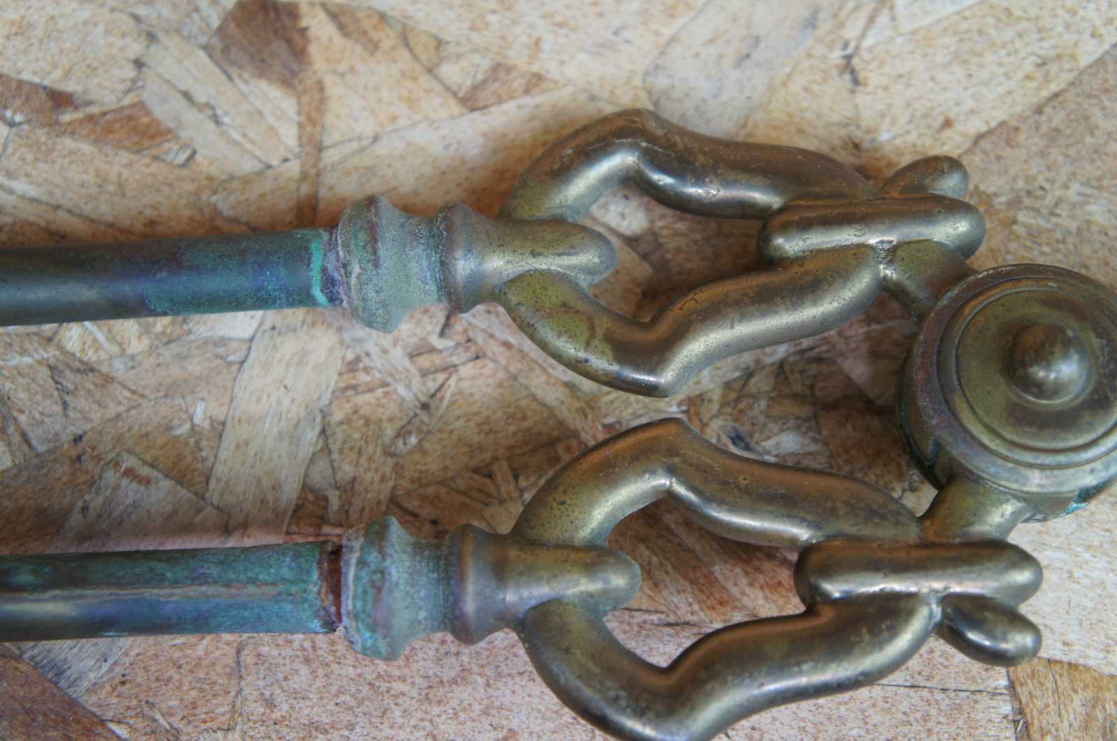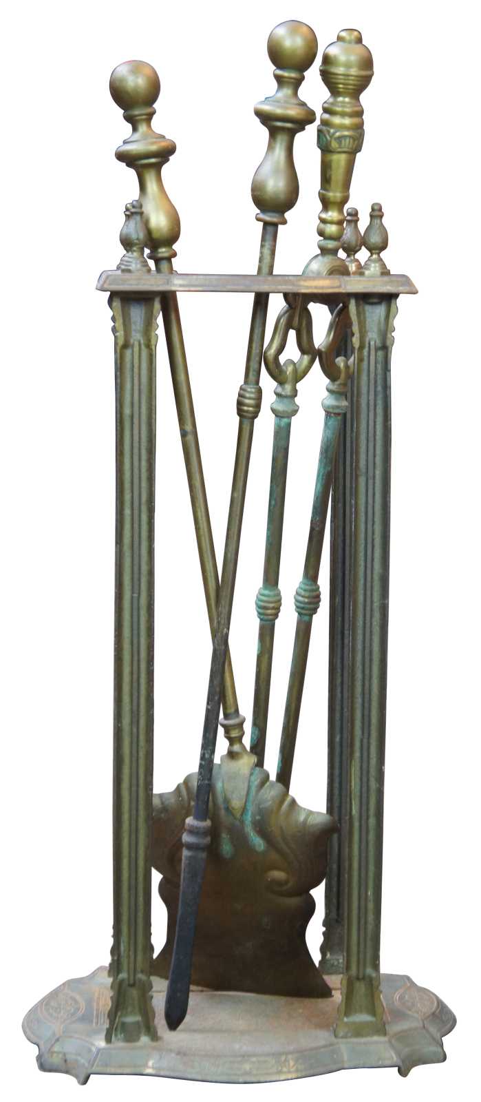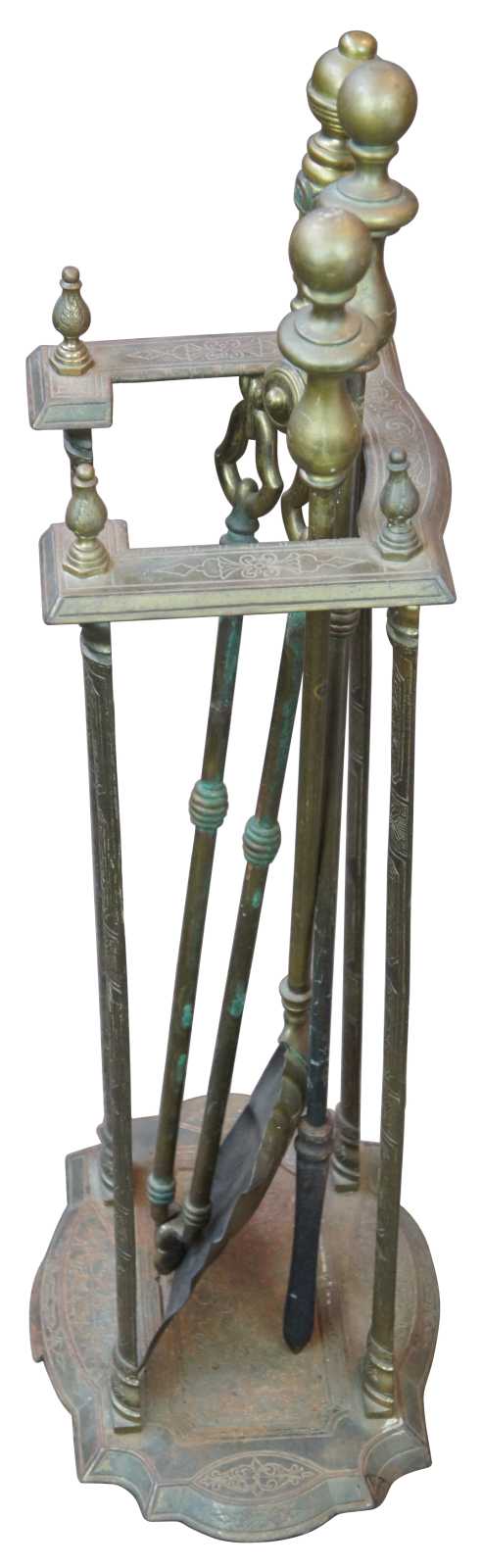 Antique Victorian hearthware fireplace tools and stand. Made of brass featuring ornate scroll work with scalloped base and shaped upper gallery.