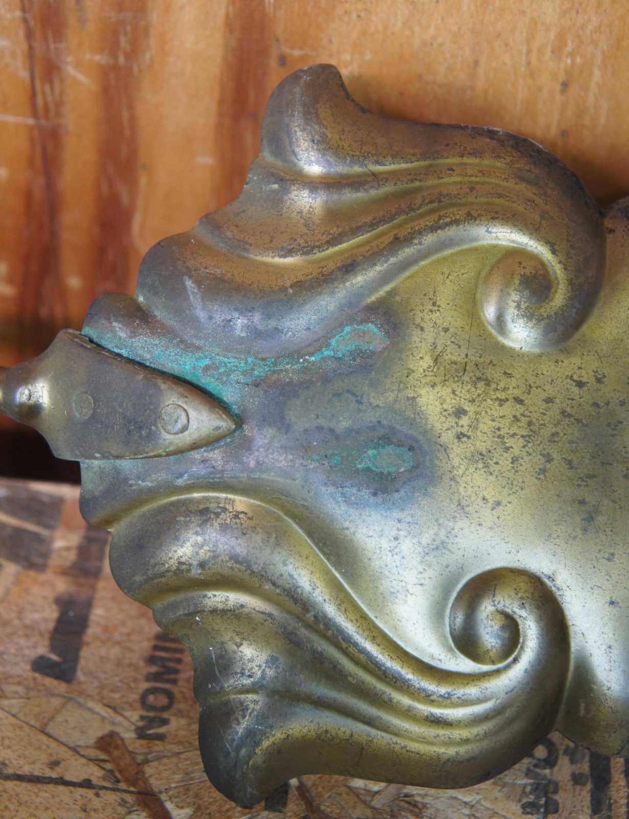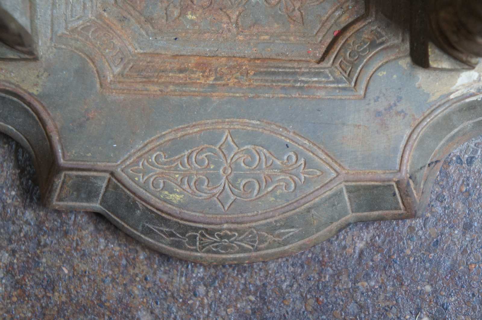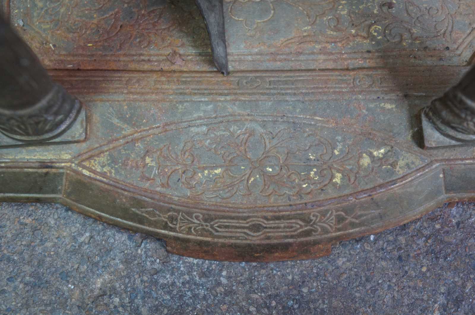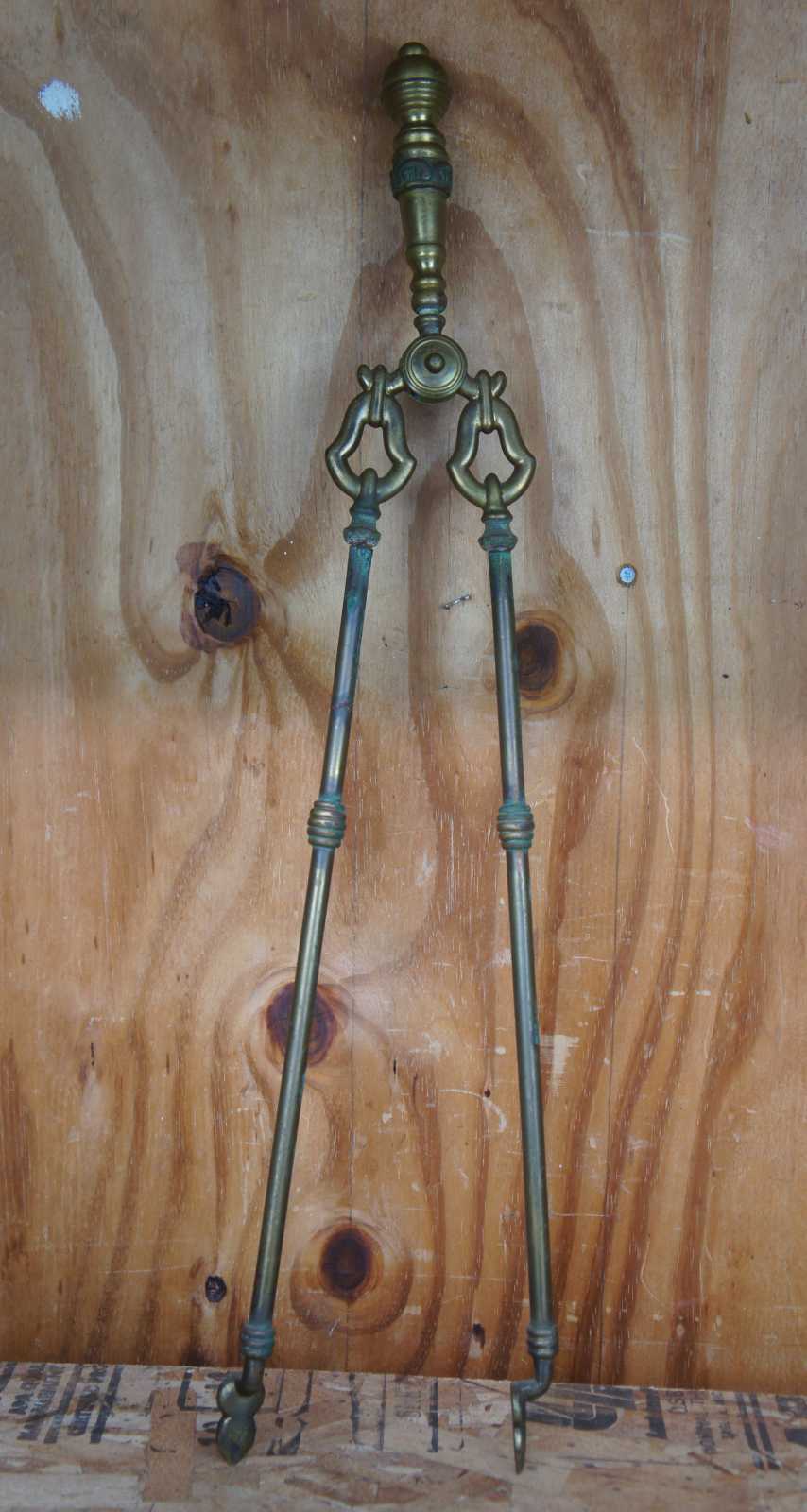 Antique Victorian hearthware fireplace tools and stand. Made of brass featuring ornate scroll work with scalloped base and shaped upper gallery.