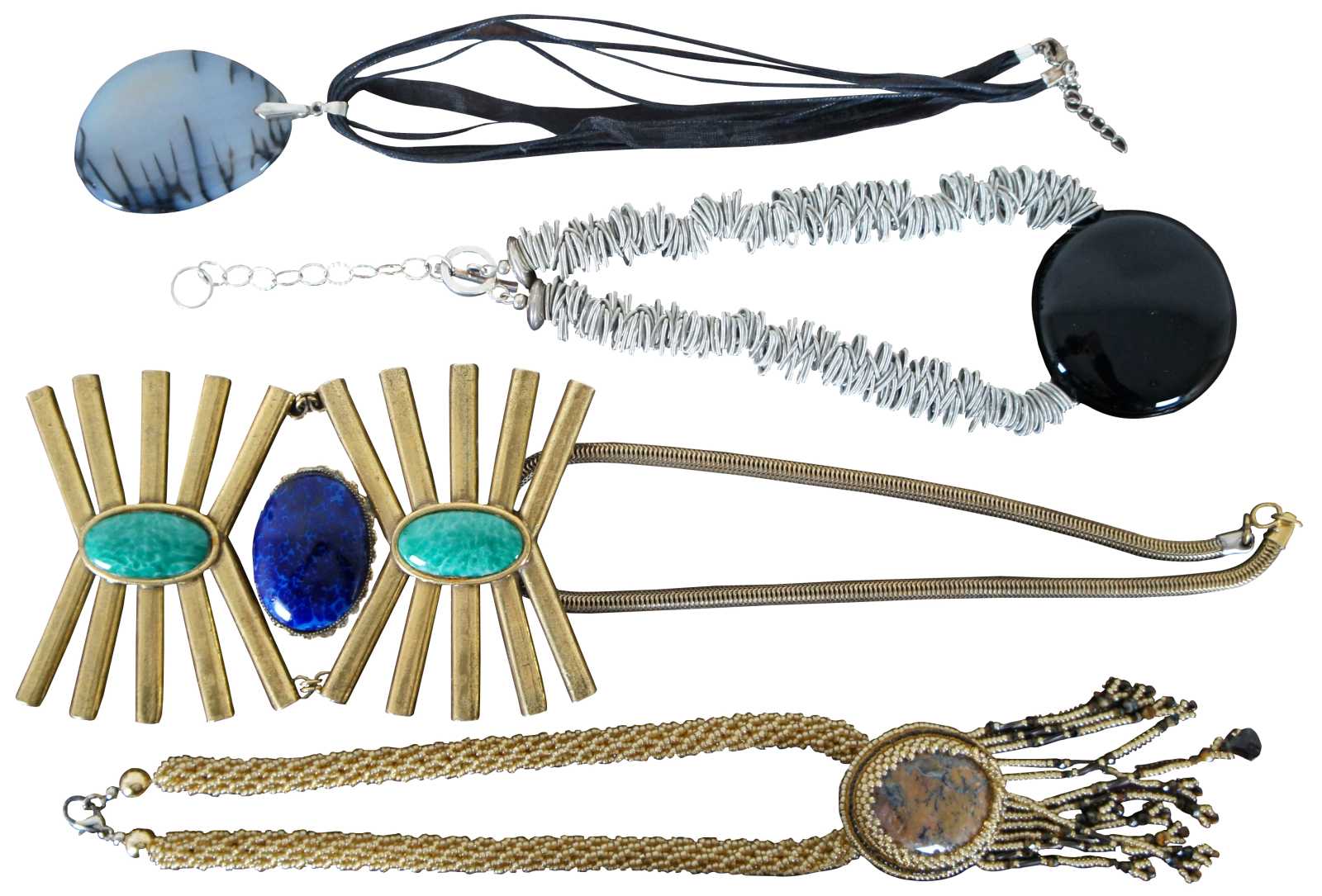 Lot of four vintage pendant necklaces on a variety of chain materials and polished stone, including lapis lazuli, amazonite, obsidian and agate.