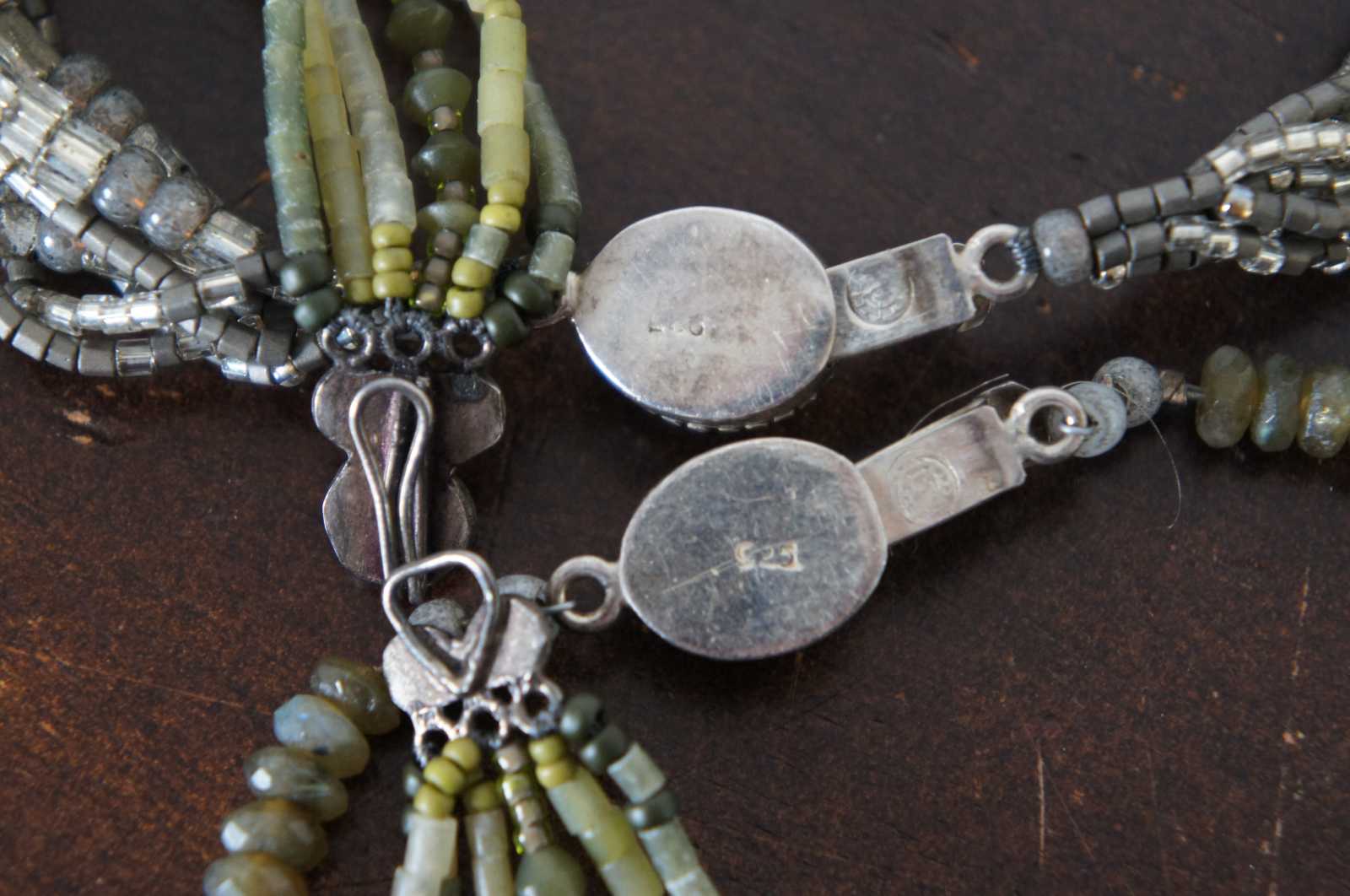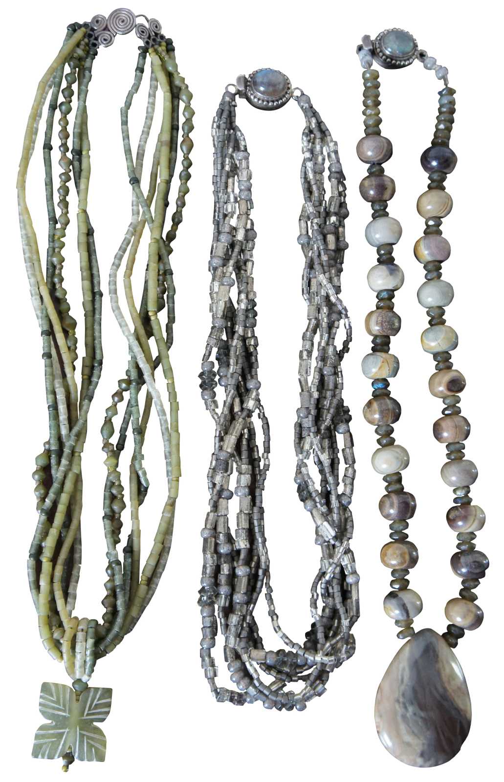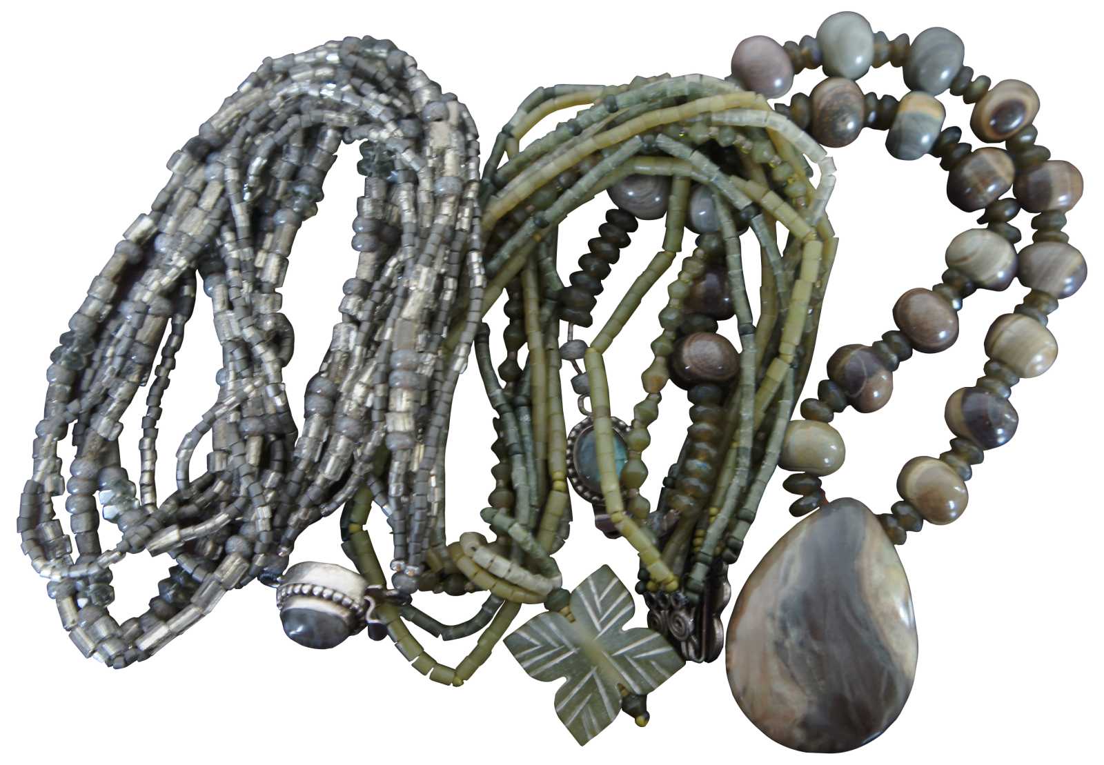 Lot of three vintage multi and single strand natural stone necklaces featuring faceted gemstones and beads with unique clasps and pendants.