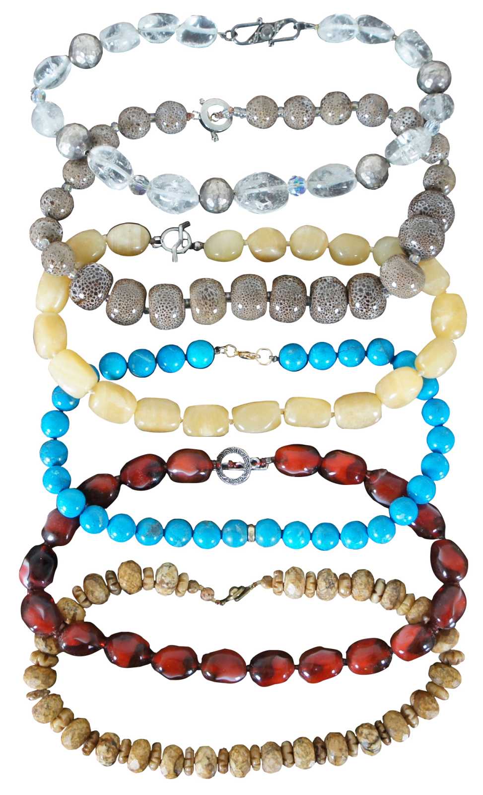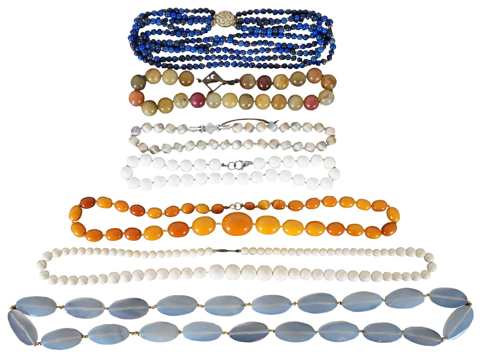 Lot of thirteen vintage necklaces in various colors and lengths, featuring Butterscotch Bakelite, Lapis Lazuli, Turquois, Sterling Silver 925 ect.
