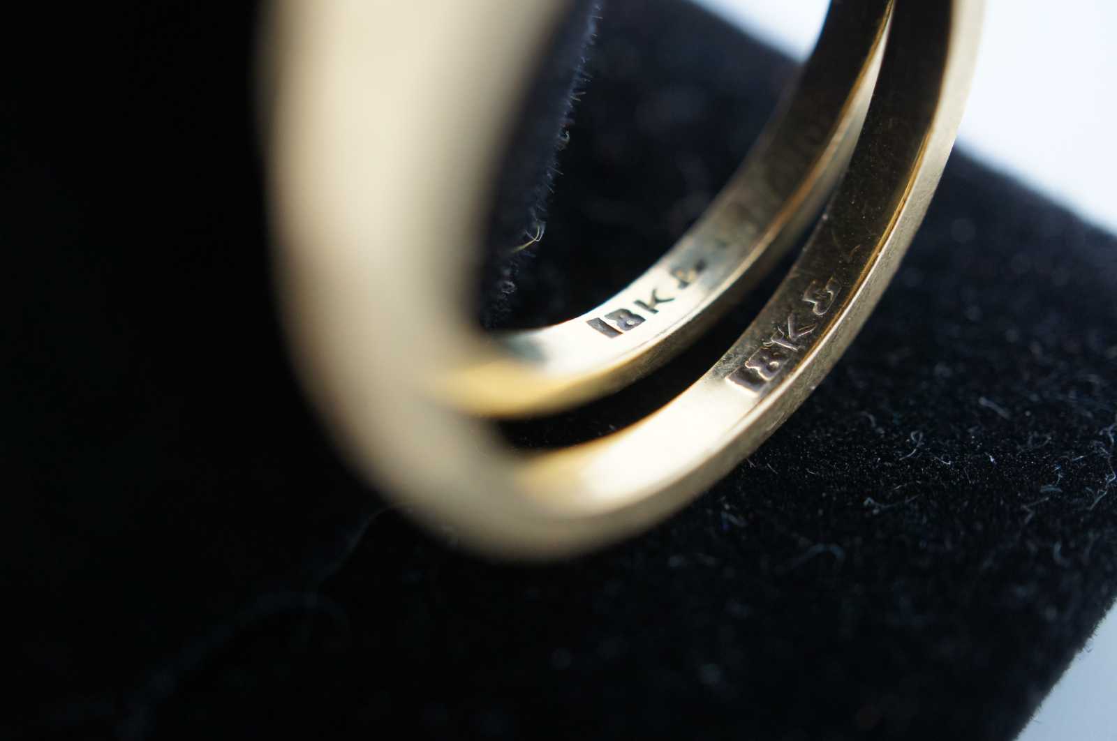 Two vintage 18k yellow gold Art Deco style rings featuring round form with textured design.