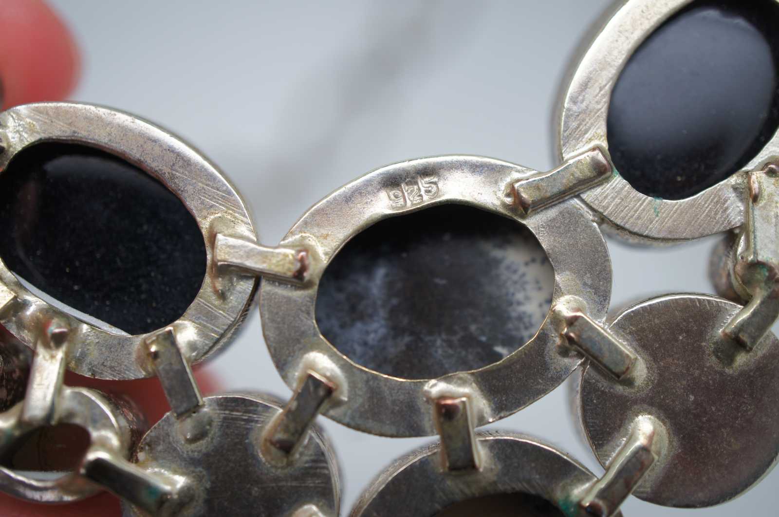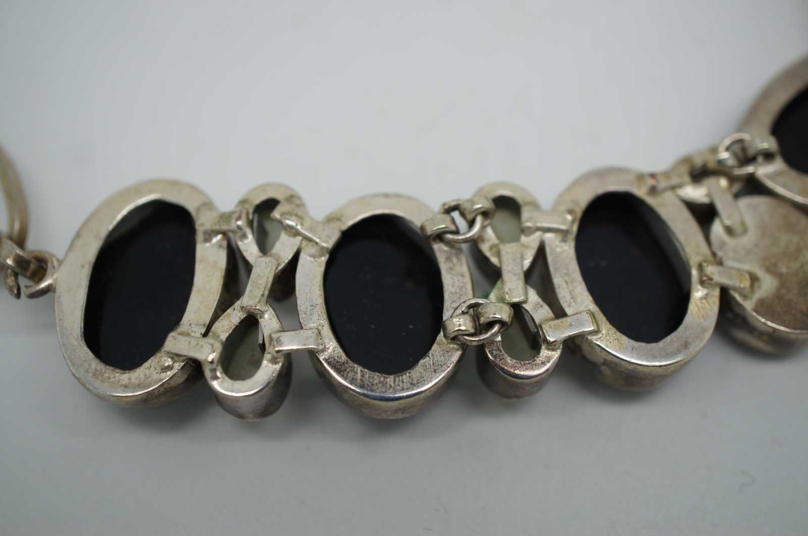 Vintage modernist collar necklace of multi colored gemstones set in sterling silver. Opal, Quarts, Onyx.