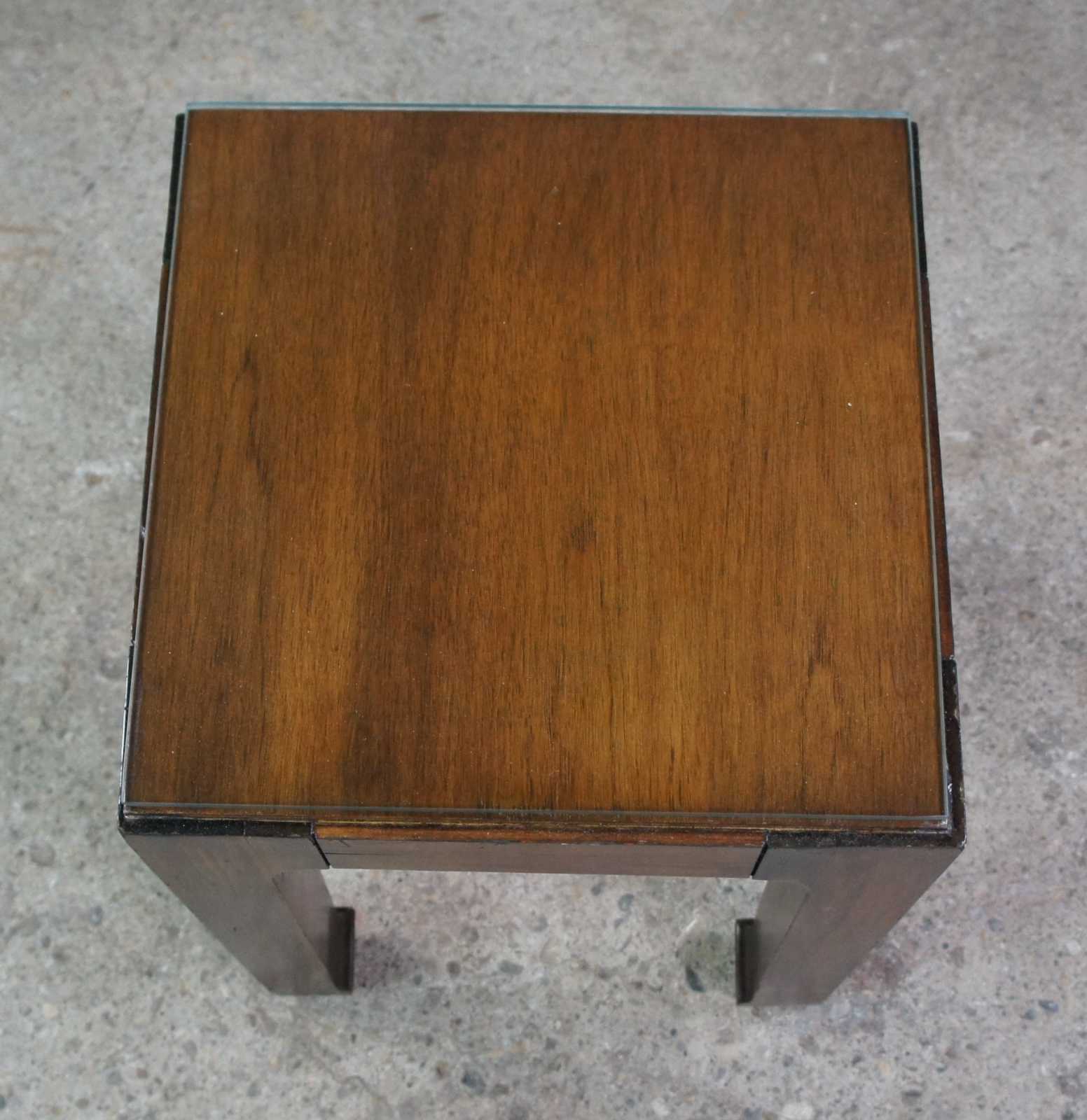 1980s chinoiserie Lane Altavista side table. Made of walnut featuring square form with chinoiserie style legs and glass top. Manufactured on February, 2nd 1980. Style No. 1024 66