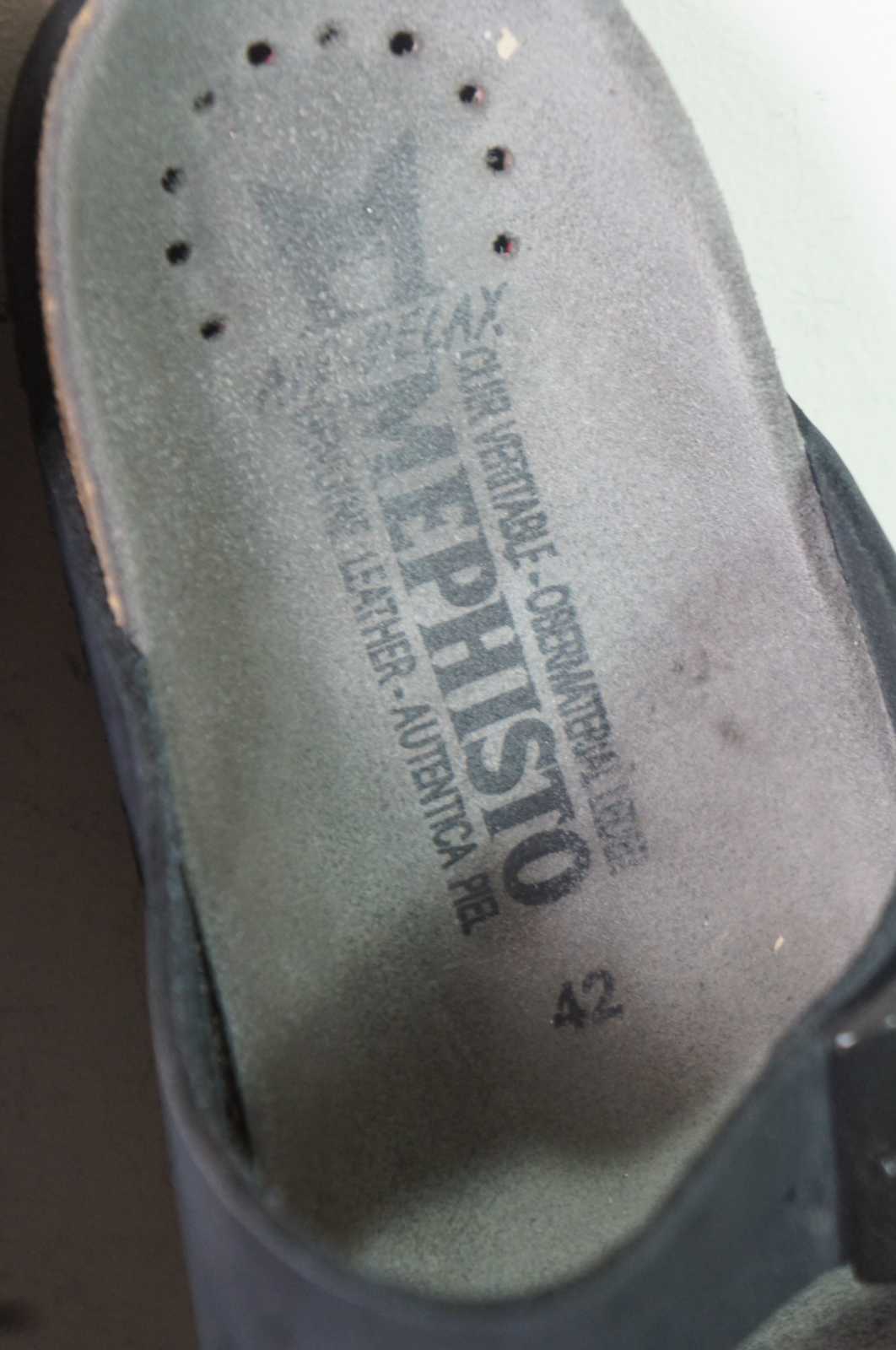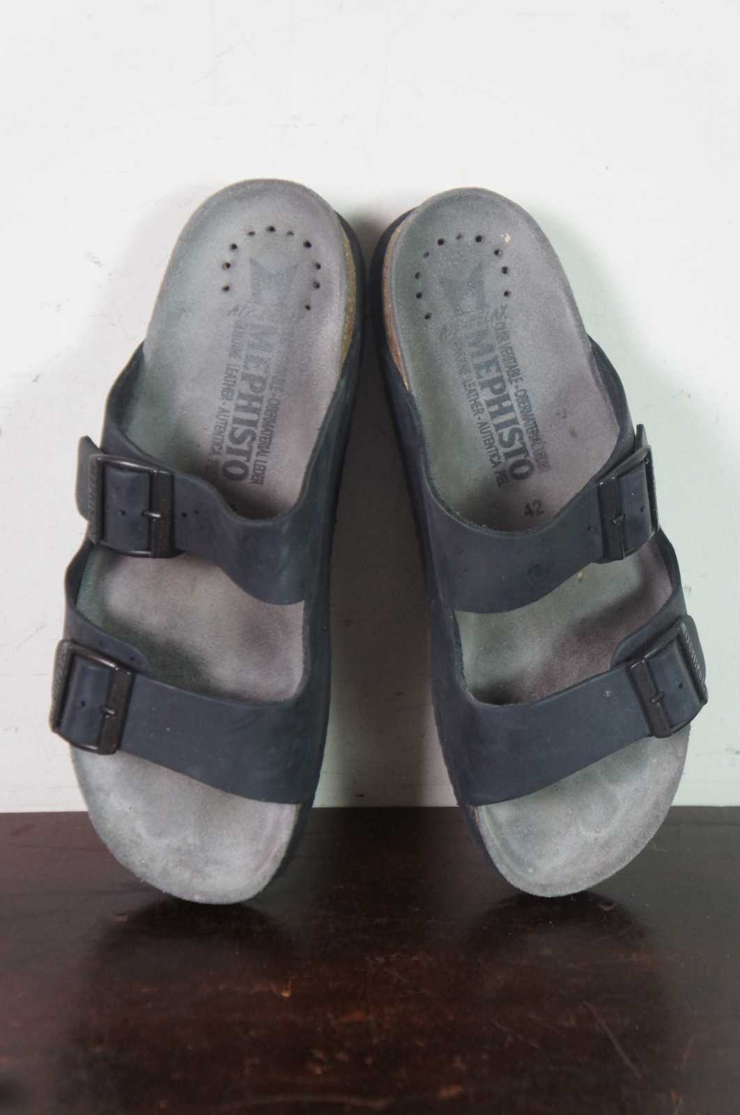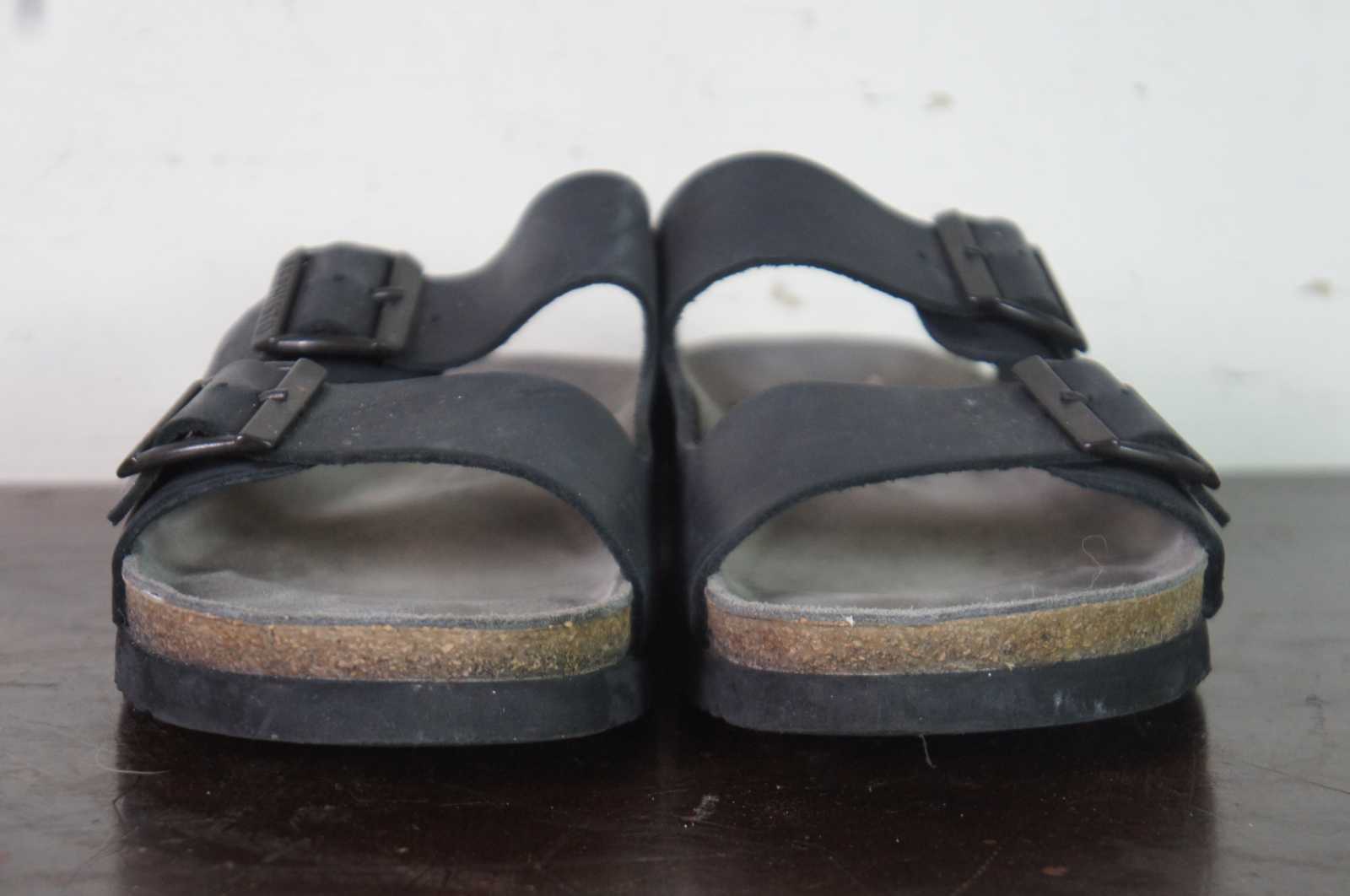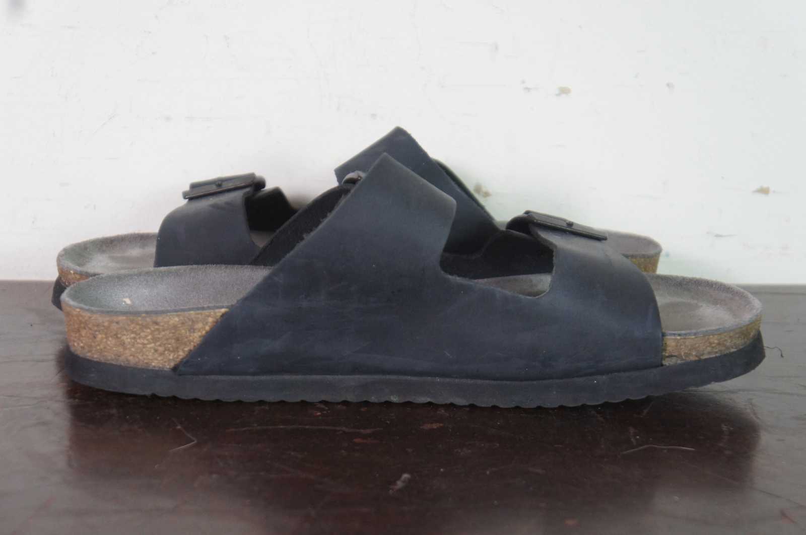 Vintage Mephisto Nerio black Scratch 3400 Birkenstock style slide sandals with two buckles and cork sole.