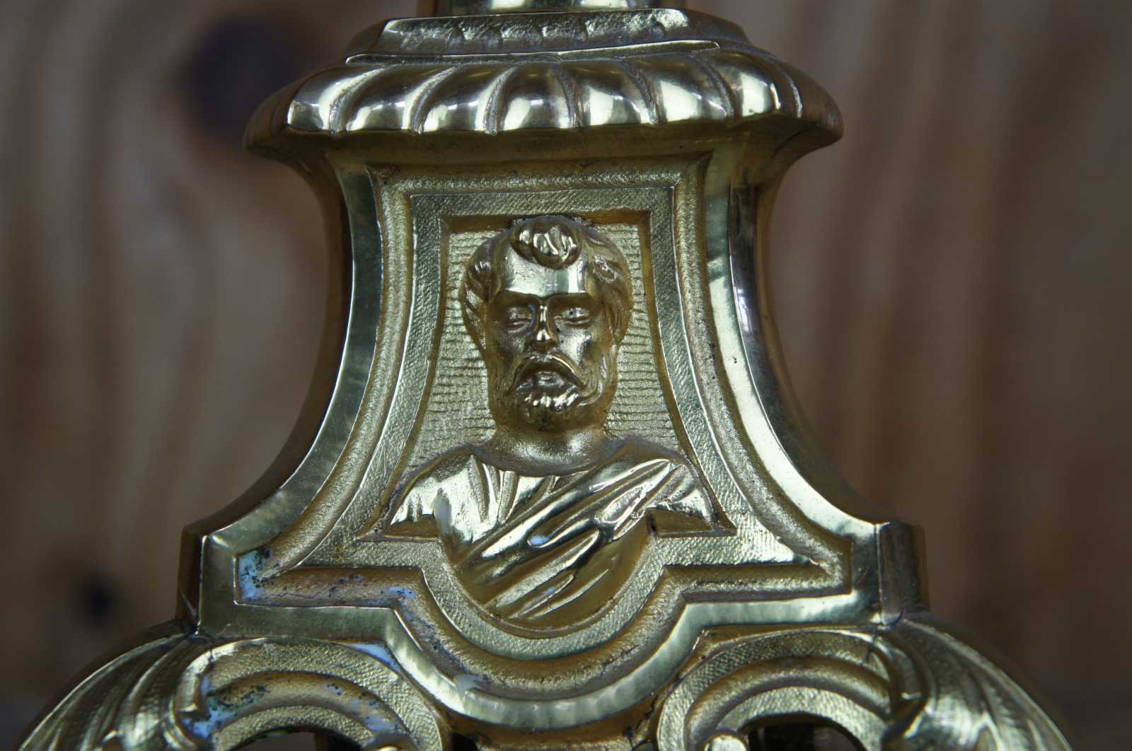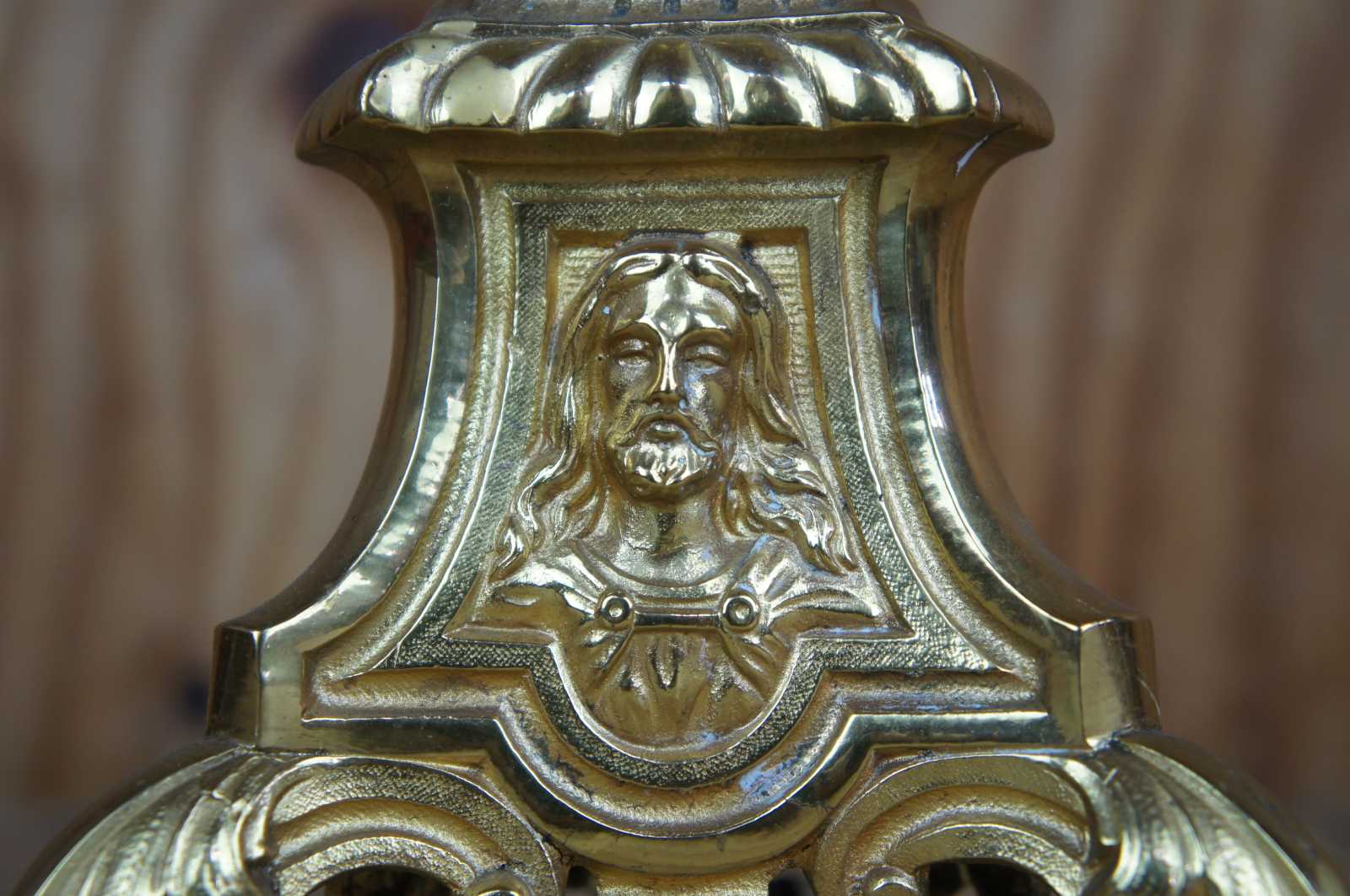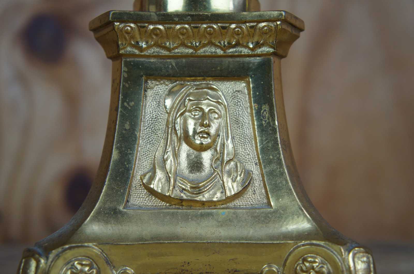 Vintage pair of brass ecclesiastical church alter candlesticks featuring Jesus, Mary and Joseph.