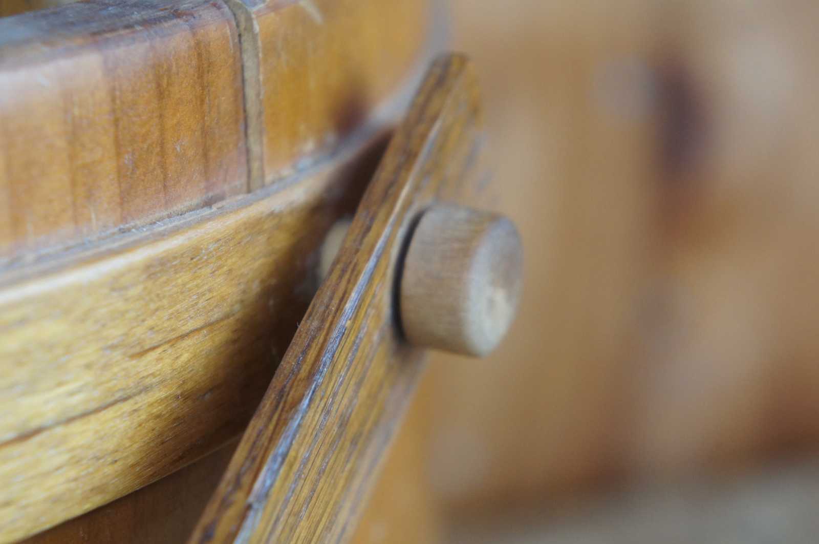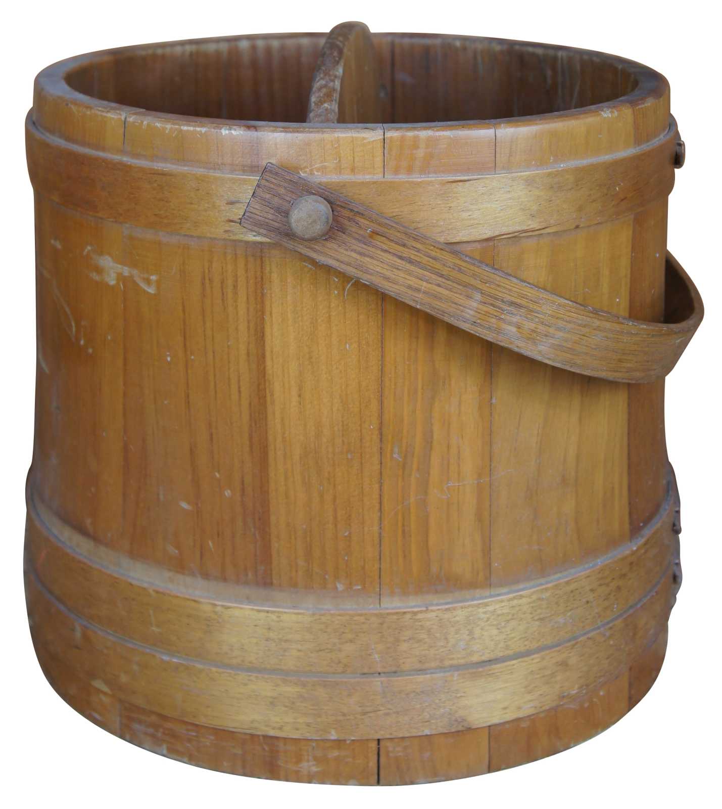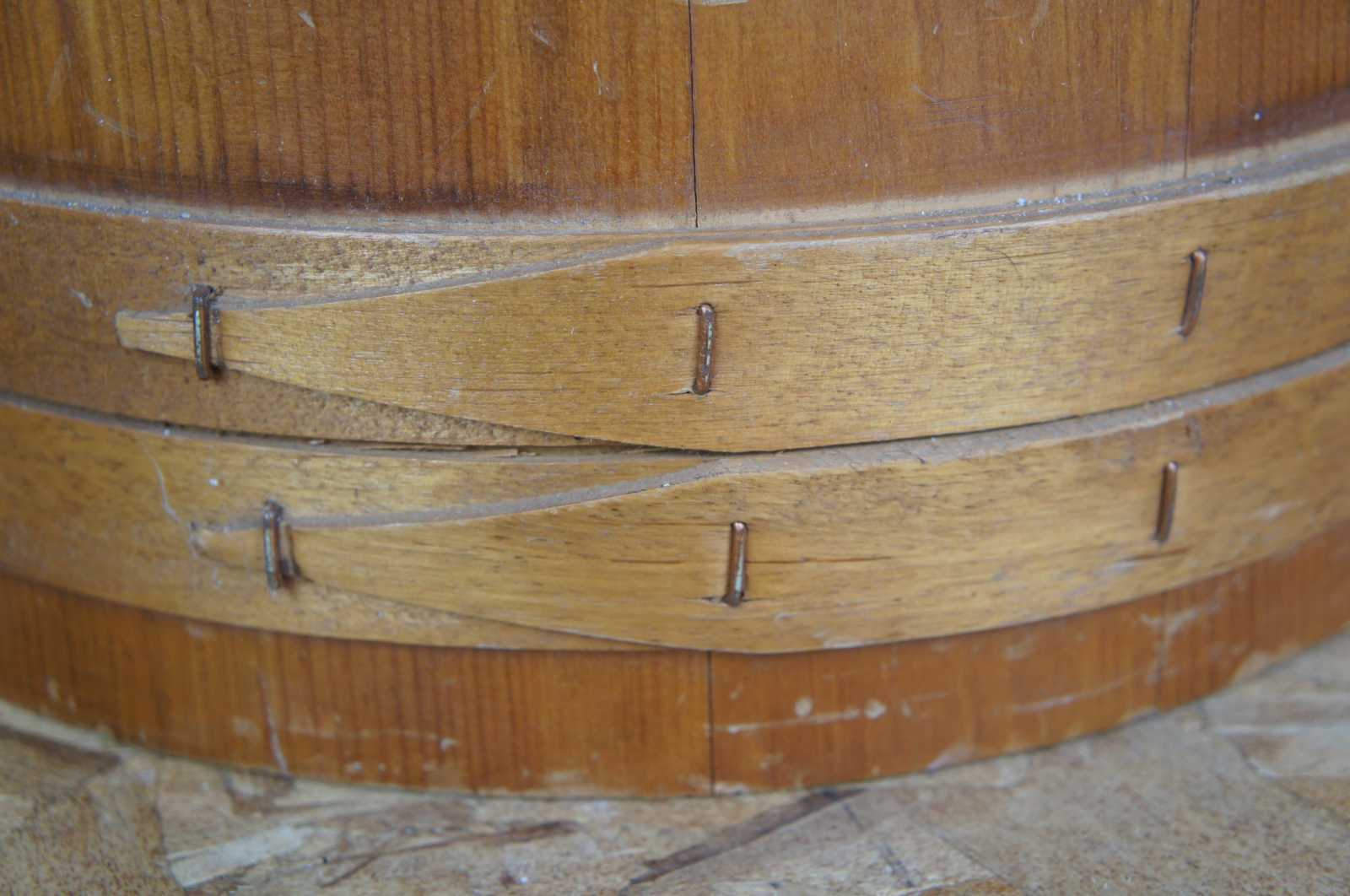 Antique primitive pine wood country farmhouse Firkin sugar basket with divider and handle.