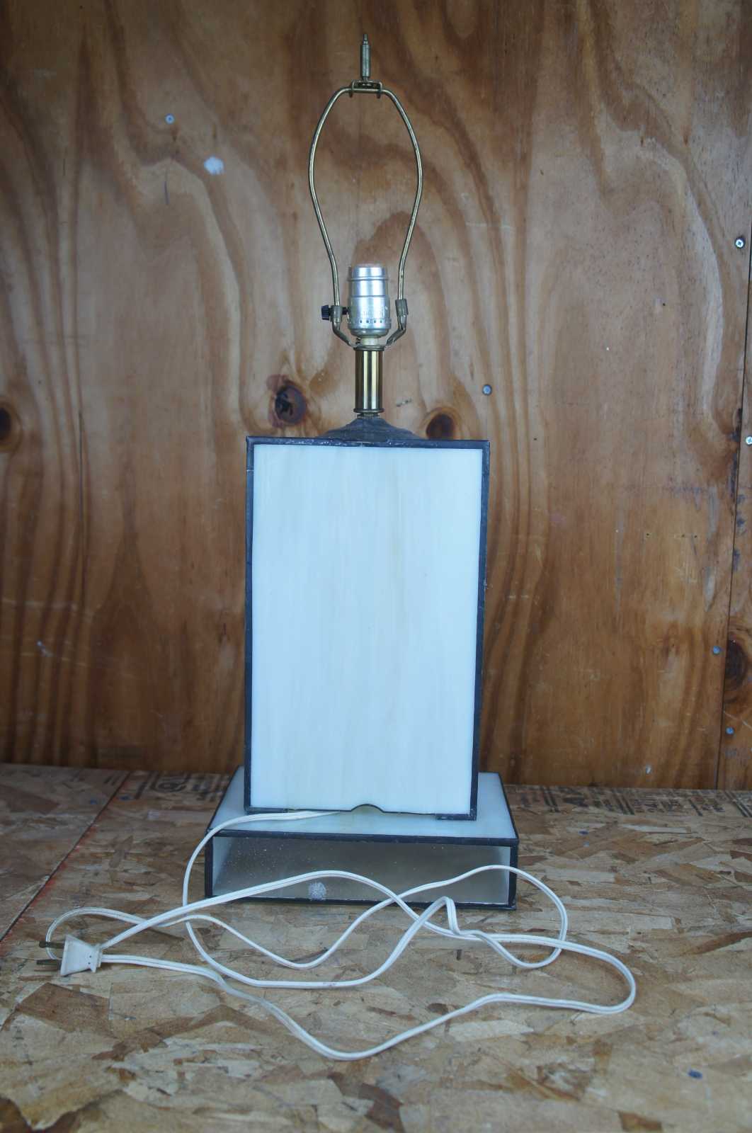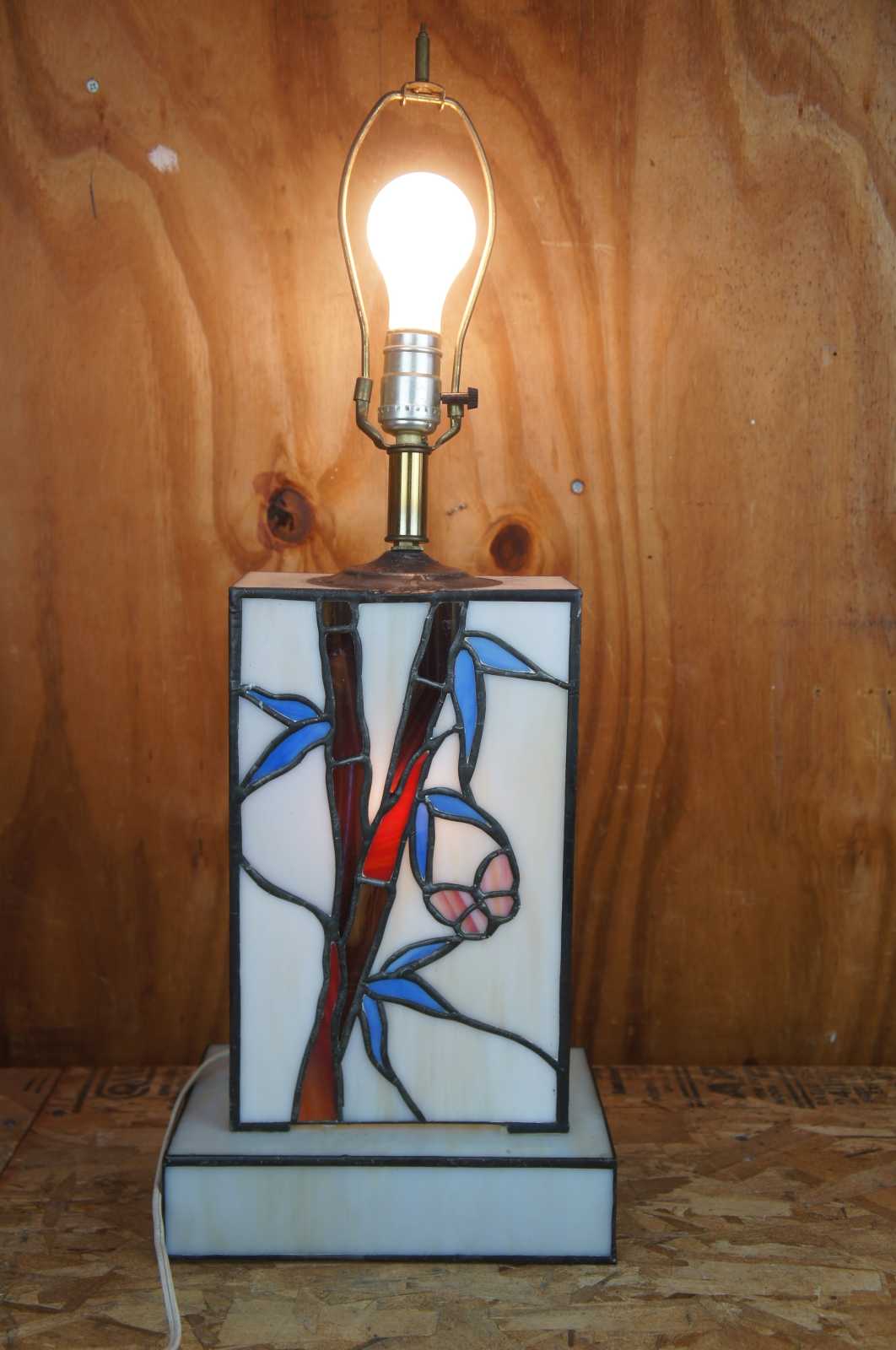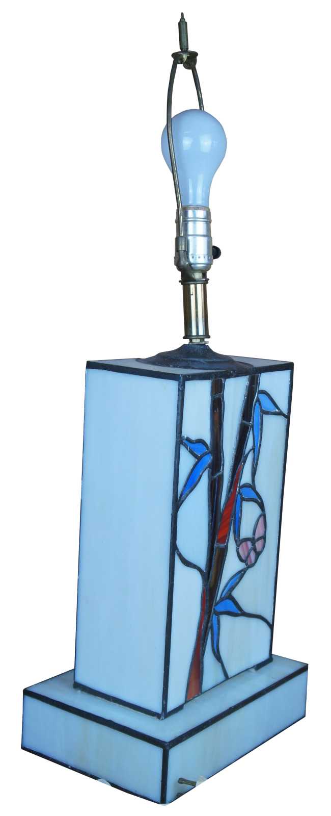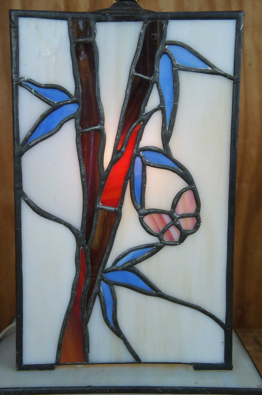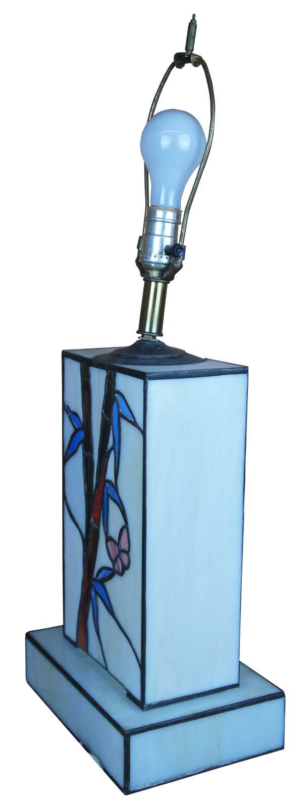 Vintage stained slag glass lamp and base featuring floral bamboo motif with butterfly.