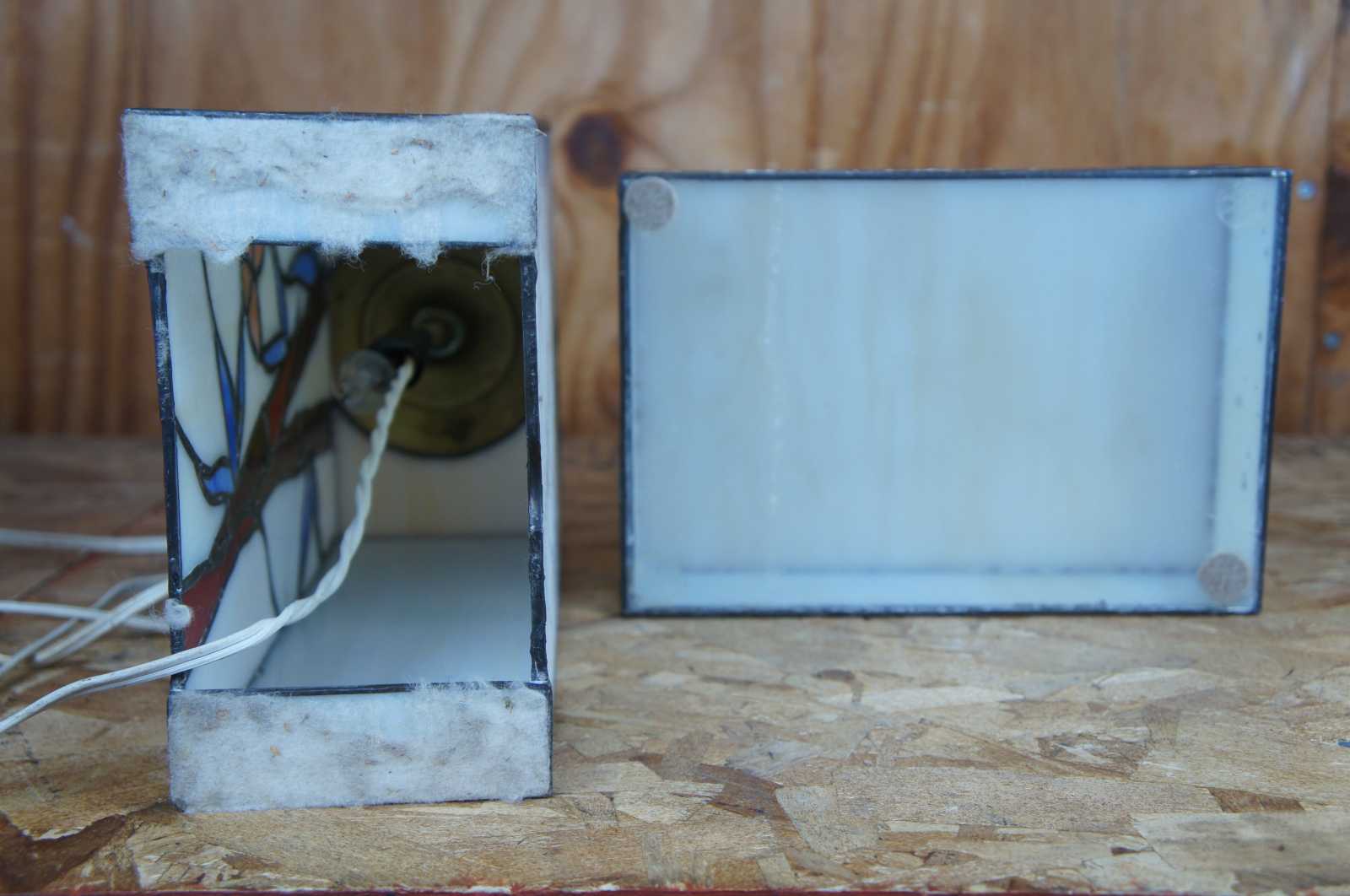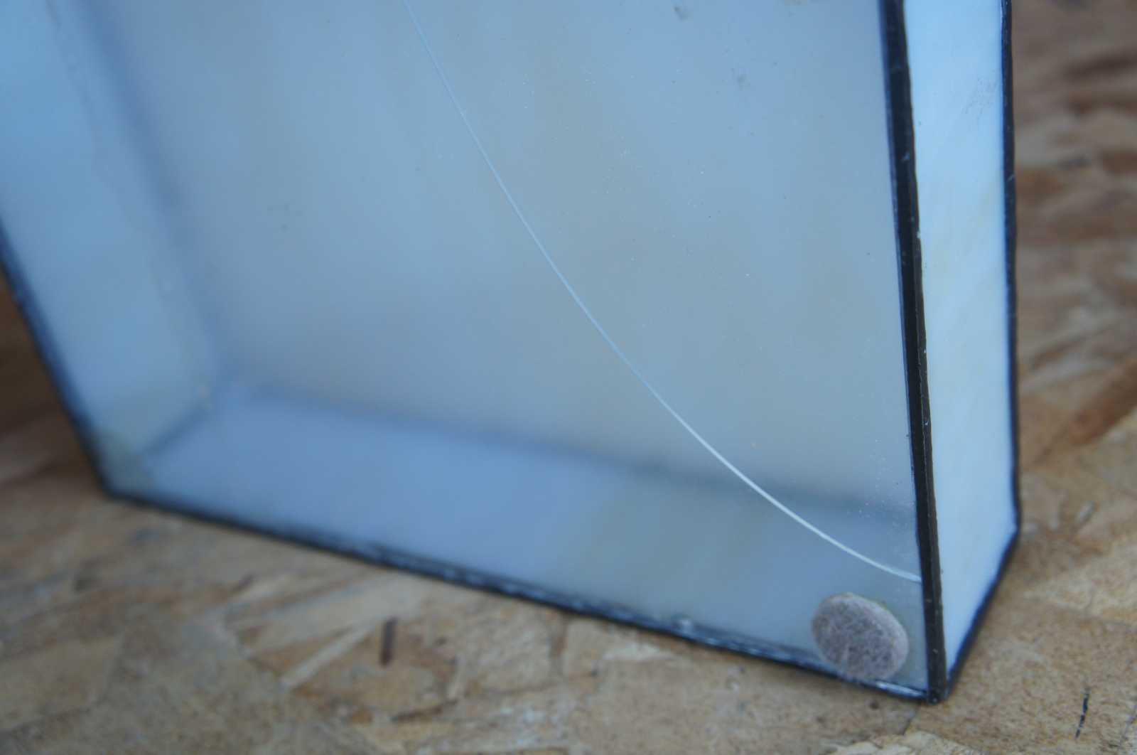 Fair condition, crack to bottom of base, tilted fixture, no shade.