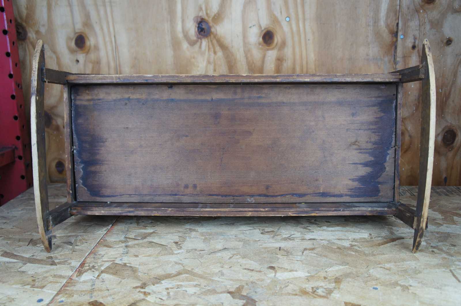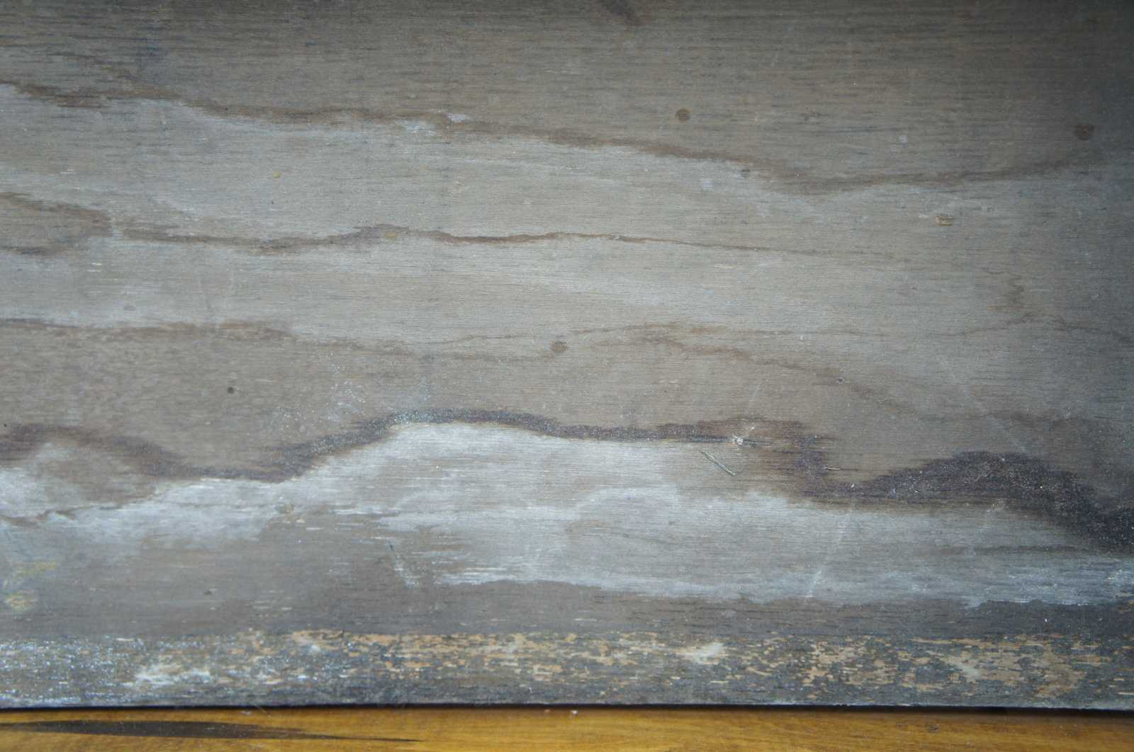 Fair antique condition, wear and distressing commensurate with age and use, finish loss, edge wear, missing trim / veneer, water damage to base board, sticker.