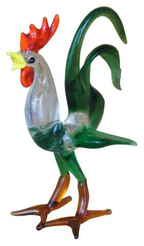 Vintage hand blown art glass figurine in the form of a brightly colored rooster or chicken strutting / clucking / crowing.