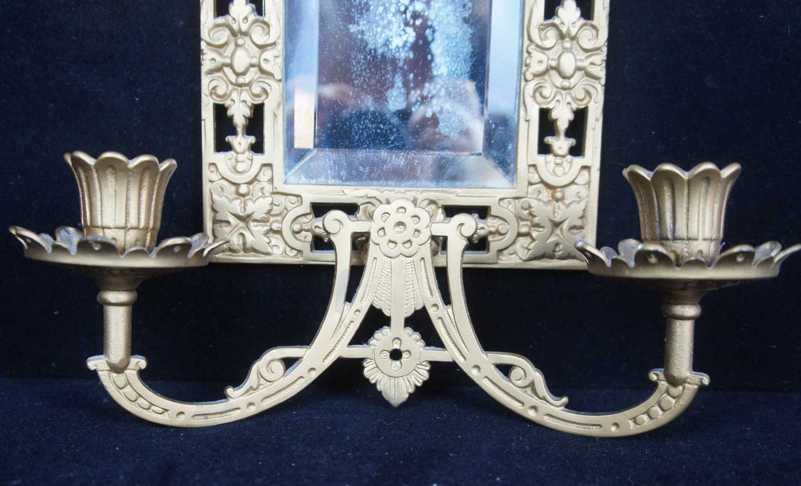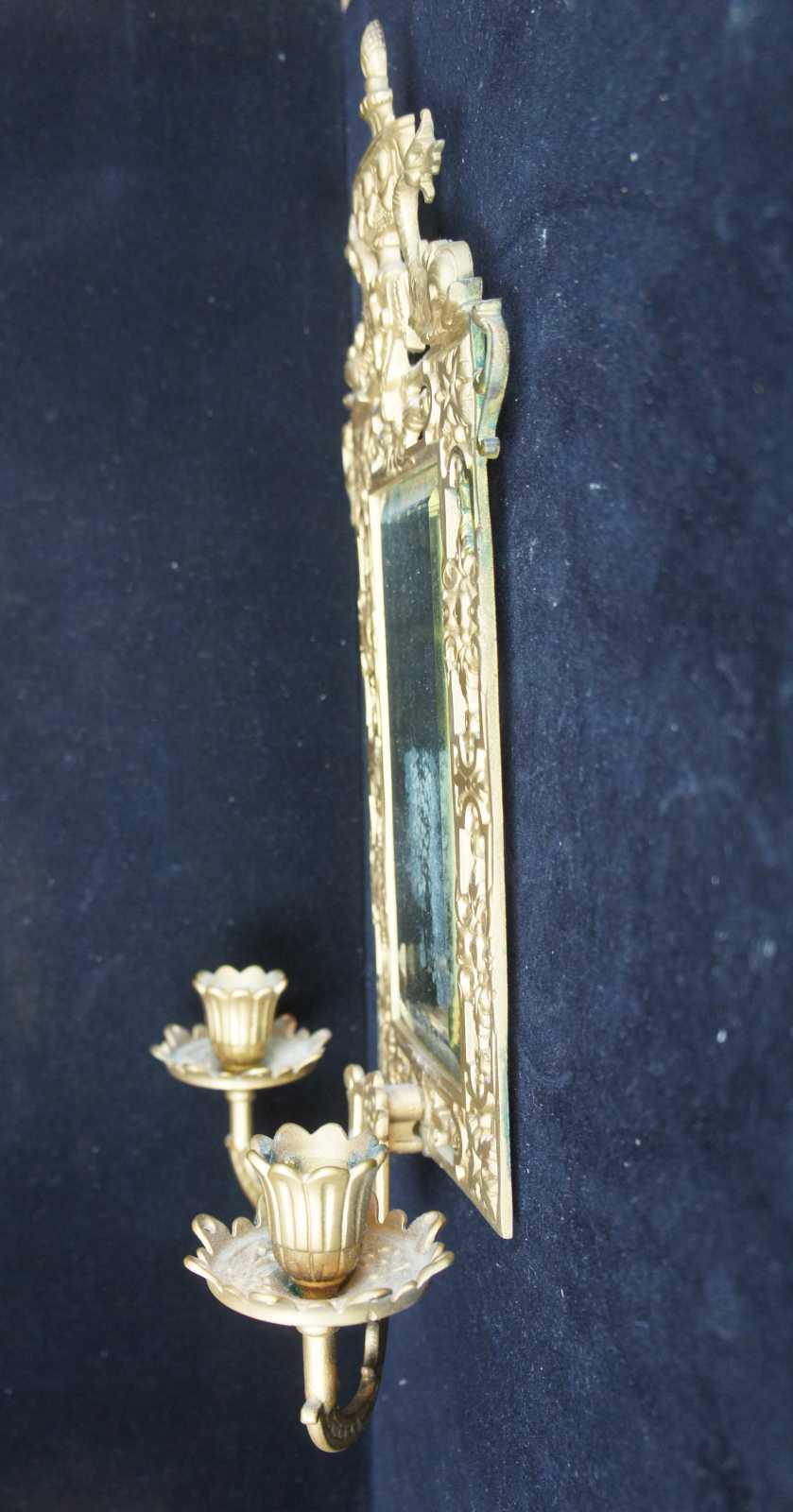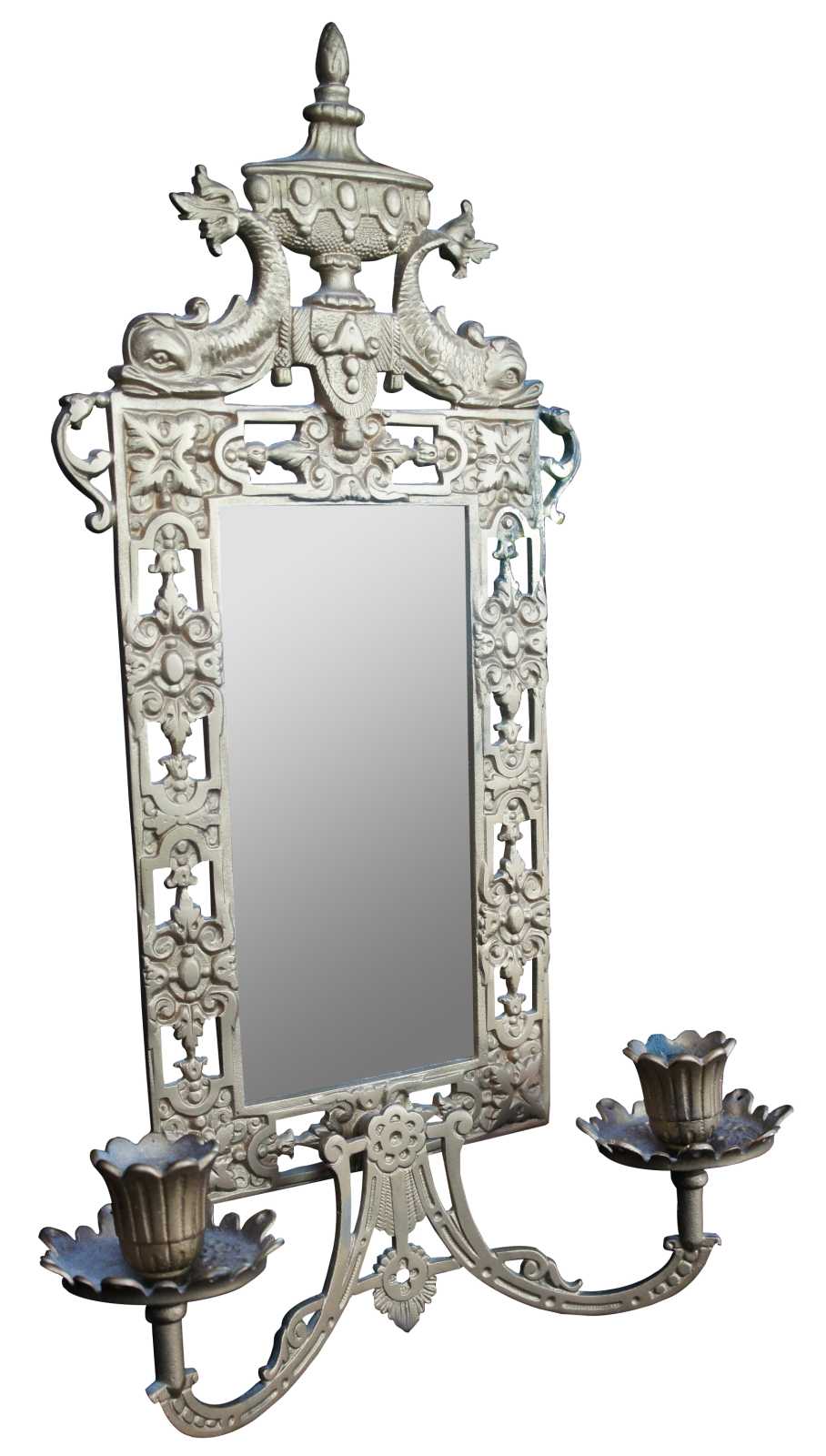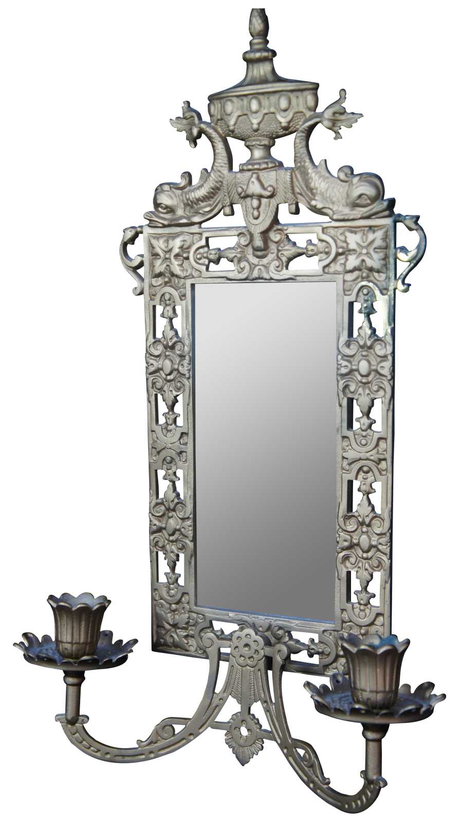 Antique gold wall hanging double sconce candle holder with mirror featuring ornate pierced reticualted design with crown finial and dolphins / dauphins. Marked B&H 3503 and 3609