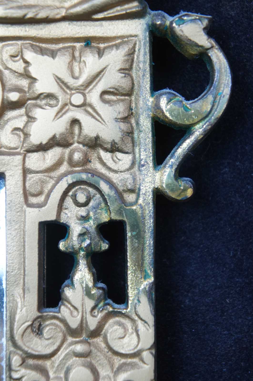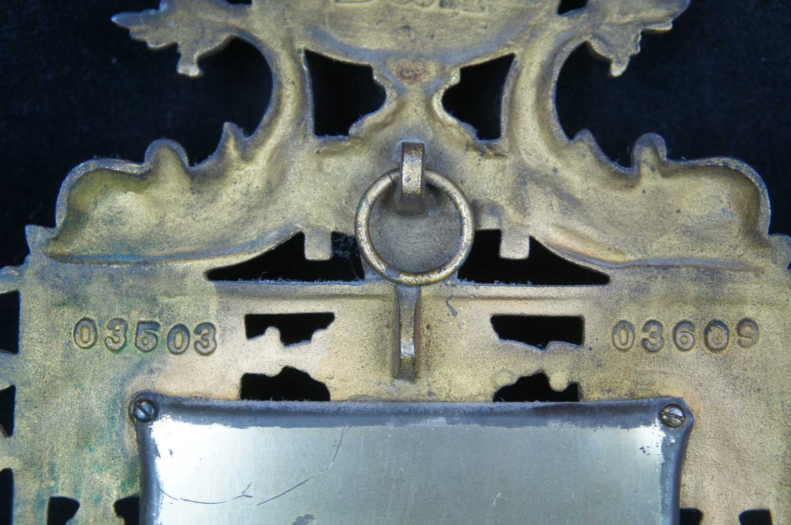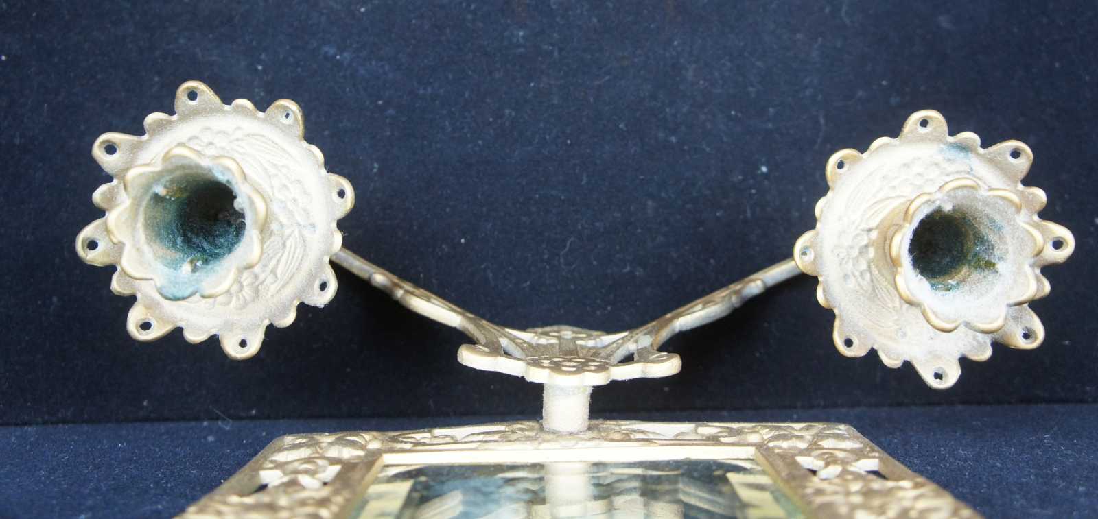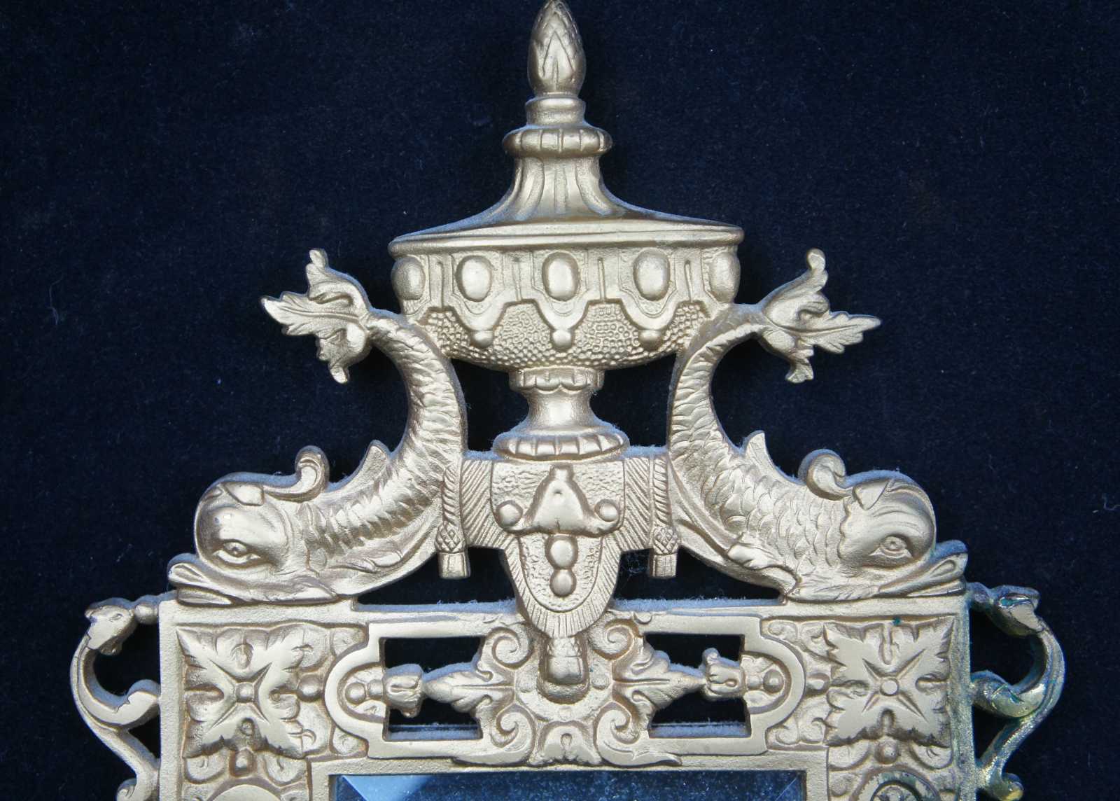 Antique gold wall hanging double sconce candle holder with mirror featuring ornate pierced reticualted design with crown finial and dolphins / dauphins. Marked B&H 3503 and 3609