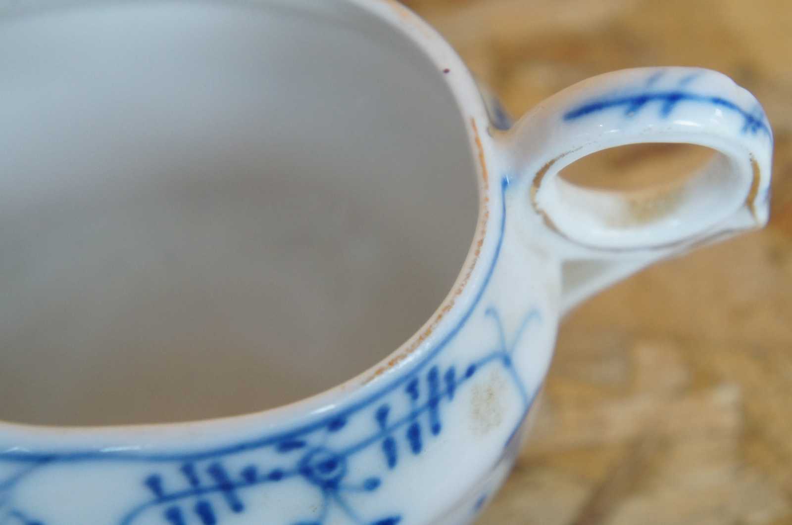 Antique Victorian porcelain flow blue invalid feeder, sauce or gravy boat with long pouring spout and delicate hand painted blue flowers.