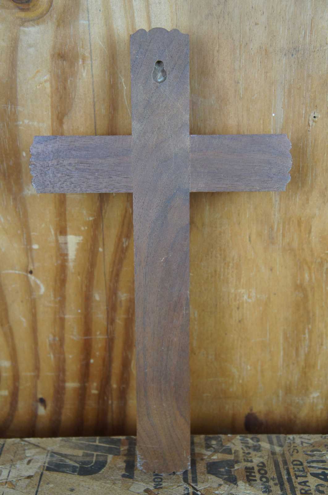 Vintage wood INRI wall hanging last rights crucifix or cross featuring prayer, candles and holy water.