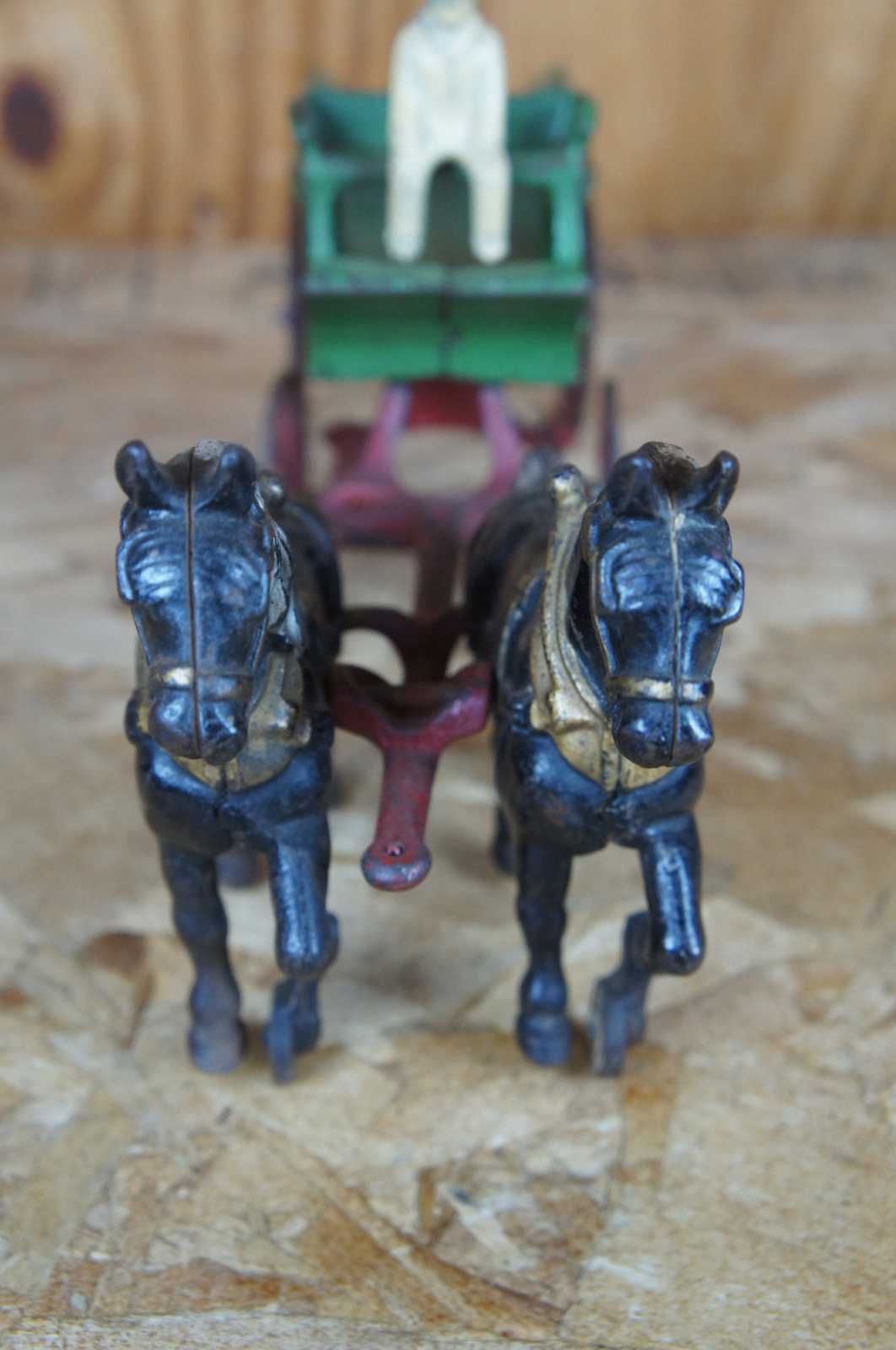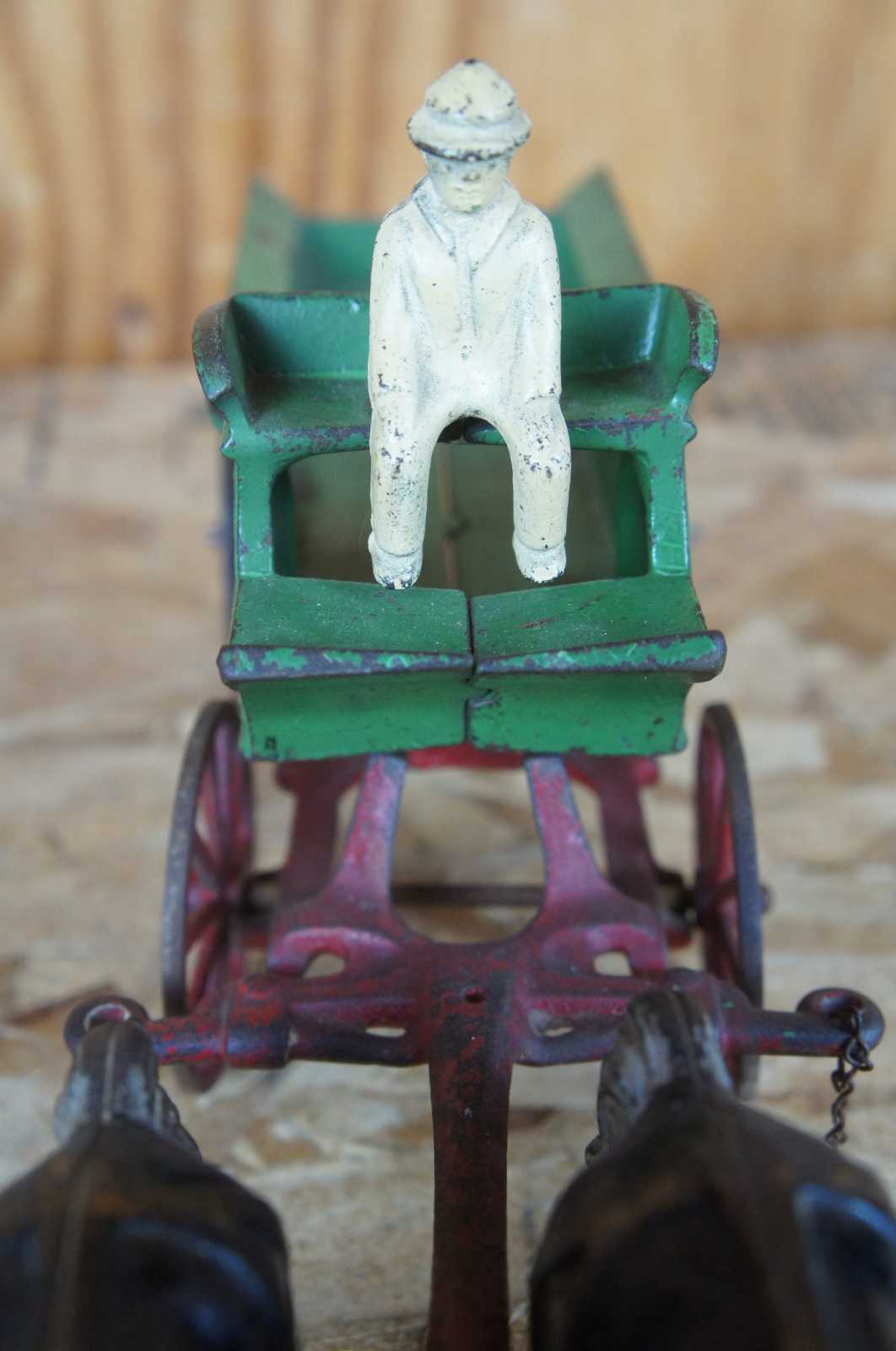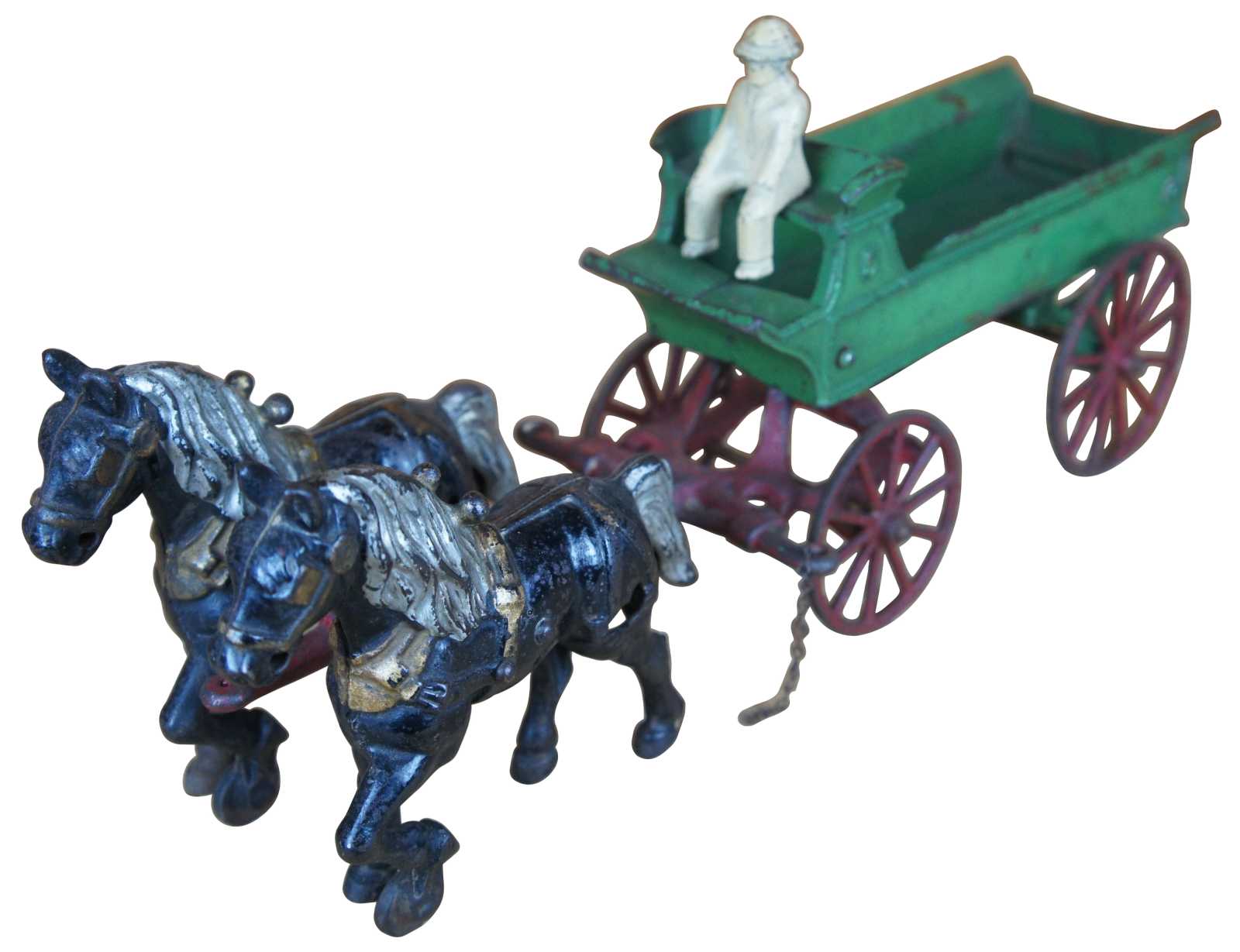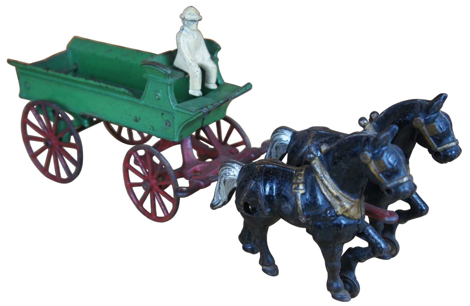 Antique Kenton Toys #5 horse drawn dray wagon with driver and two horse team.