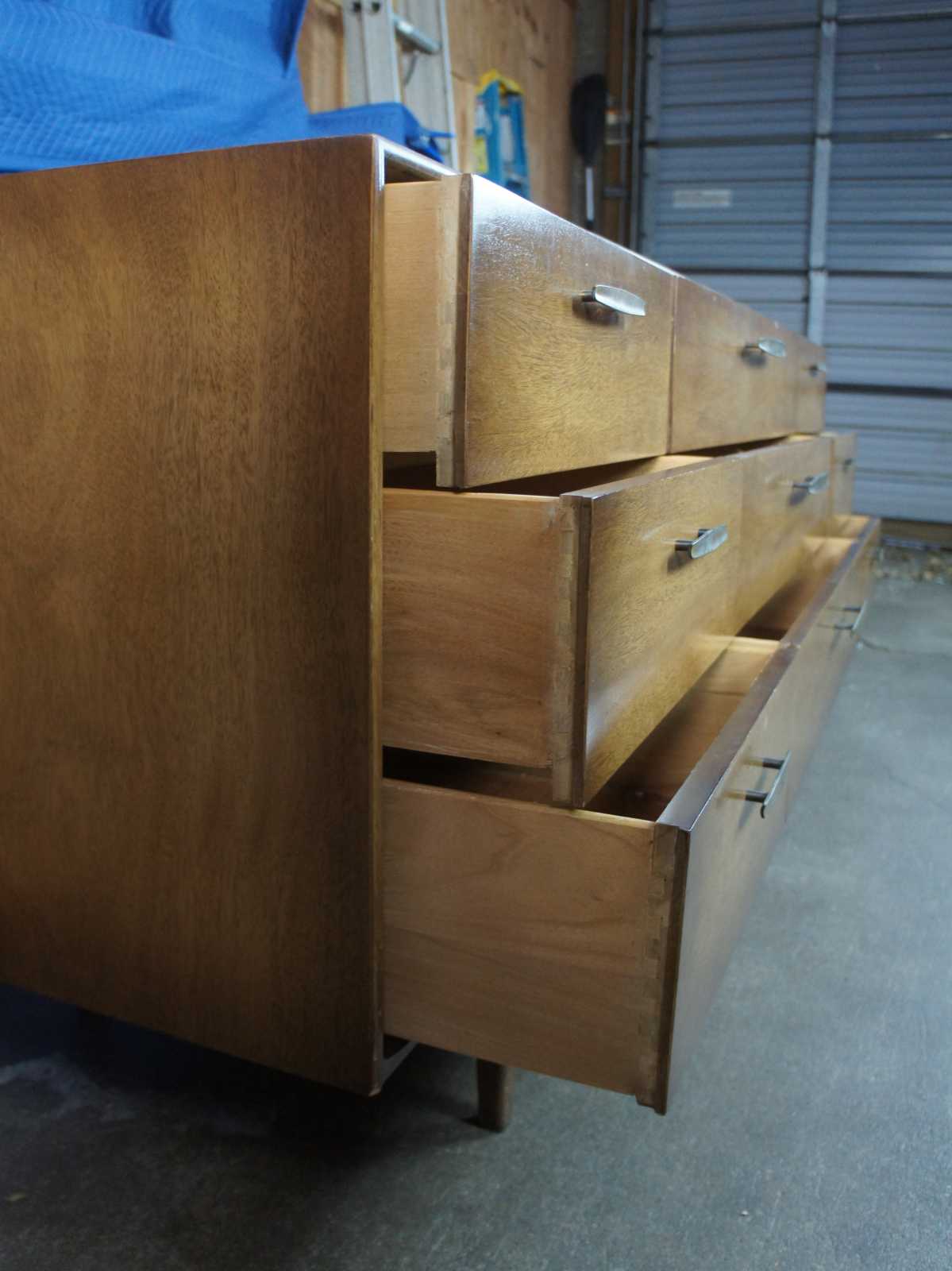 Mid century modern mirrored dresser. Made of walnut featuring rectangular form with nine drawers supported by tapered legs.