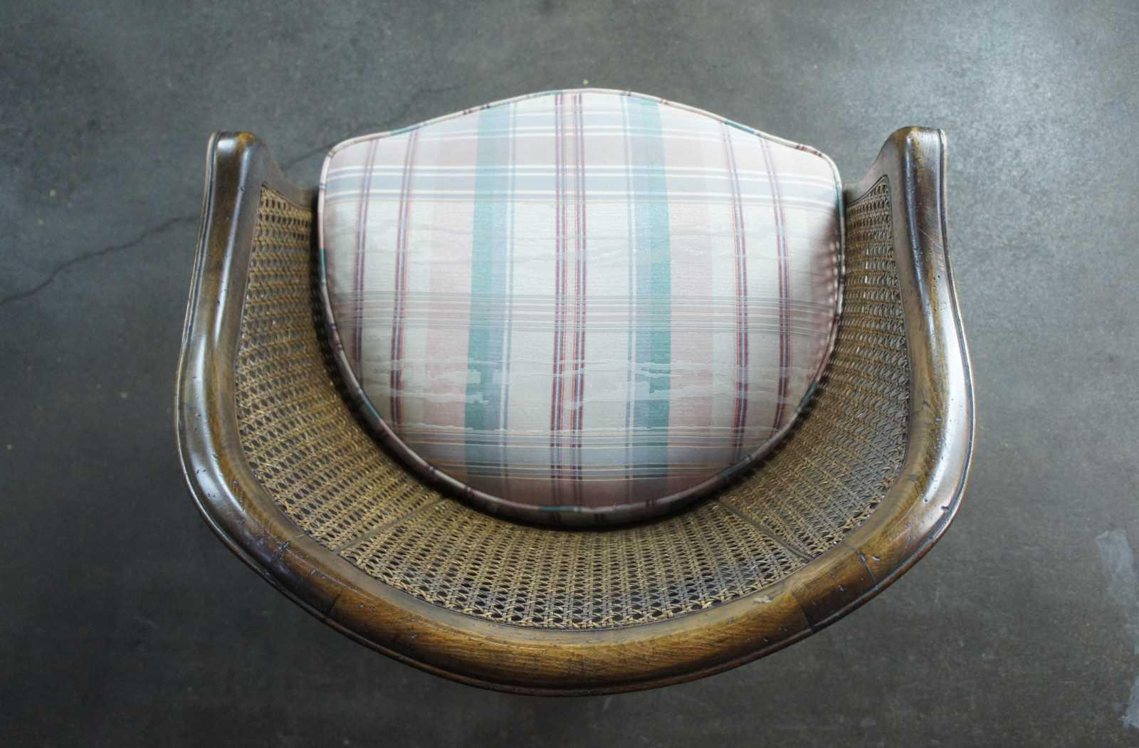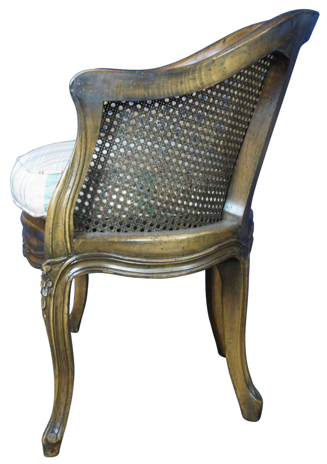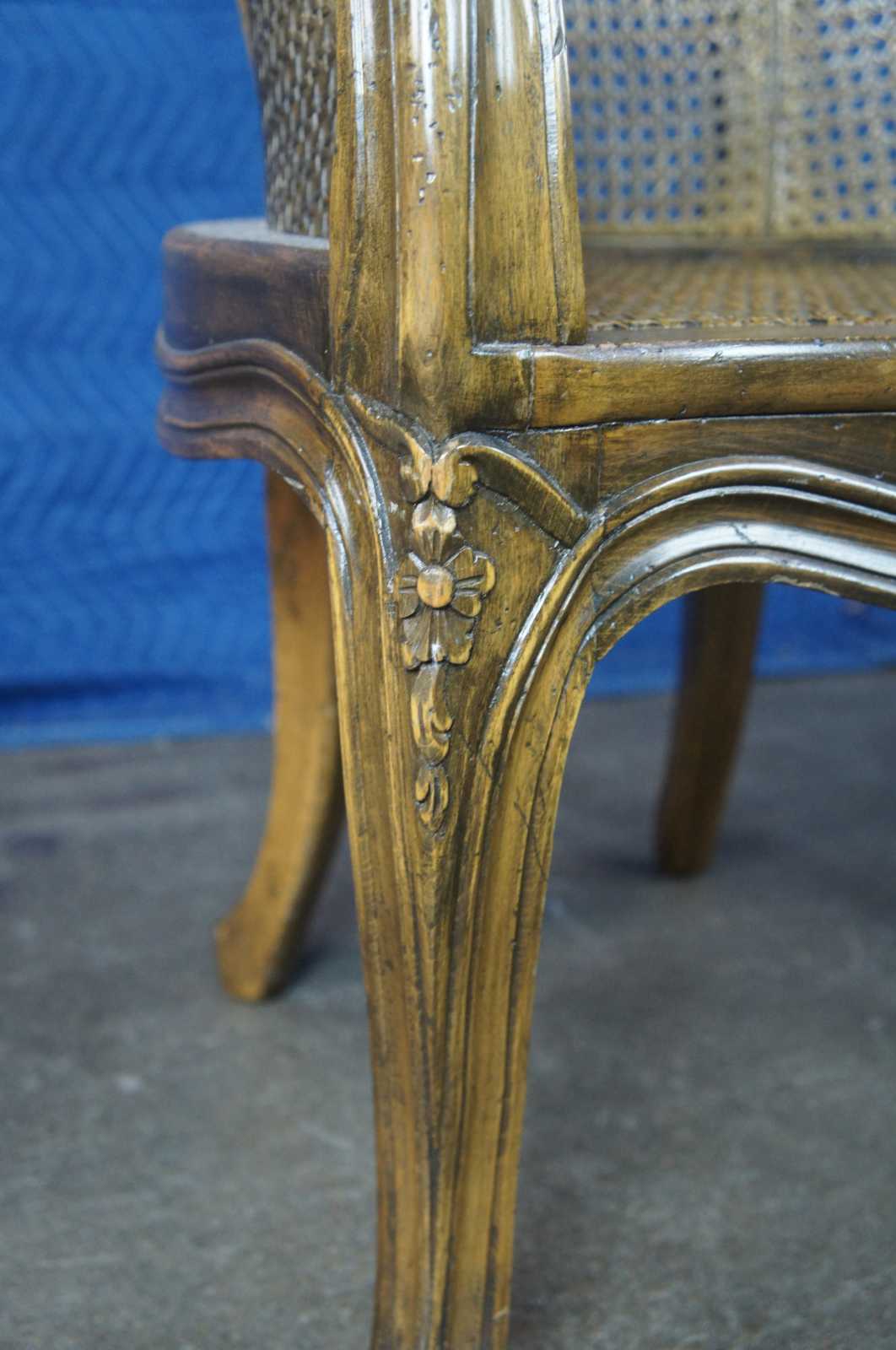 Vintage French Louis XVI style bergere club or lounge chair by Trouvailles Inc of Watertown, Ma. Made of walnut featuring serpentine form with round caned back and carved floral accents.
