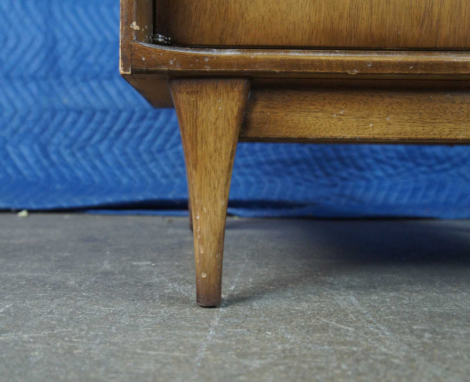 Two mid century modern side table nightstands. Made of walnut featuring cube form with one drawer and cabinet over tapered legs.
