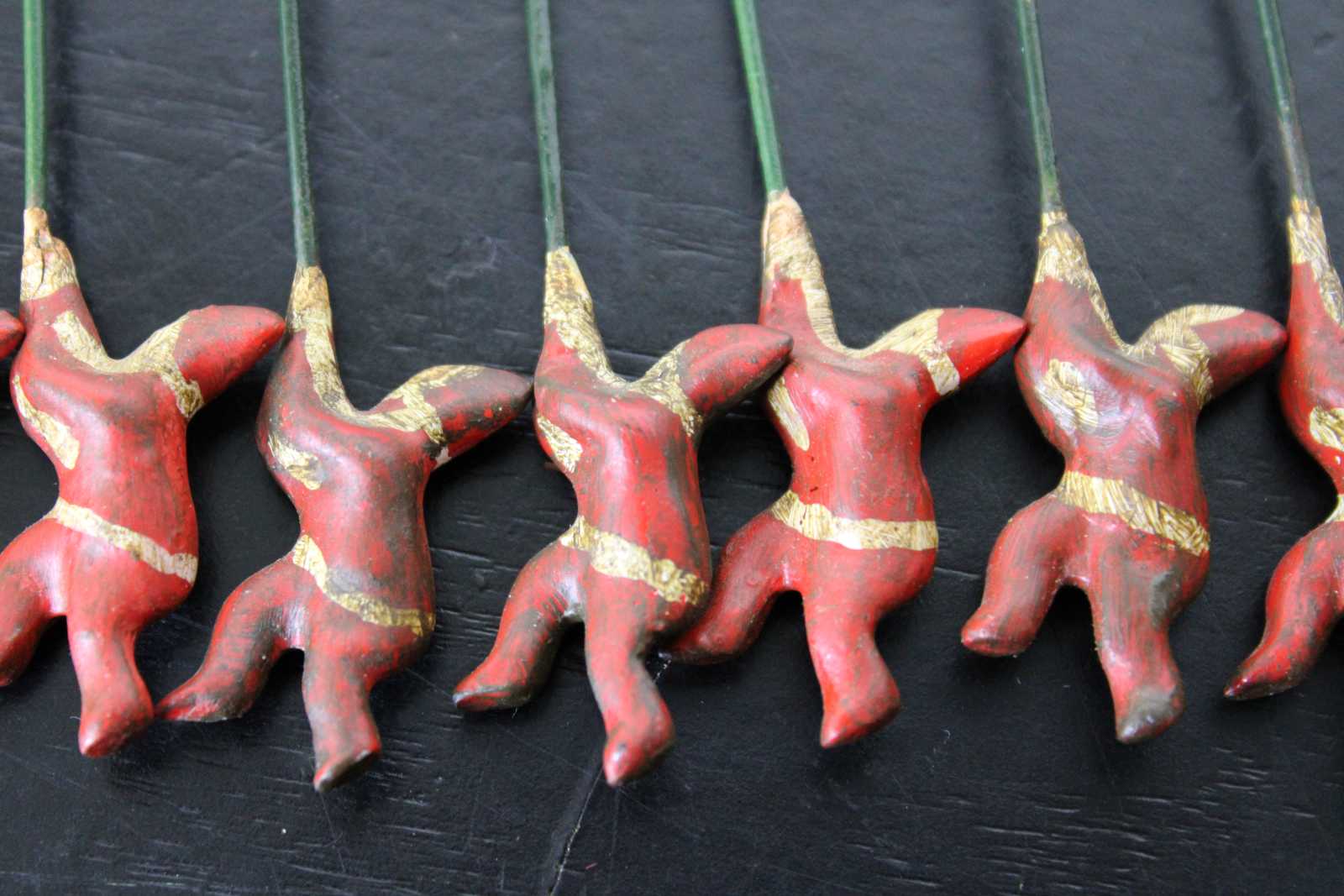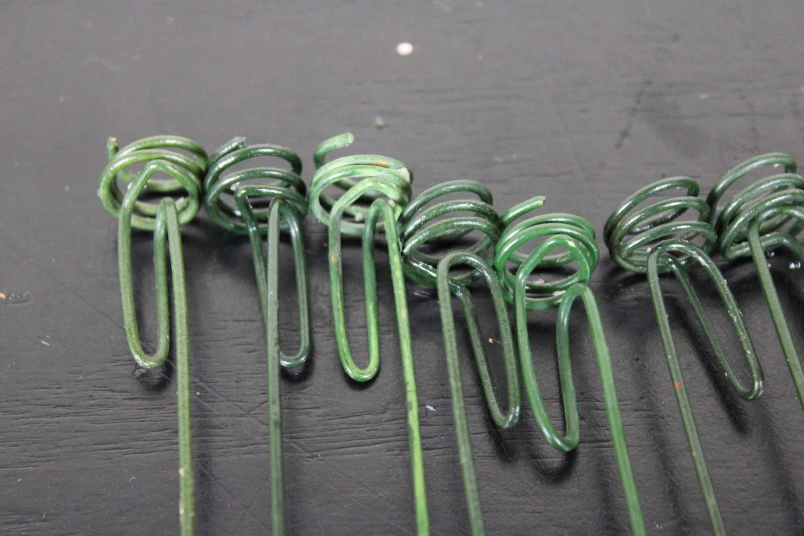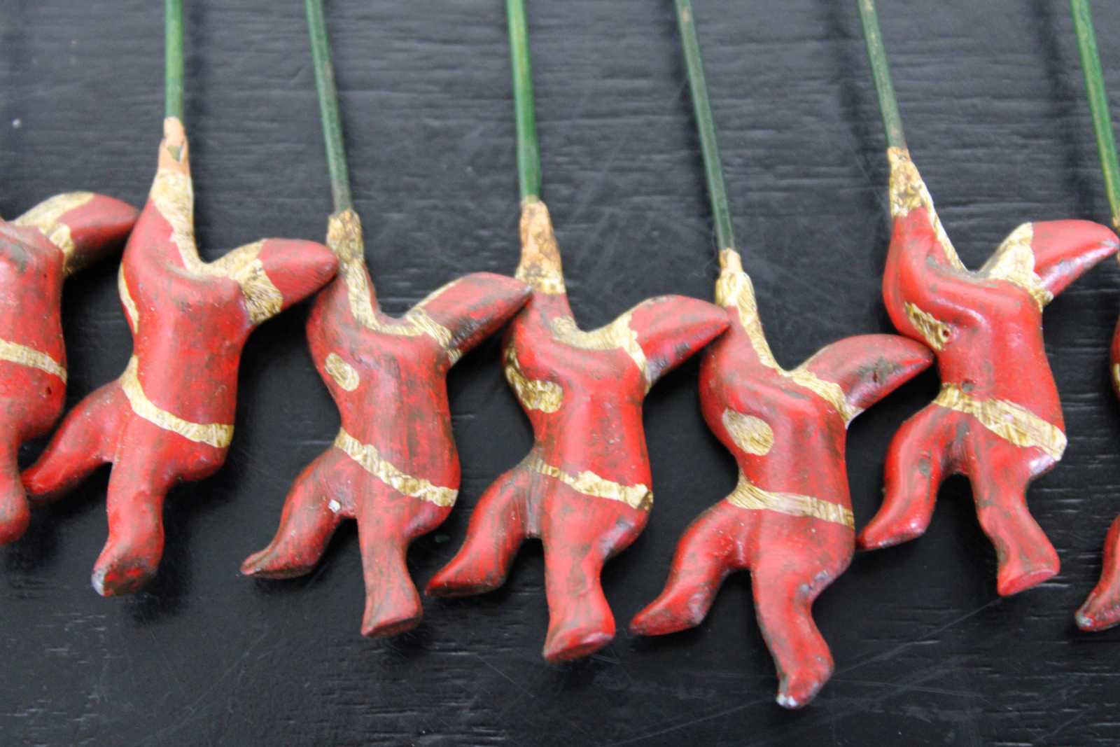 Set of fifteen rare Victorian Christmas tree candle holders, each made of green wire and counterweighted / balanced with a small iron Santa Claus pendulum hanging from the base. German Attributed.