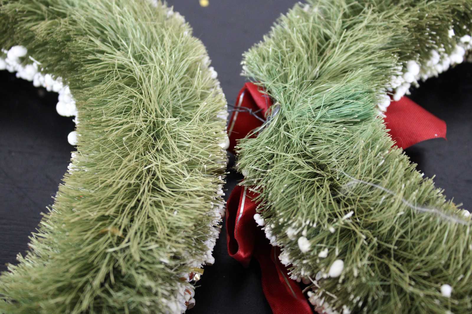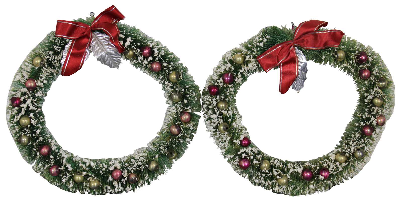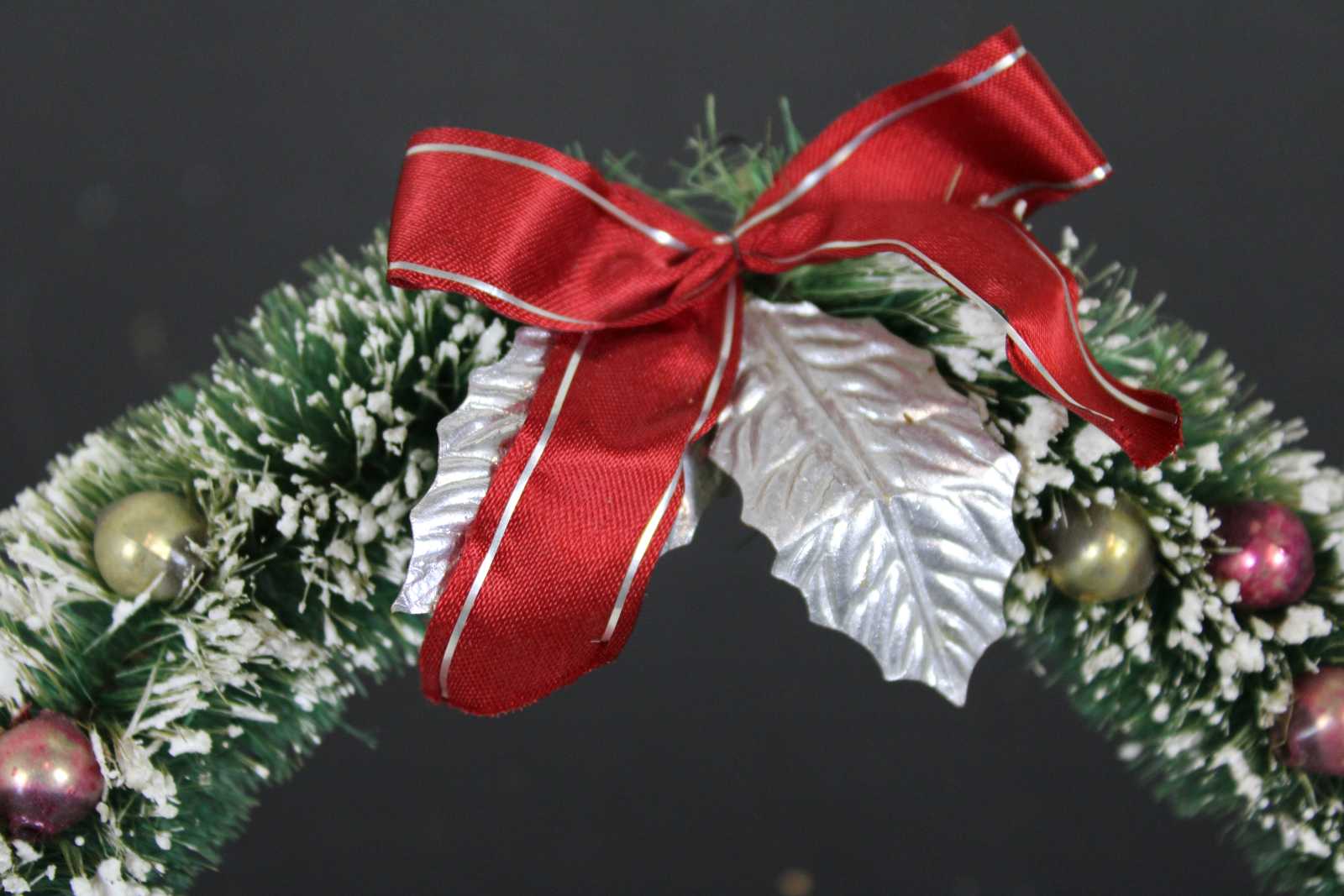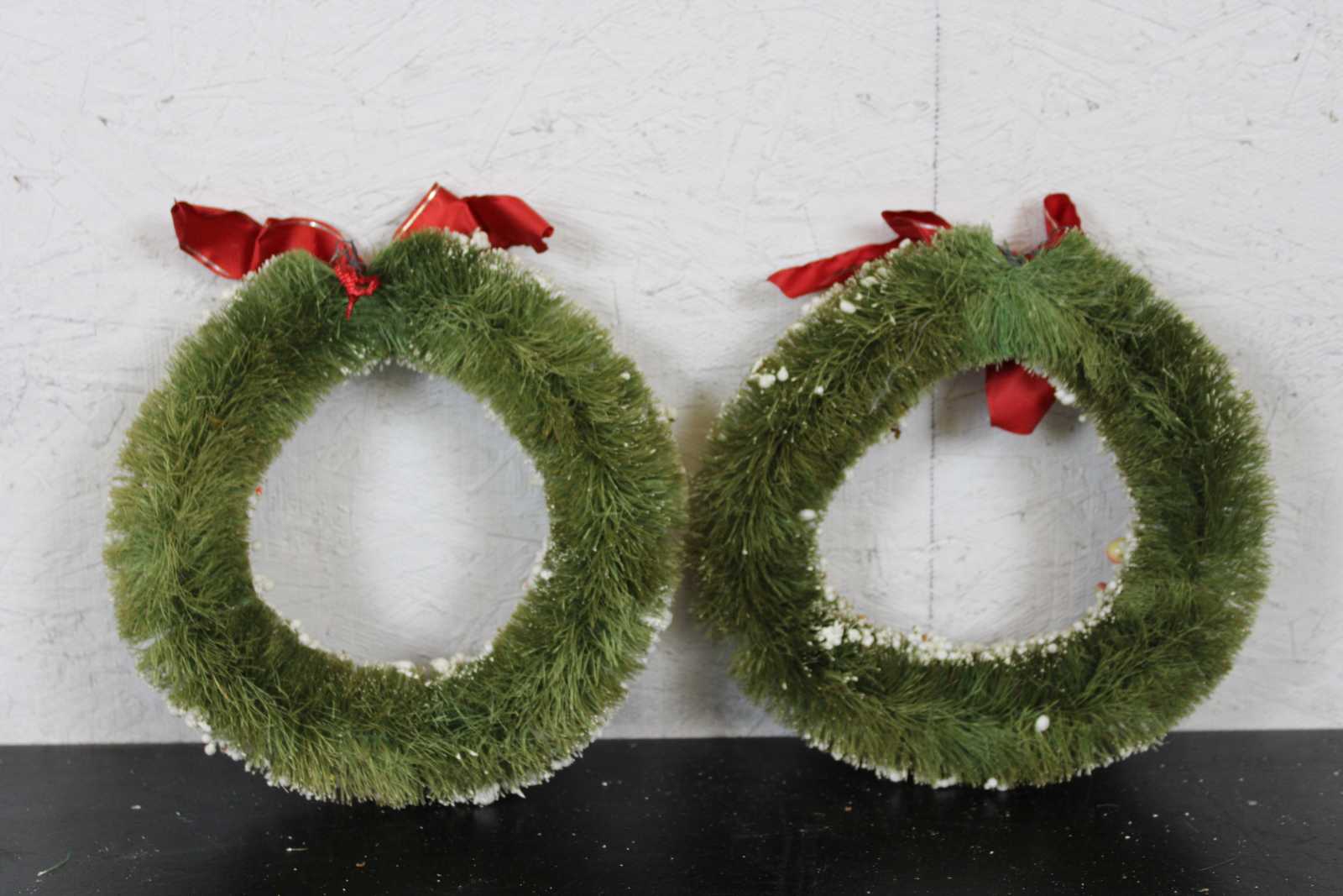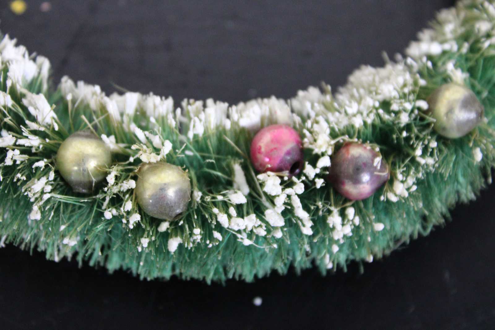 Set of four vintage folk art bottle brush Christmas wreaths with snow and bows; two decorated with fruit, and two with mercury glass ornaments.