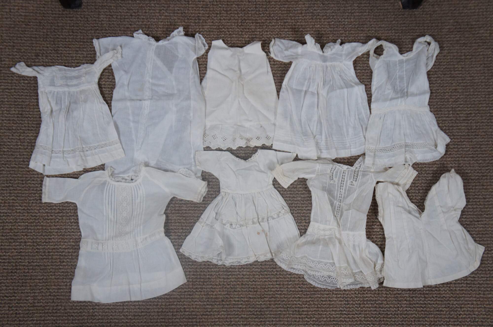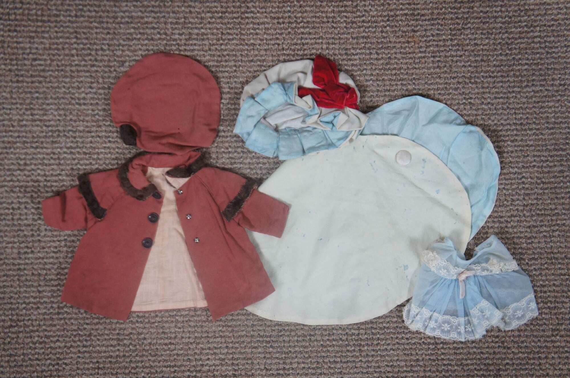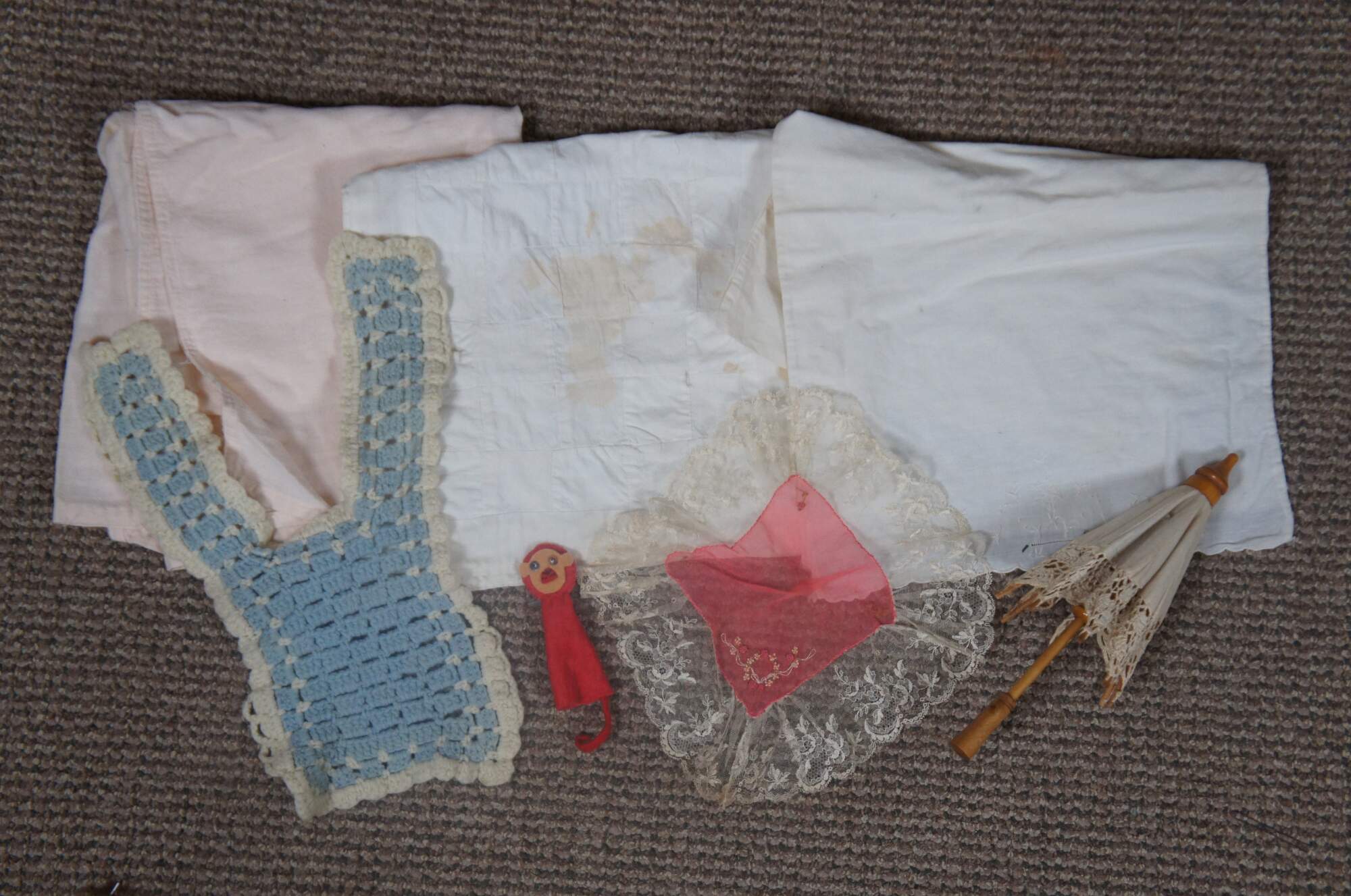 Lot of antique doll clothing and accessories including 2 blankets, 1 pillowcase, crochet bib, finger puppet, embroidered chiffon/ lace handkerchief, parasol, 9 white dresses/chemises/nightgowns, 4 hats, 5 pairs of shoes, 2 pairs of socks, 3 coin purse style handbags, 3 petticoats, 1 pair shorts with white shirt, 1 pair bloomers, 1 diaper, 1 matching dress and bonnet set, 1 coat and hat set, 1 cape and bonnet set, and 3 additional dresses. Stored in a salesman sample sized red steamer trunk with black bands, interior tray and lined with patterned paper. Latch is functional and opens when lock is pressed downward; no key.