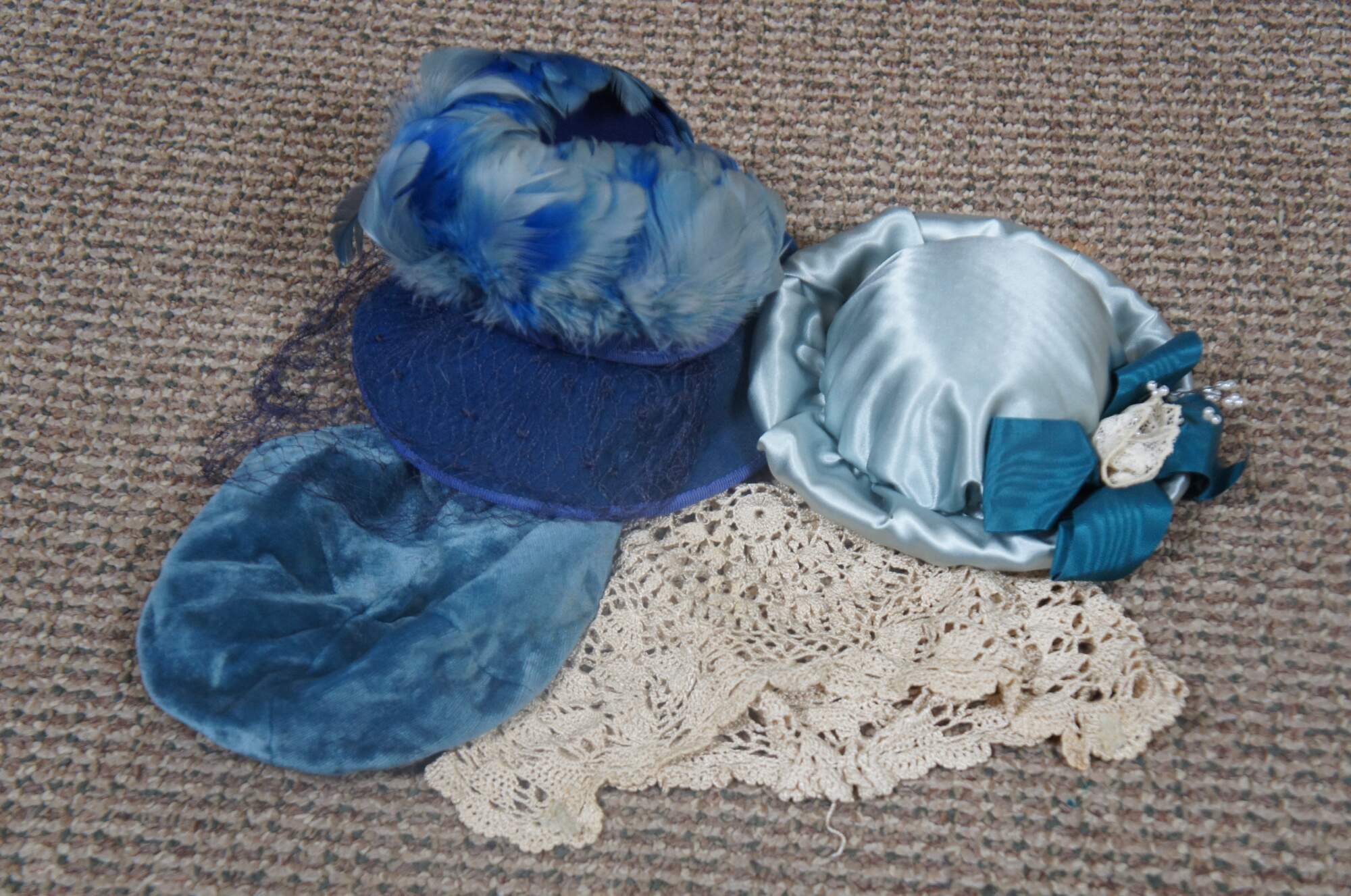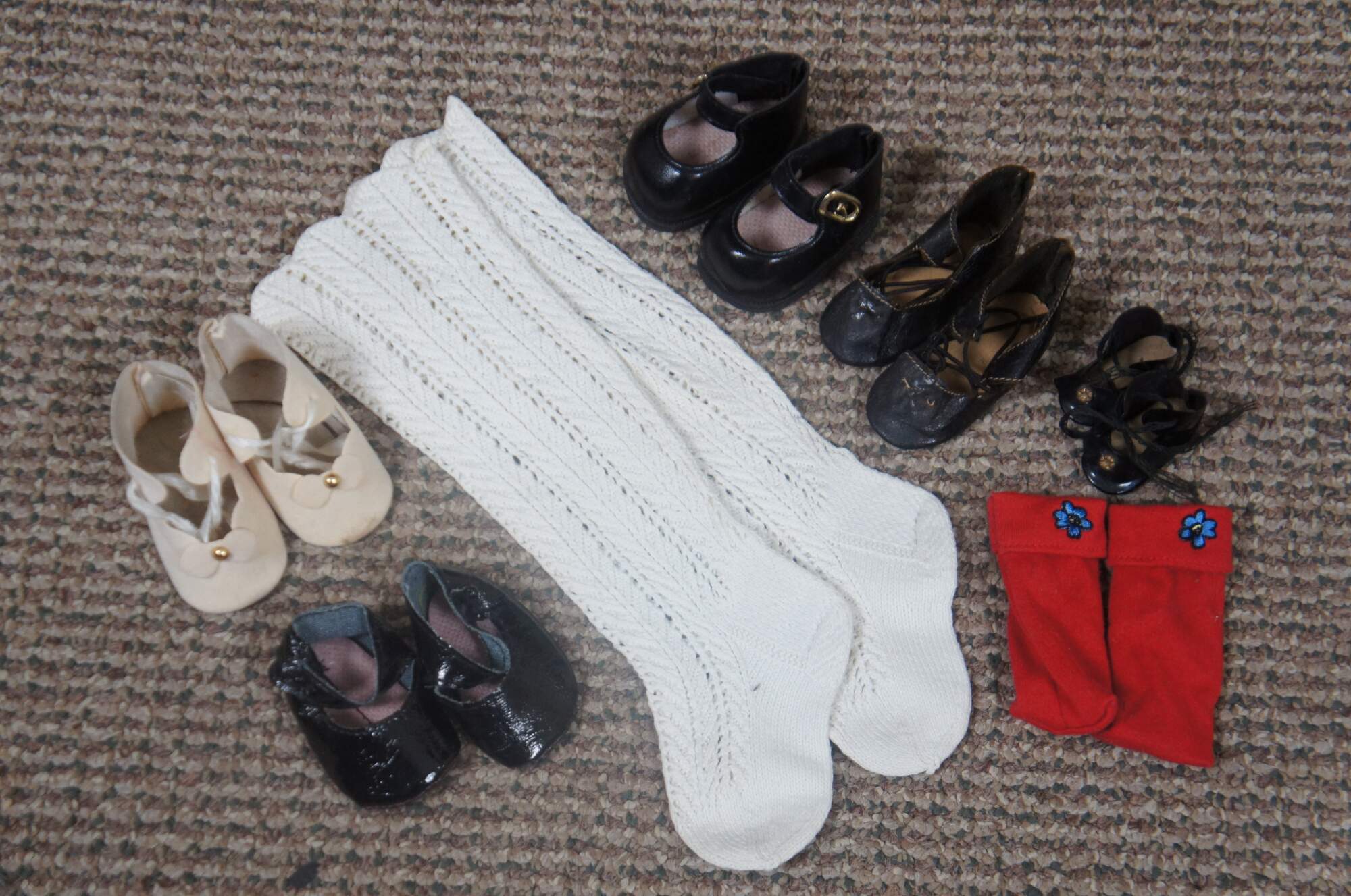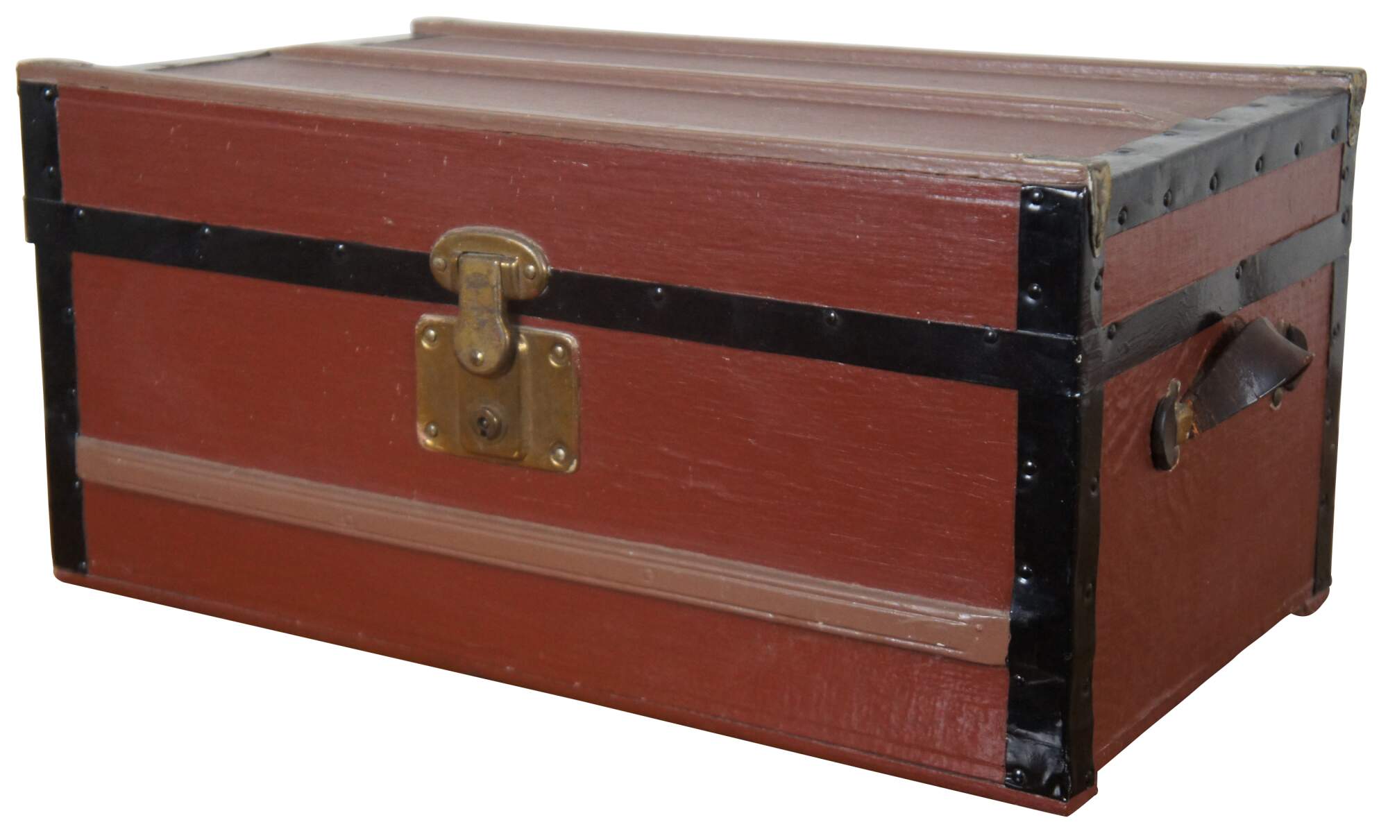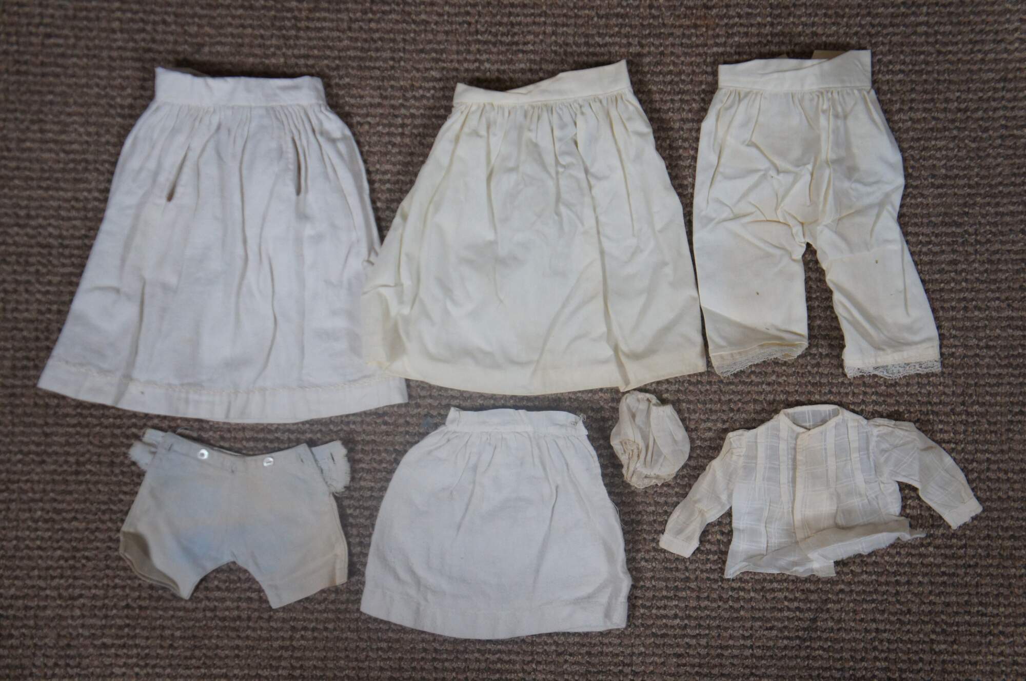 Lot of antique doll clothing and accessories including 2 blankets, 1 pillowcase, crochet bib, finger puppet, embroidered chiffon/ lace handkerchief, parasol, 9 white dresses/chemises/nightgowns, 4 hats, 5 pairs of shoes, 2 pairs of socks, 3 coin purse style handbags, 3 petticoats, 1 pair shorts with white shirt, 1 pair bloomers, 1 diaper, 1 matching dress and bonnet set, 1 coat and hat set, 1 cape and bonnet set, and 3 additional dresses. Stored in a salesman sample sized red steamer trunk with black bands, interior tray and lined with patterned paper. Latch is functional and opens when lock is pressed downward; no key.