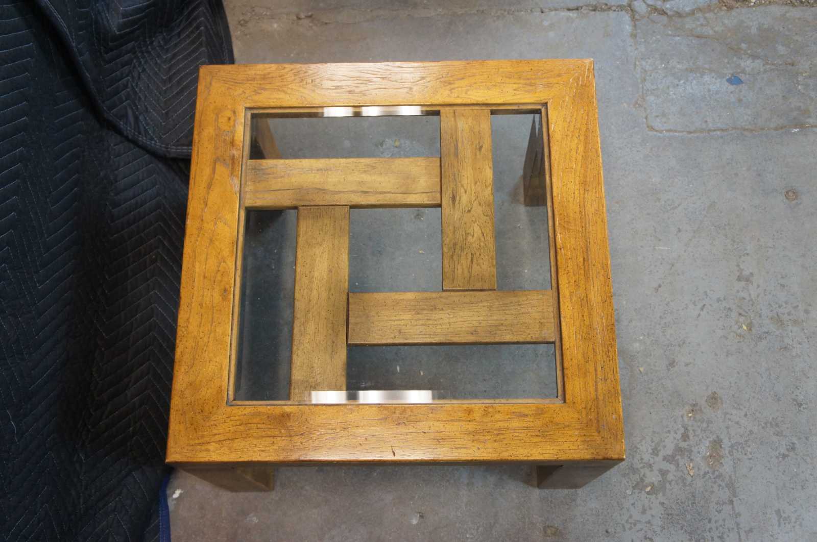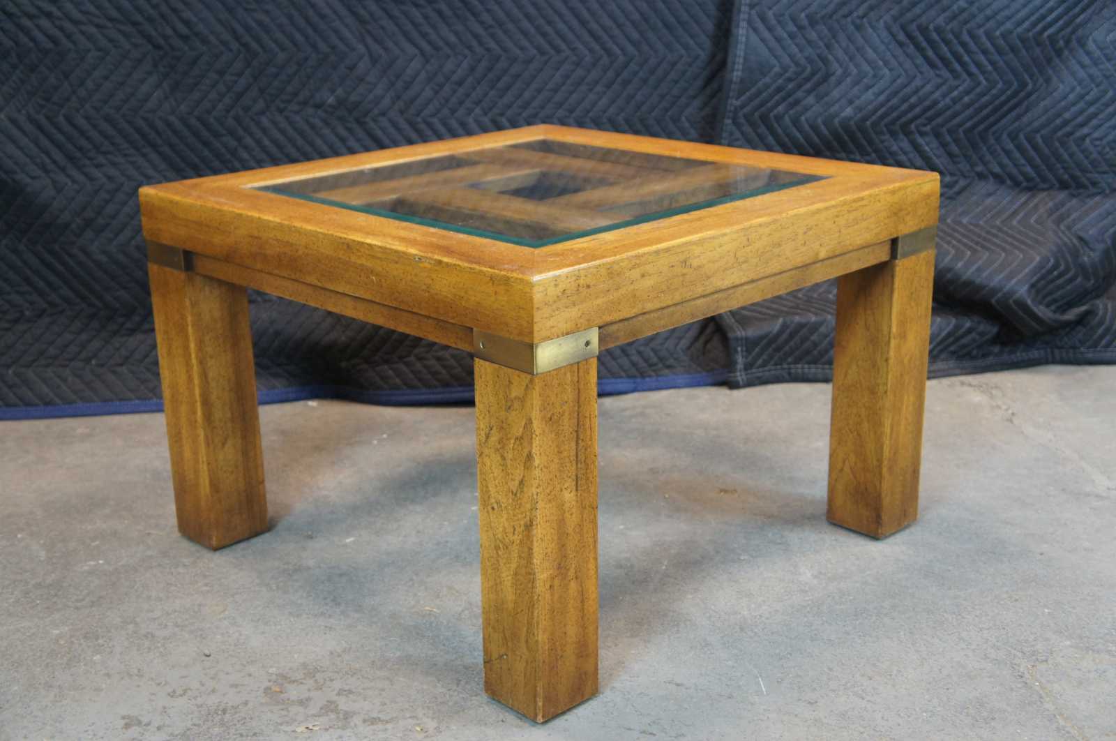 Two vintage Drexel Heritage Woodbriar collection side tables. Made of oak featuring square form with geometric design, beveled glass top and brass accents.