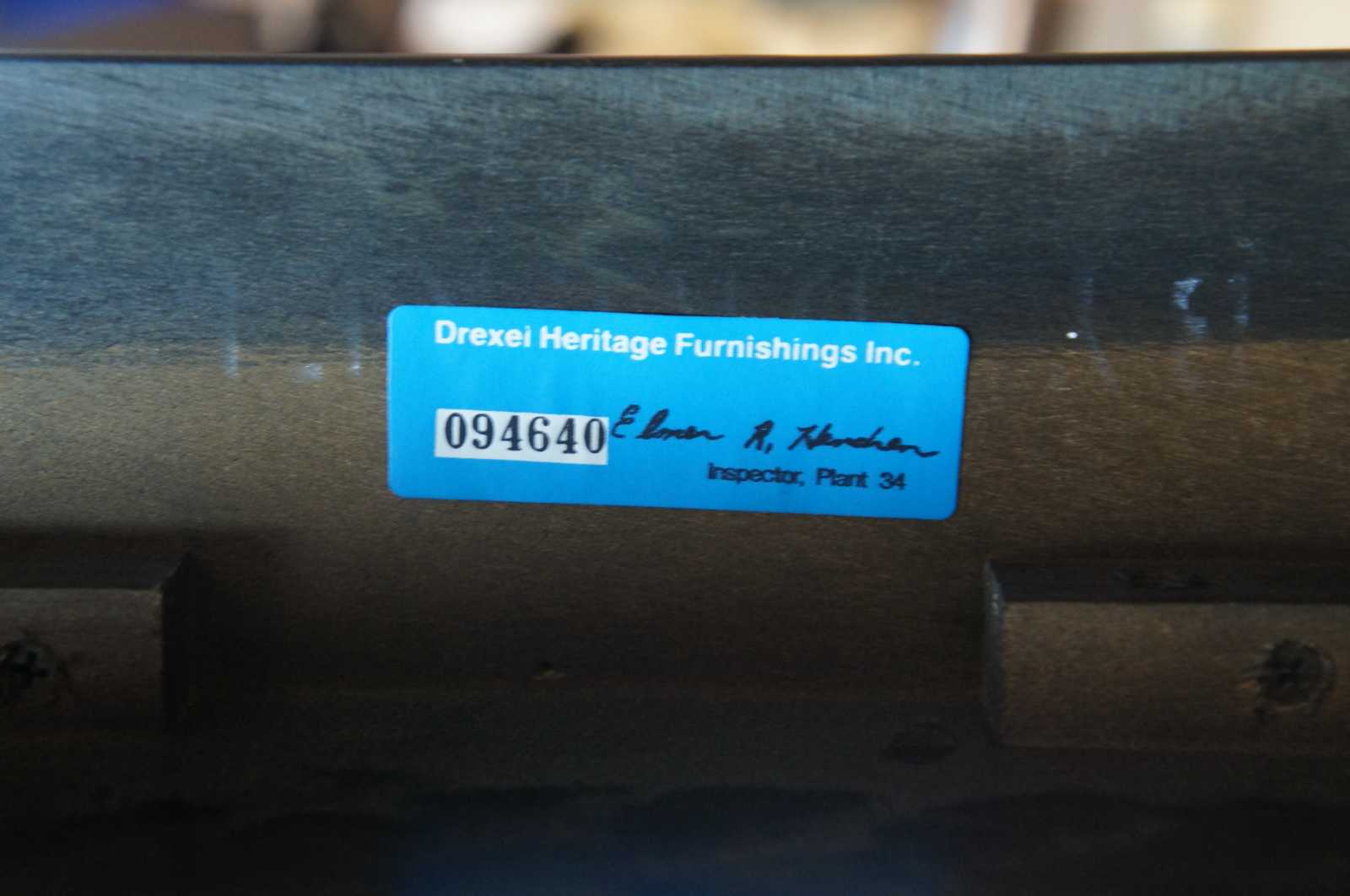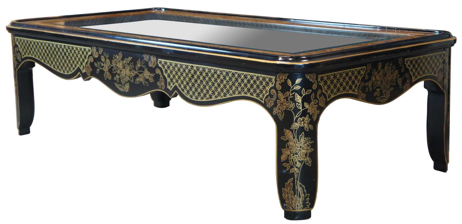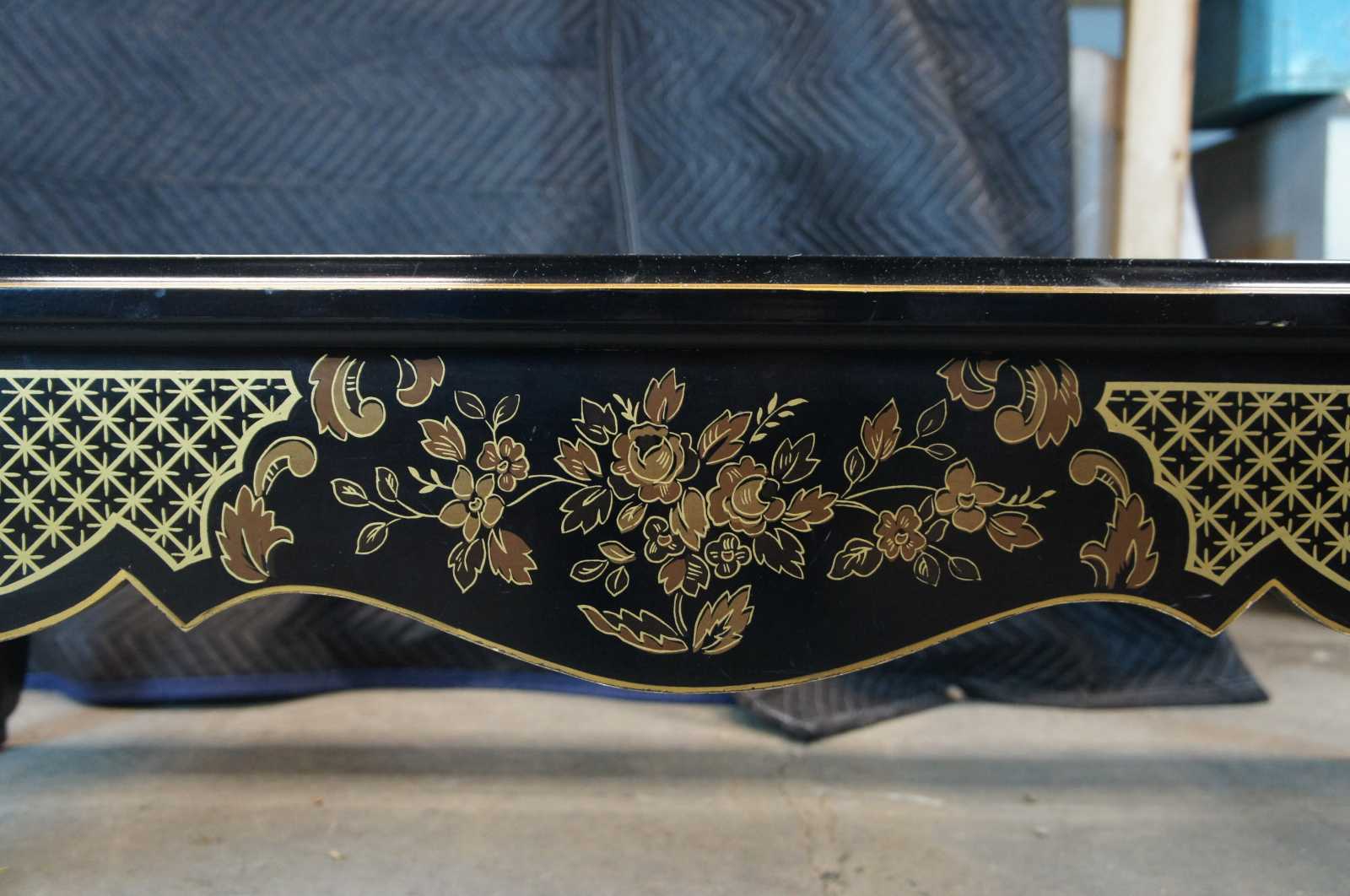 Drexel Heritage Et Cetera coffee table, circa 1980s. Features rectangular Hollywood Regency form with Chinoiserie japanned (black lacquer) hand painted motif with gold detail of florals / flowers, lattice designs and ashwood burled edge with beveled glass.