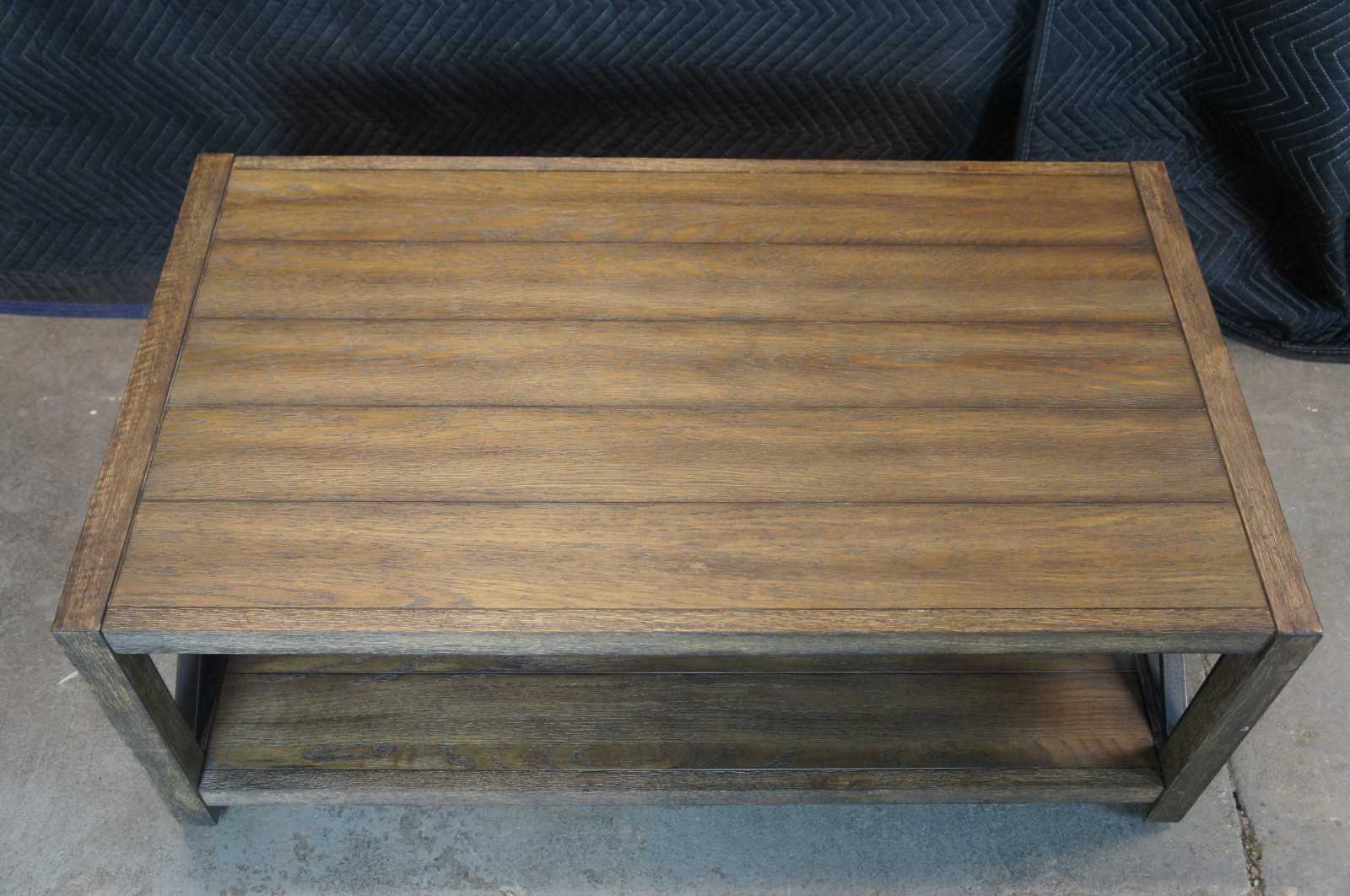 La Z boy Hammary Synthesis collection rectangular metal and oak coffee table, circa 2019.