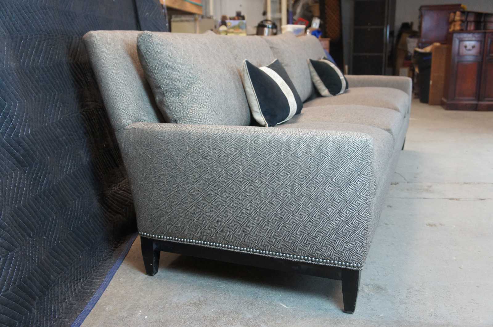 Arhaus Furniture Camden Collection four seat sofa or couch. Features Arhaus's Bench Crafted Upholstery, a gray tweed style fabric with a geometric repeating pattern, accented with nailhead trim and tapered feet.