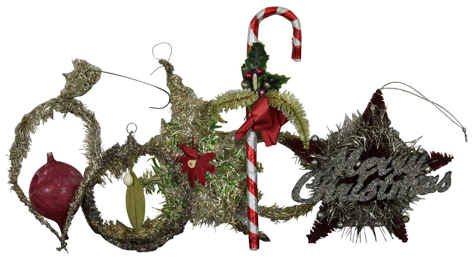 Set of eleven vintage chenille and tinsel pipe cleaner Christmas tree ornaments featuring santas, candy canes, merry Christmas star and tinsels.