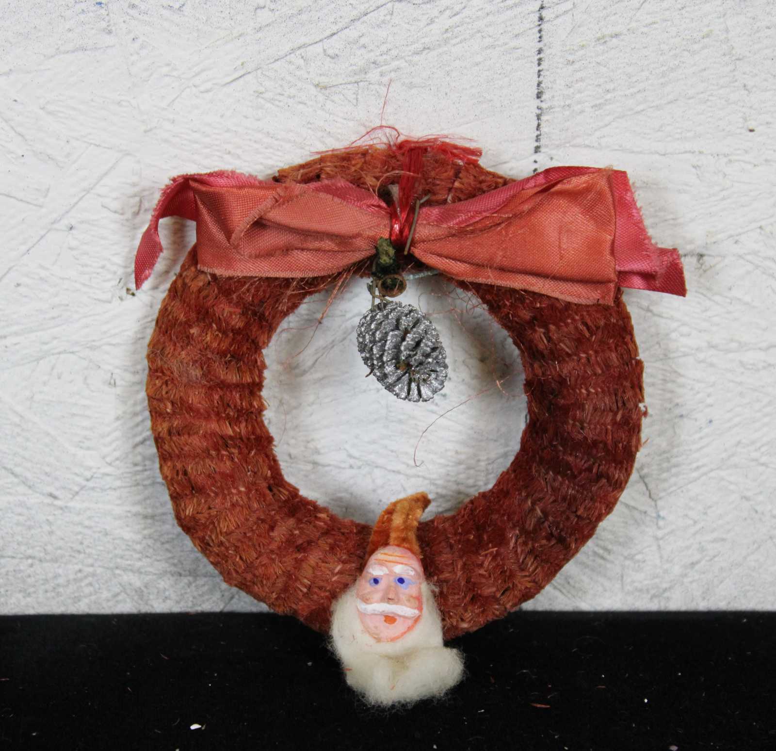 Lot of seven assorted folk art bottle brush Christmas wreaths decorated with snow, ornaments and bows.