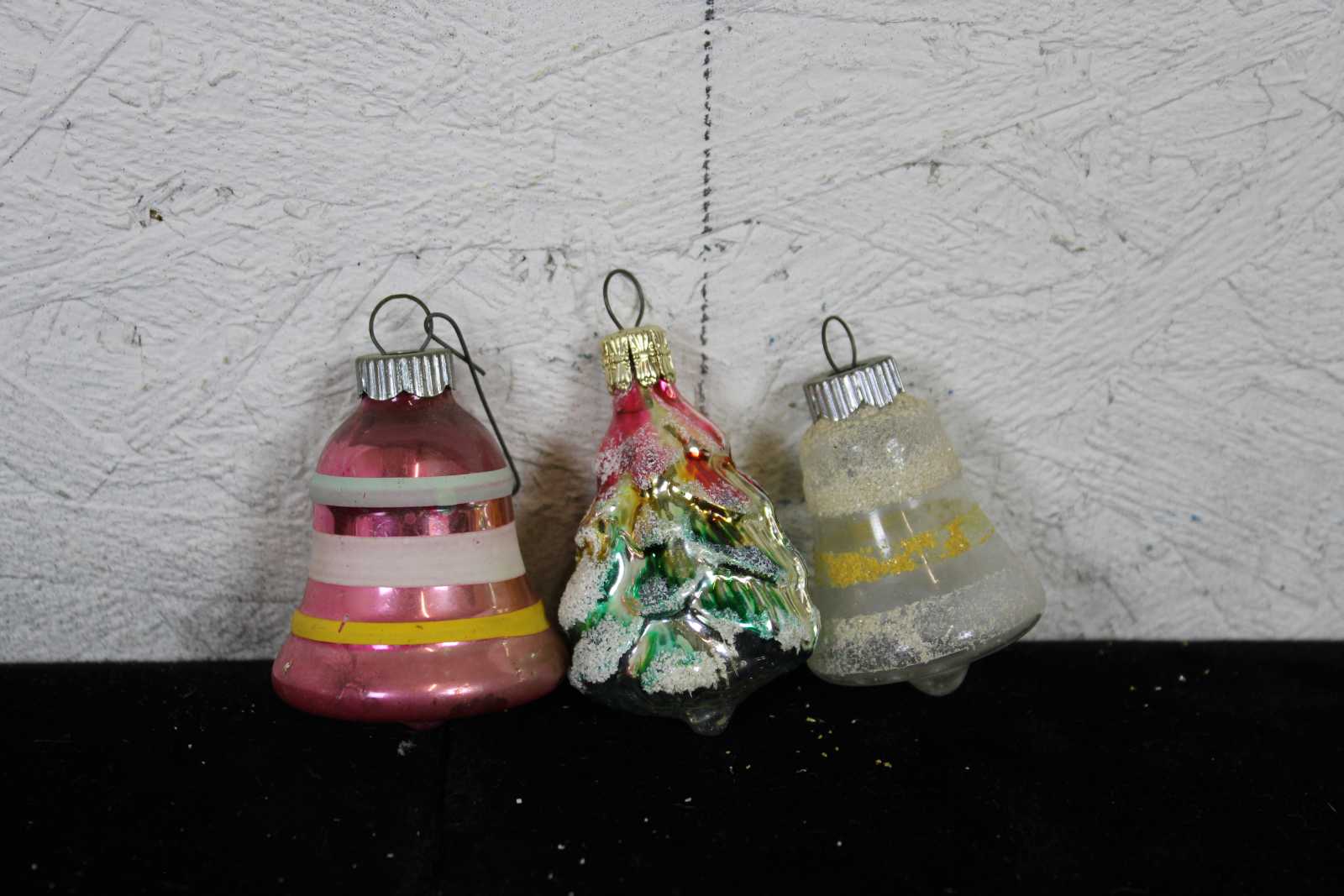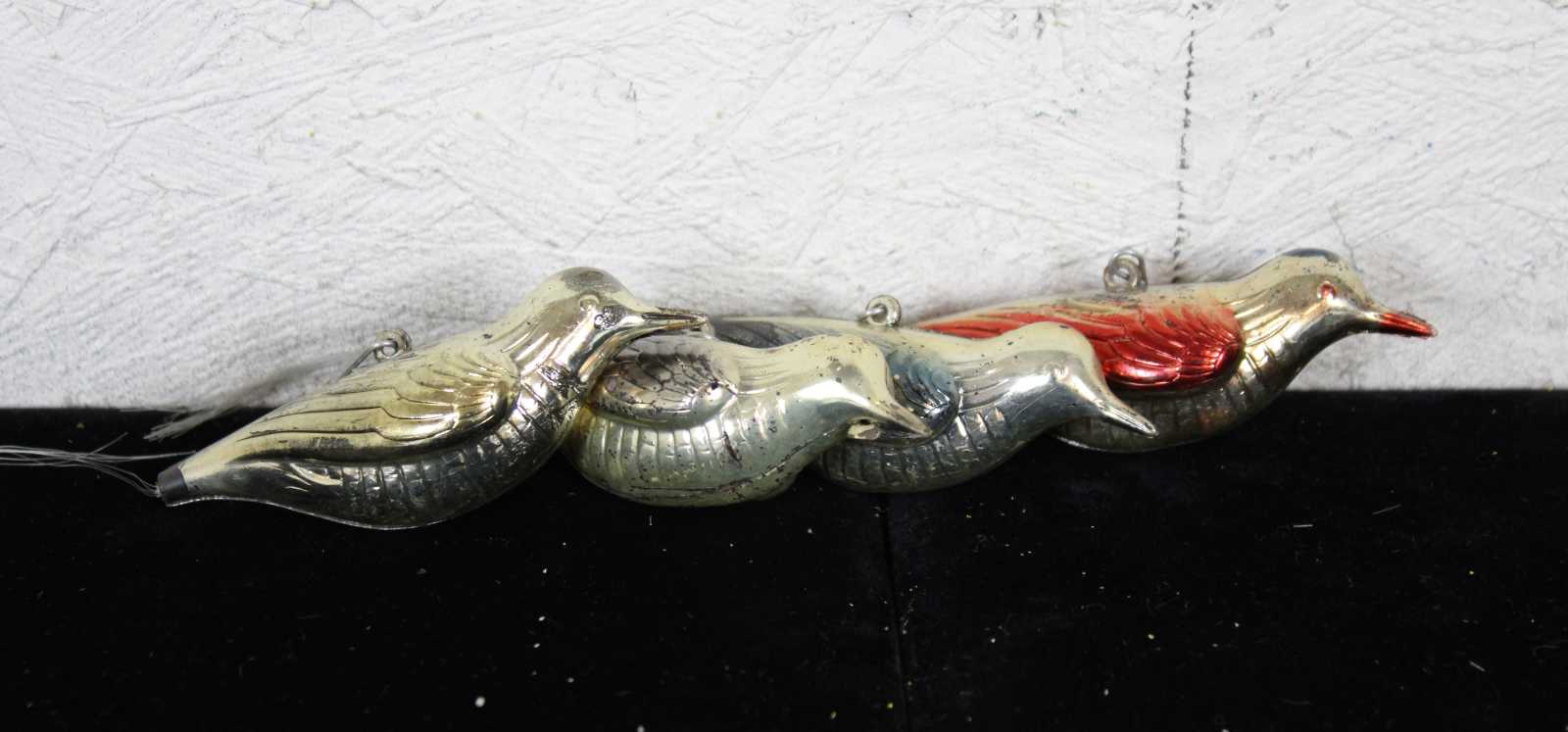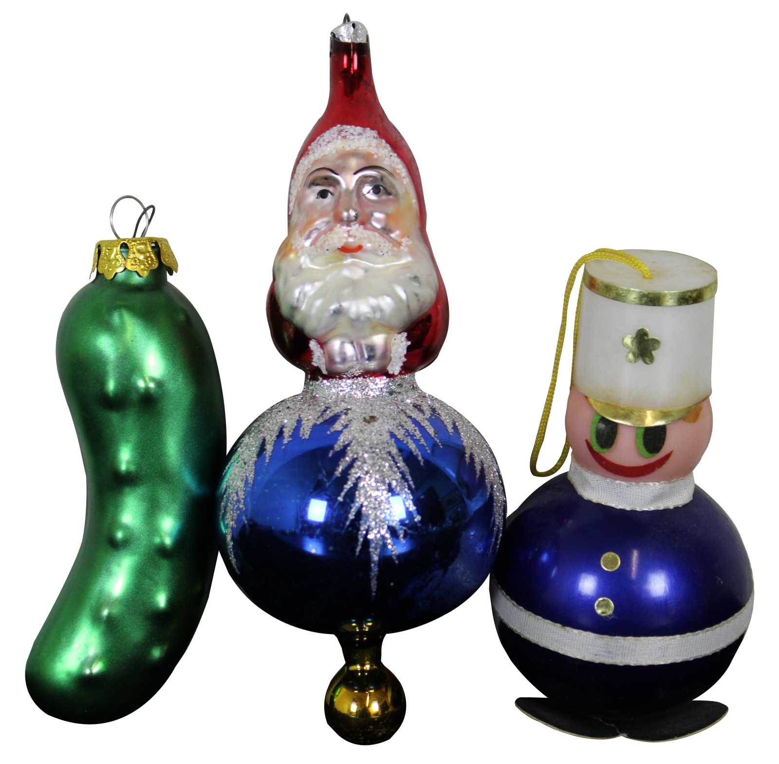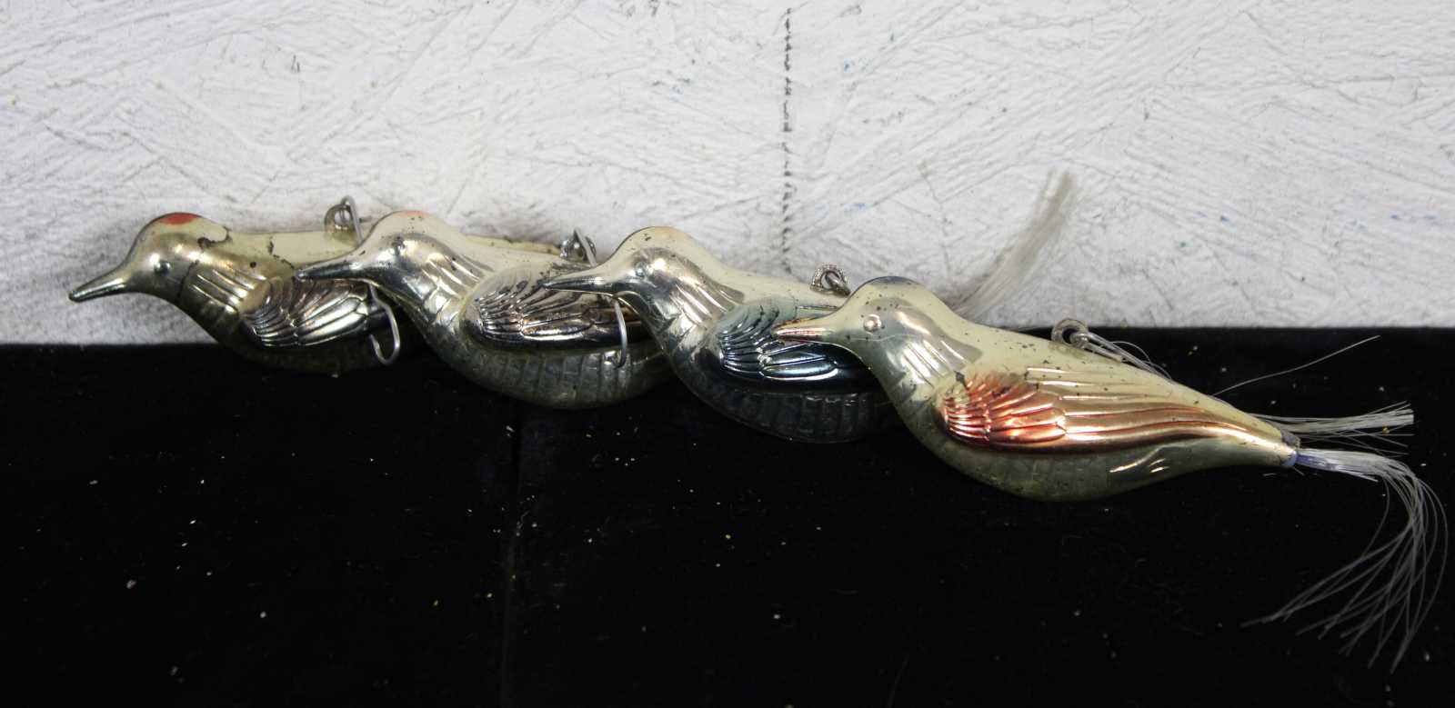Lot of 35 rare assorted antique German mercury glass hanging Christmas ornaments. Featuring multiple Kugel or ball like ornaments in the shapes of a cucumber or pickle, santa on a bulb, nutcracker bulb, tear drops, an acorn, trees, bell shapes, snowflake, a bear, radko clown on bulb, a rooster and multiple birds.