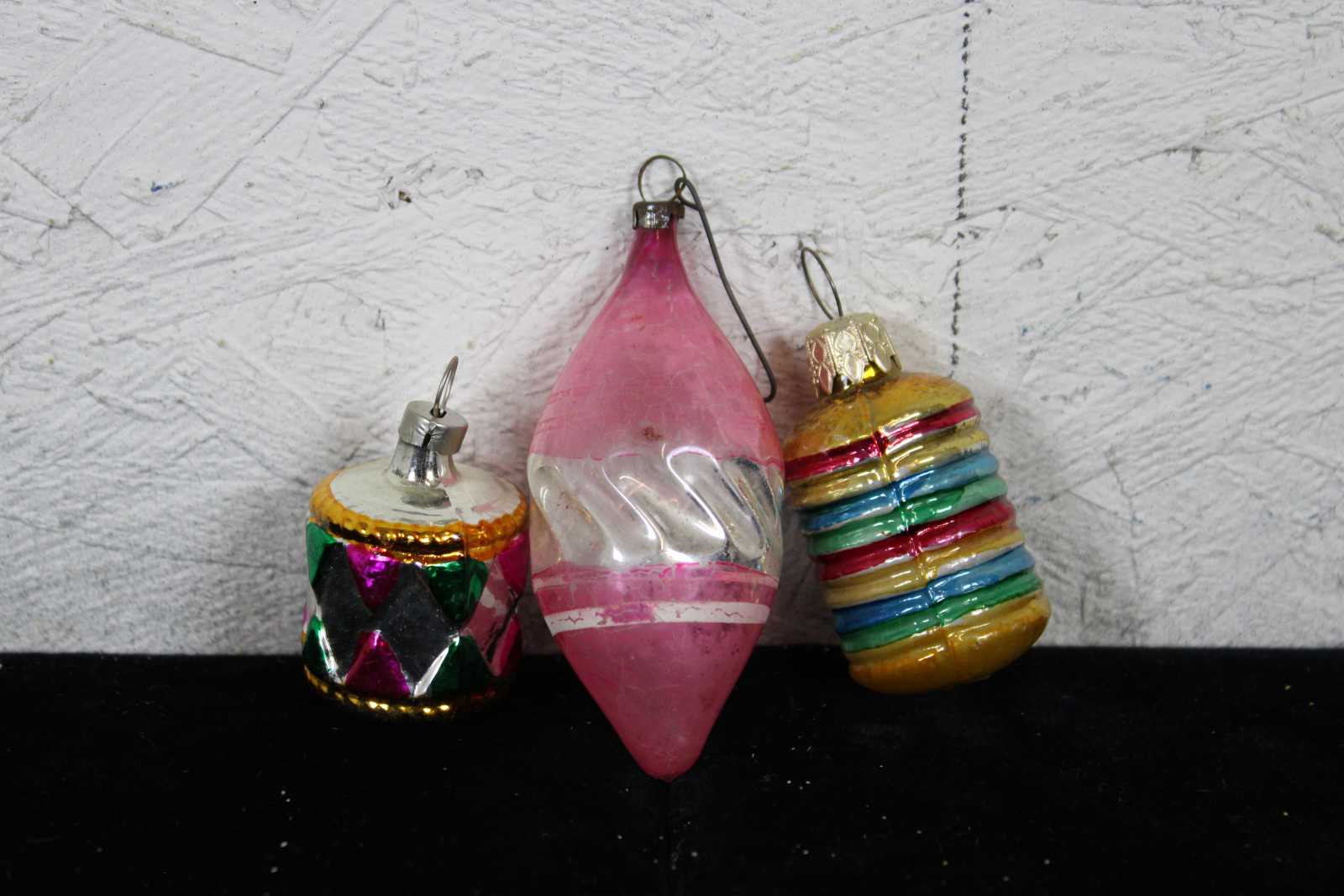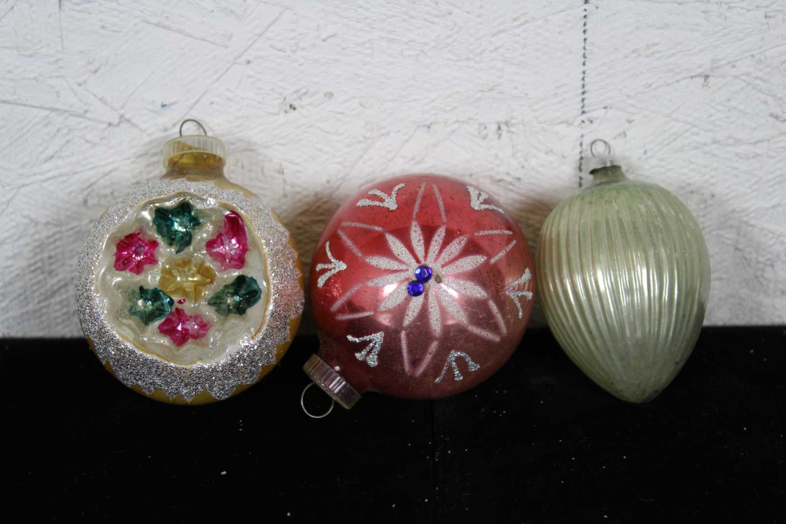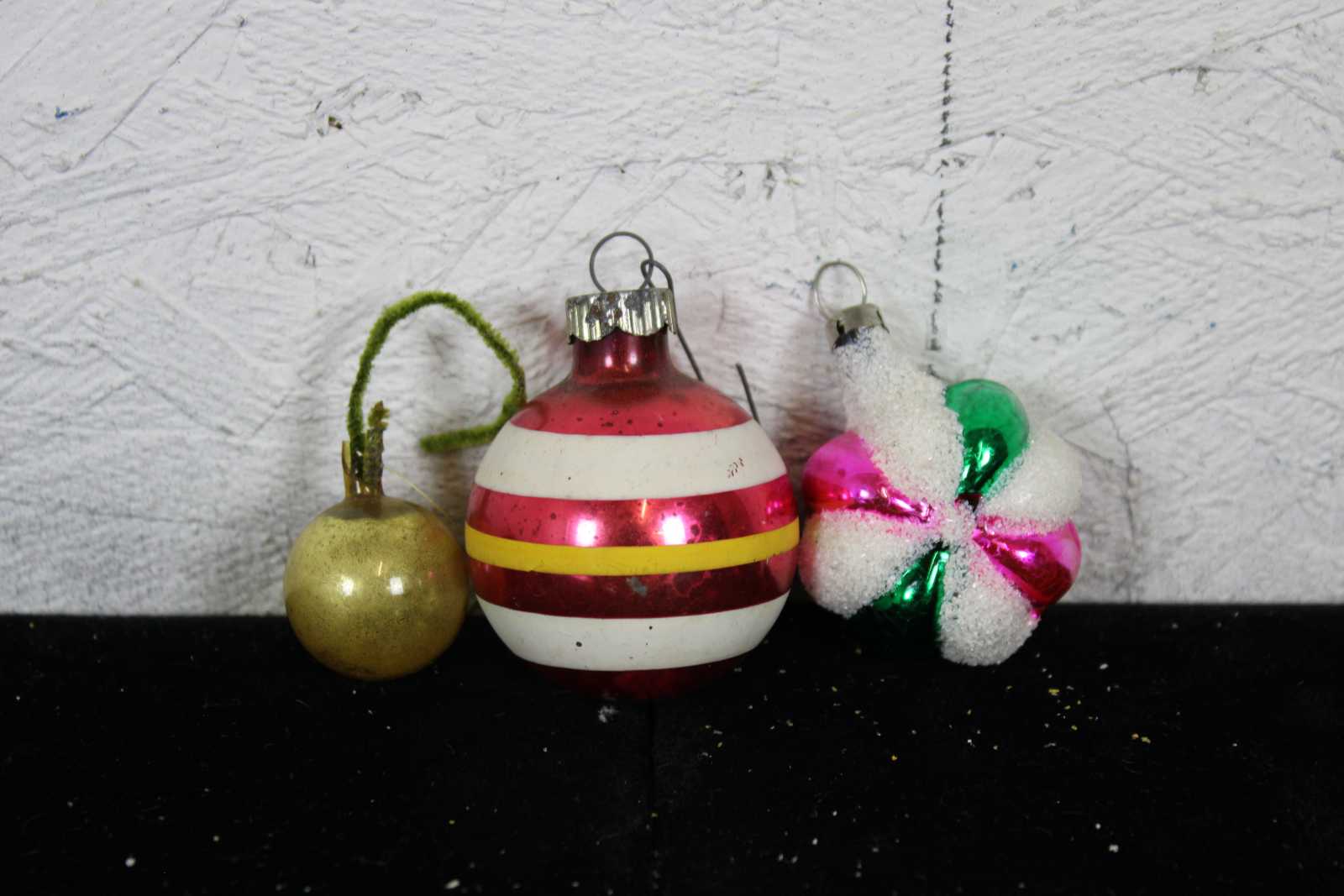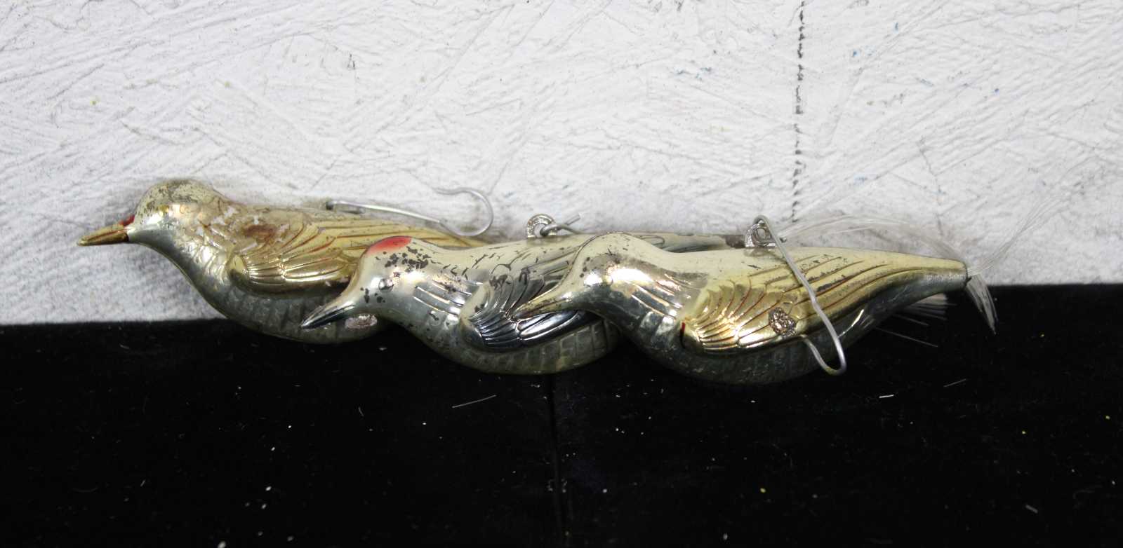 Lot of 35 rare assorted antique German mercury glass hanging Christmas ornaments. Featuring multiple Kugel or ball like ornaments in the shapes of a cucumber or pickle, santa on a bulb, nutcracker bulb, tear drops, an acorn, trees, bell shapes, snowflake, a bear, radko clown on bulb, a rooster and multiple birds.