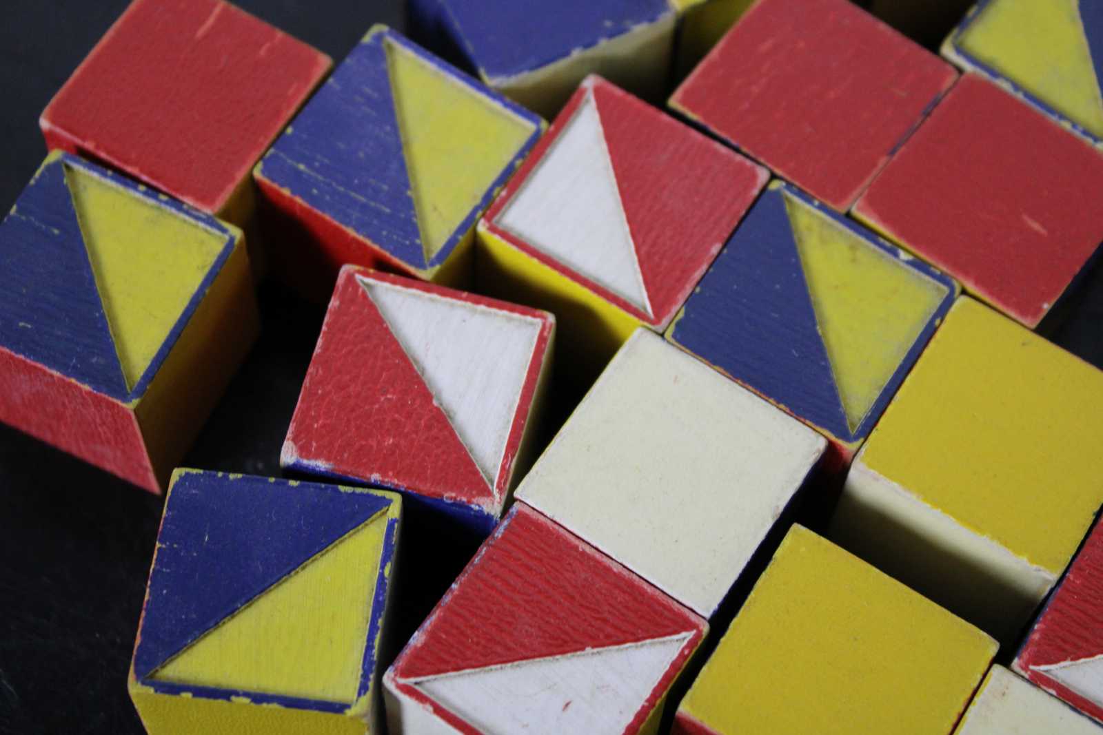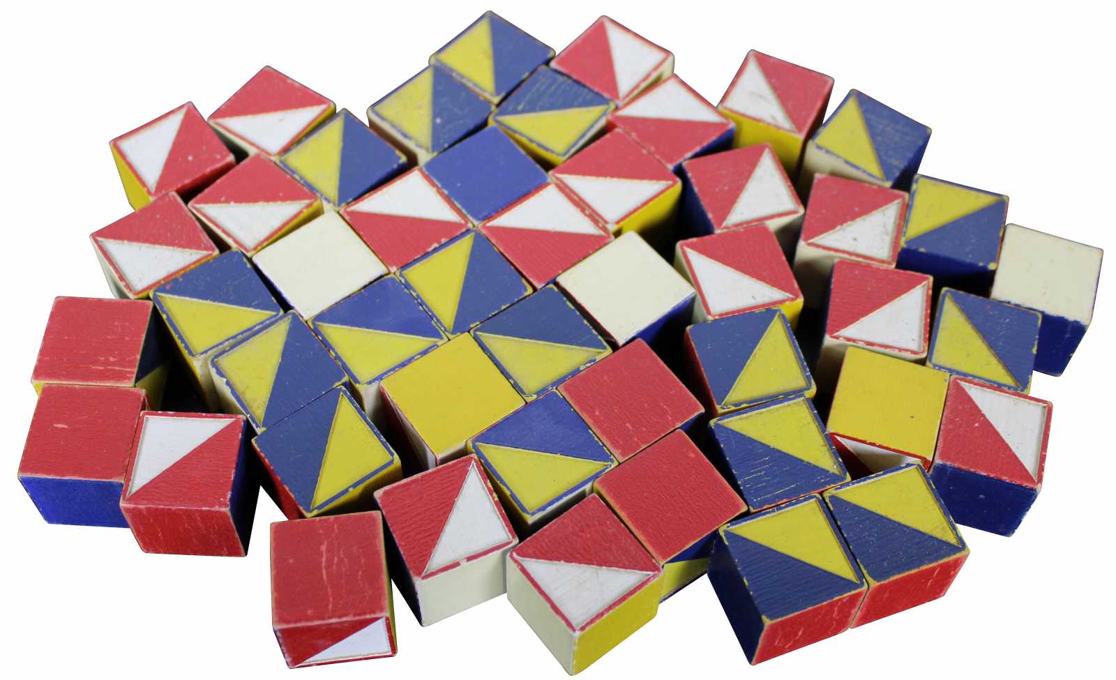 Forty seven wooden blocks for building or pattern making, painted with red, blue, yellow and white geometric halves. Color cubes teach designing initiative colors, concentration symetry observation patience, made by the embossing compnay of Albany New York. No 12.