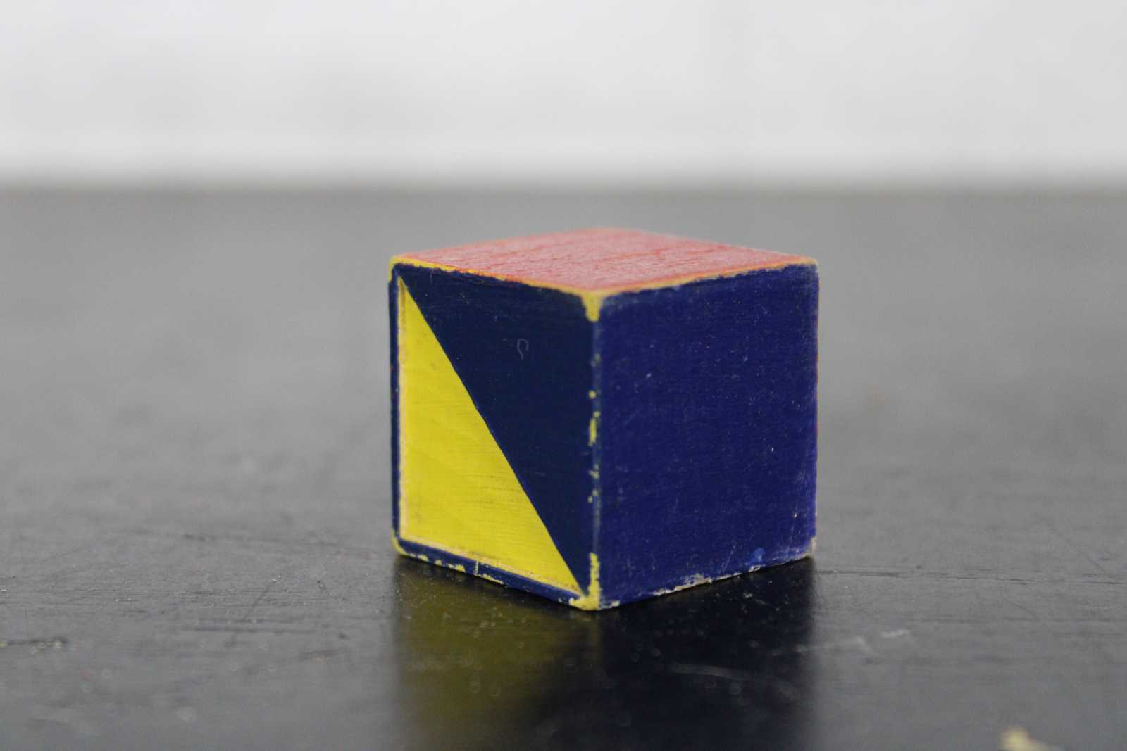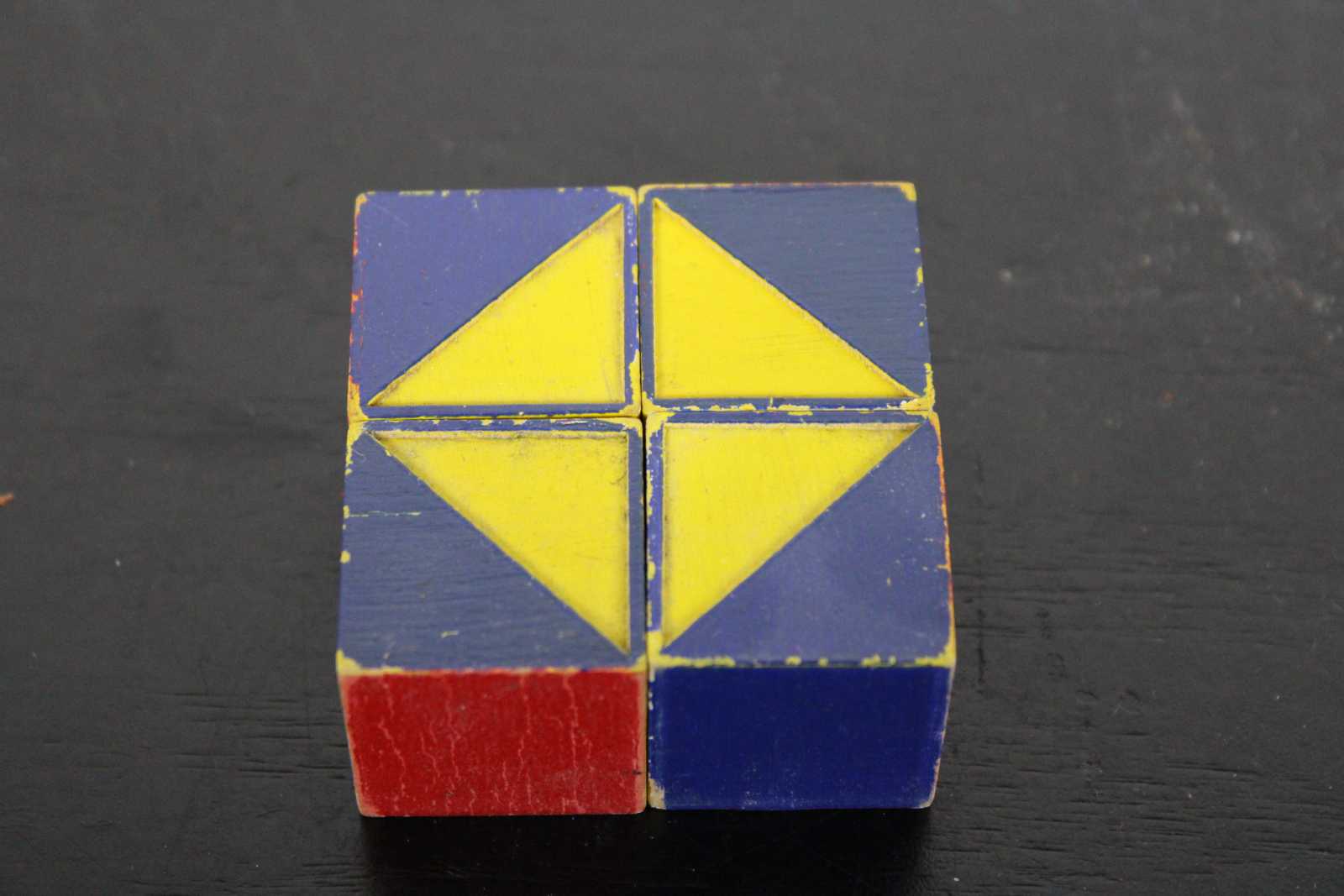Fair condition, wear and distressing from use, paint loss, missing two cubes, no box cover.