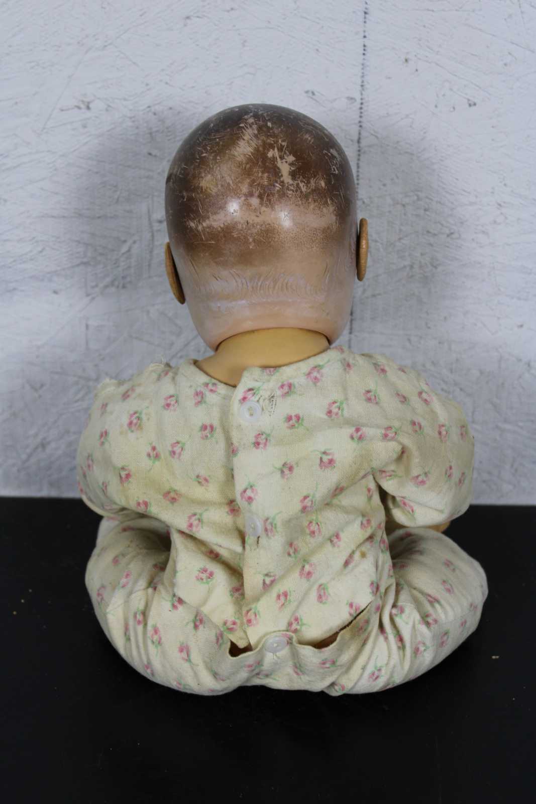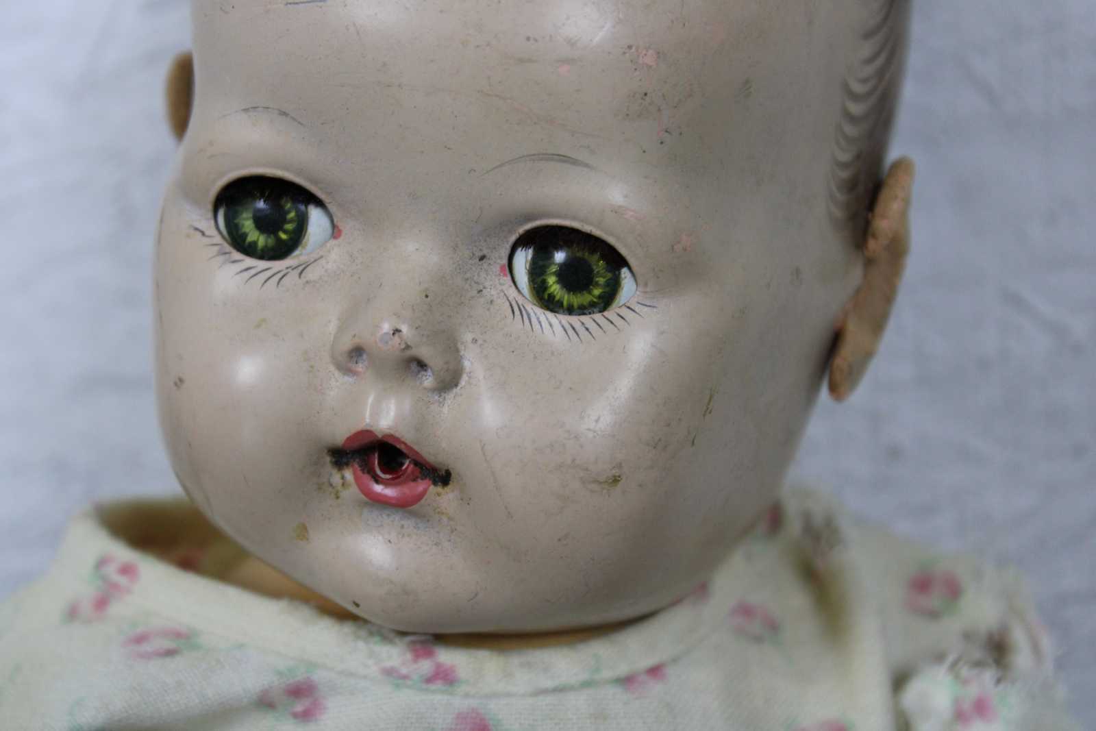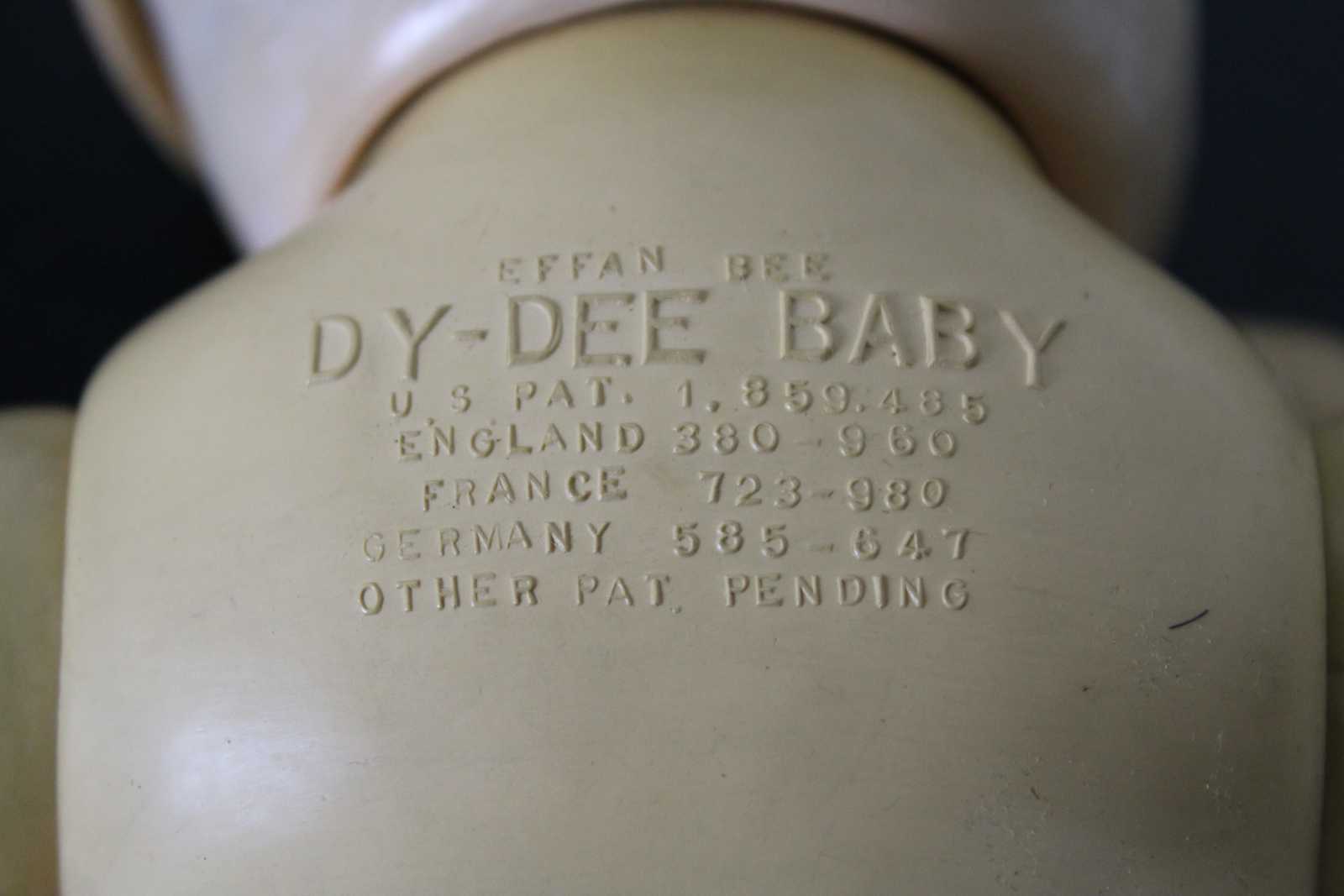 Antique Effanbee Dy-Dee baby doll with molded hair, green sleep eyes, articulated limbs, and dressed in flannel pajamas. “1933-1950s Effanbee Dy-Dee Baby doll, earliest dolls are made with a hard rubber head, later dolls were made of hard plastic, blue, brown or green sleep eyes, real upper lashes, single stroke brows, painted lower lashes, open mouth, applied soft rubber ears, molded painted hair, soft rubber body jointed at the neck, arms and hips, First drink and wet baby doll, came dressed in cotton flannel diaper, doll marked on back DyDee Baby U.S. Pat. 1-857-485 England-880-060 France-723-980 Germany-585-647 Other Pat. Pending.”