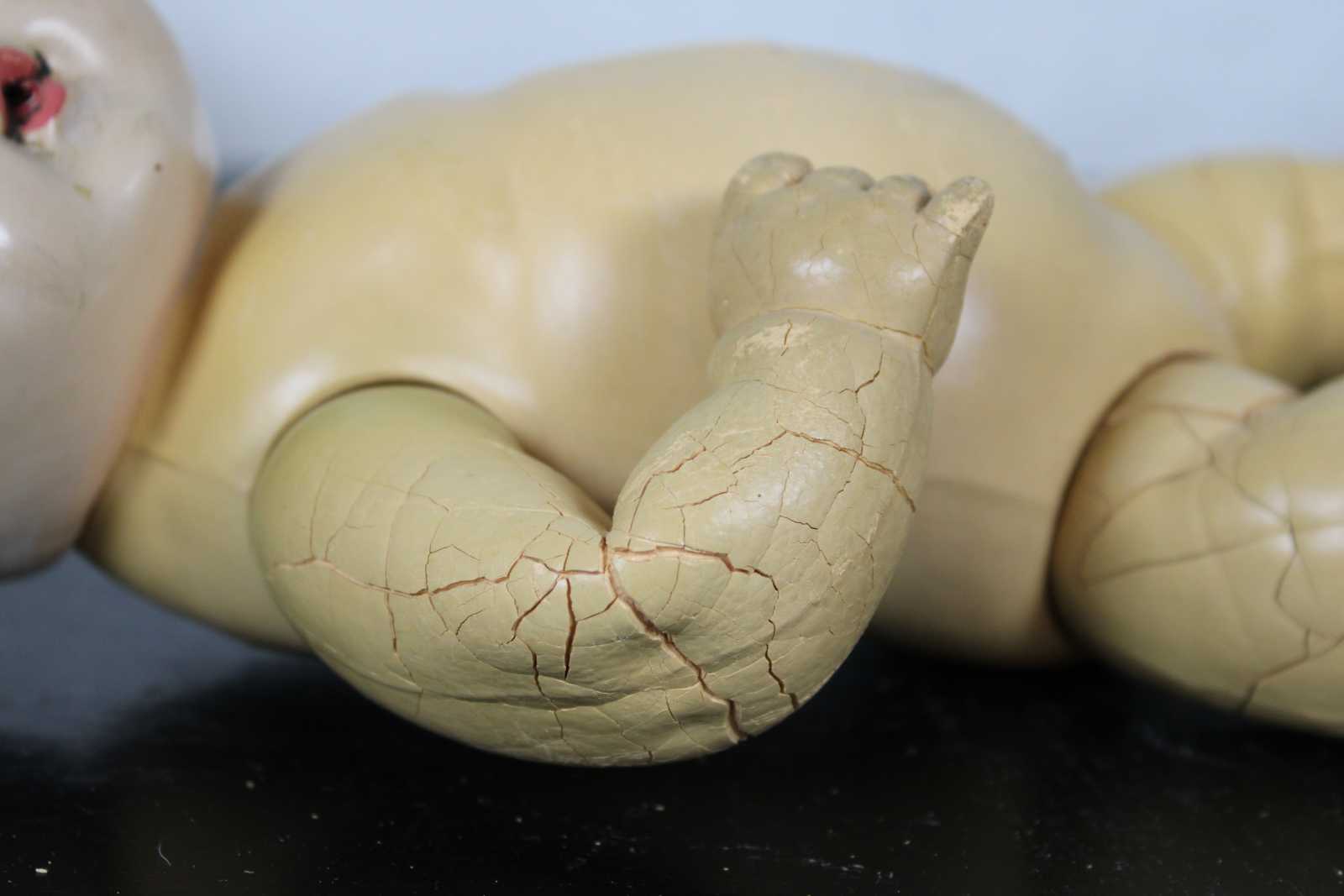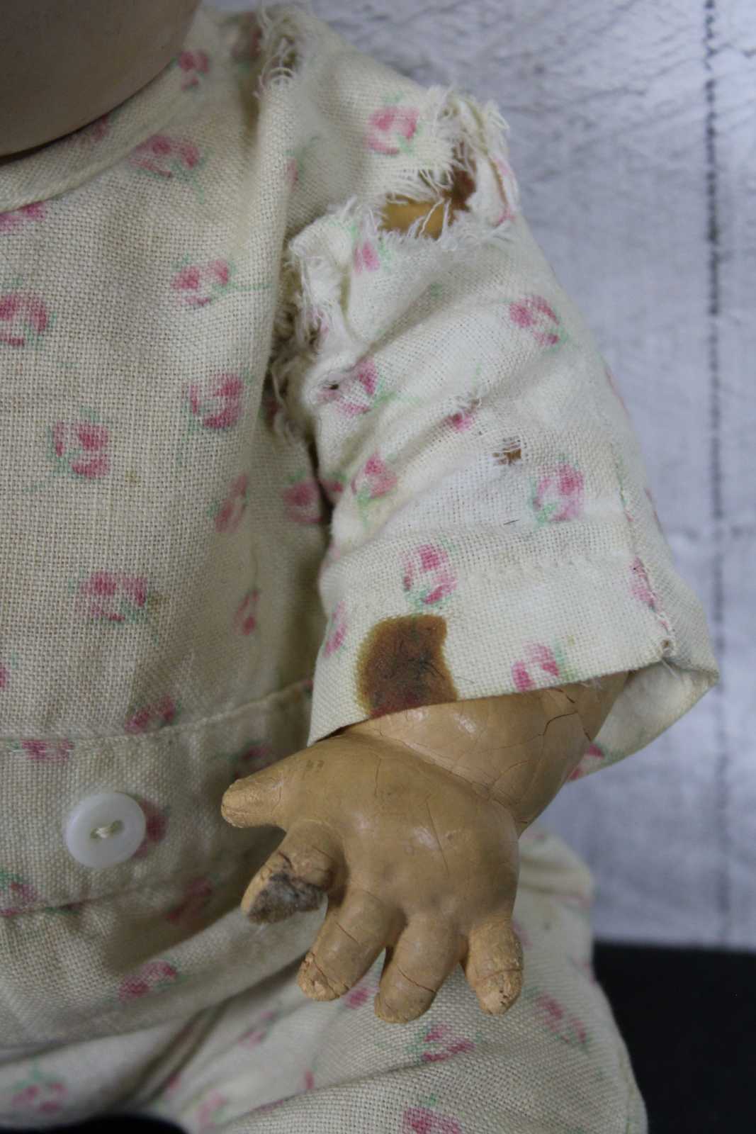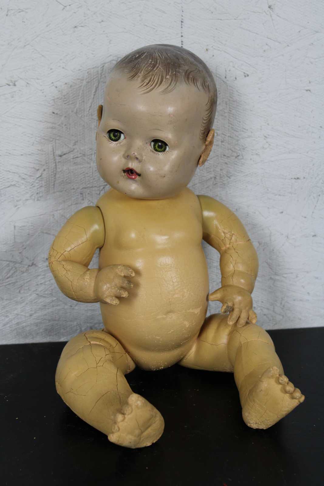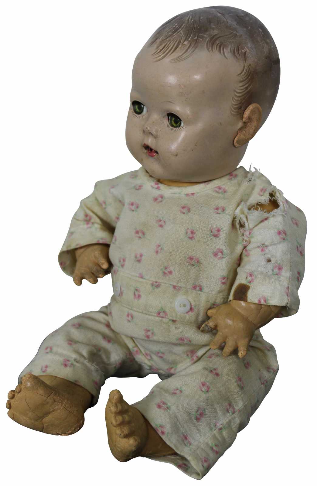 Antique Effanbee Dy-Dee baby doll with molded hair, green sleep eyes, articulated limbs, and dressed in flannel pajamas. “1933-1950s Effanbee Dy-Dee Baby doll, earliest dolls are made with a hard rubber head, later dolls were made of hard plastic, blue, brown or green sleep eyes, real upper lashes, single stroke brows, painted lower lashes, open mouth, applied soft rubber ears, molded painted hair, soft rubber body jointed at the neck, arms and hips, First drink and wet baby doll, came dressed in cotton flannel diaper, doll marked on back DyDee Baby U.S. Pat. 1-857-485 England-880-060 France-723-980 Germany-585-647 Other Pat. Pending.”