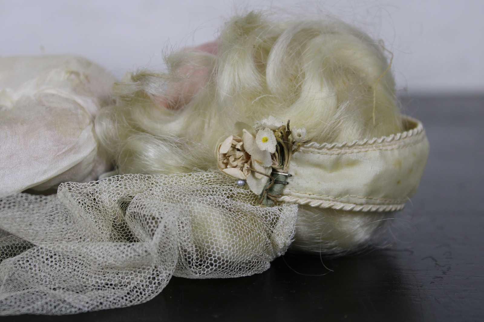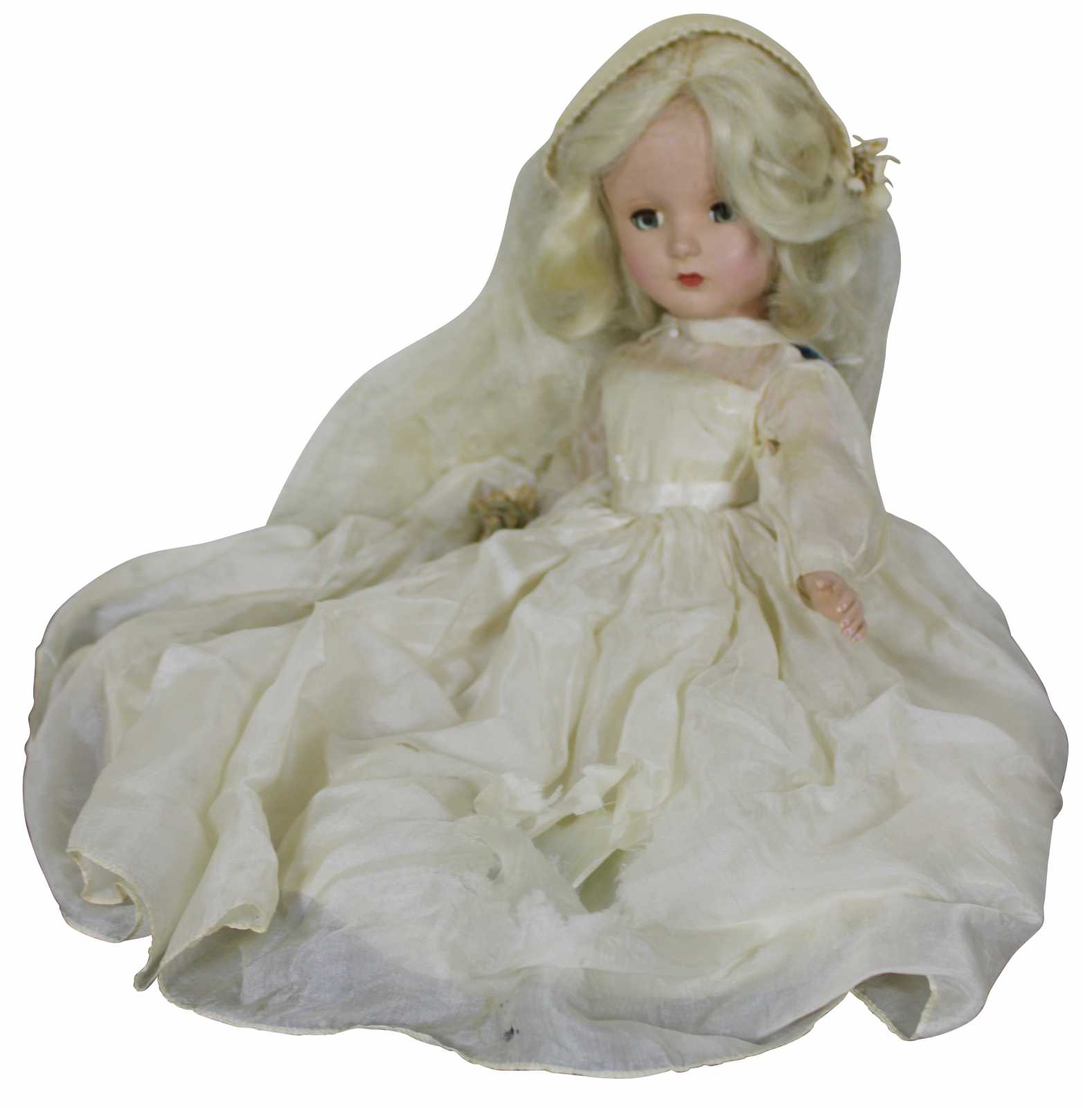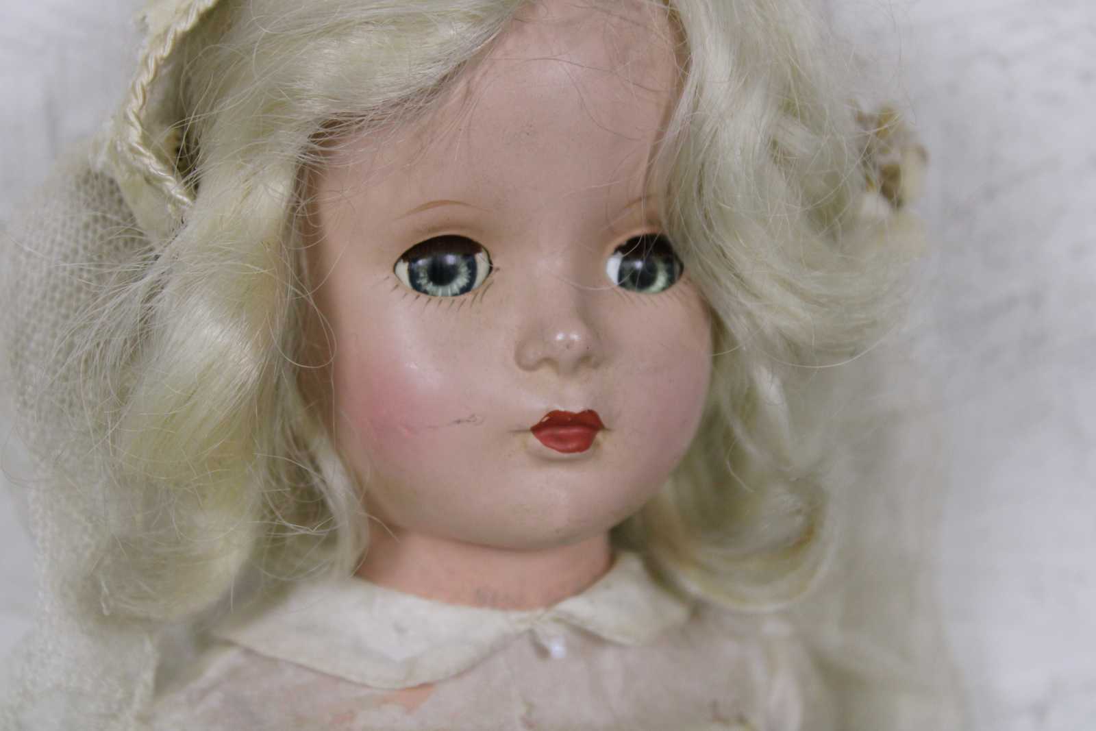 Vintage mid century Madame Alexander doll dressed as a bride with blonde hair, blue, sleep eyes, a cap veil and long sleeved chiffon gown.